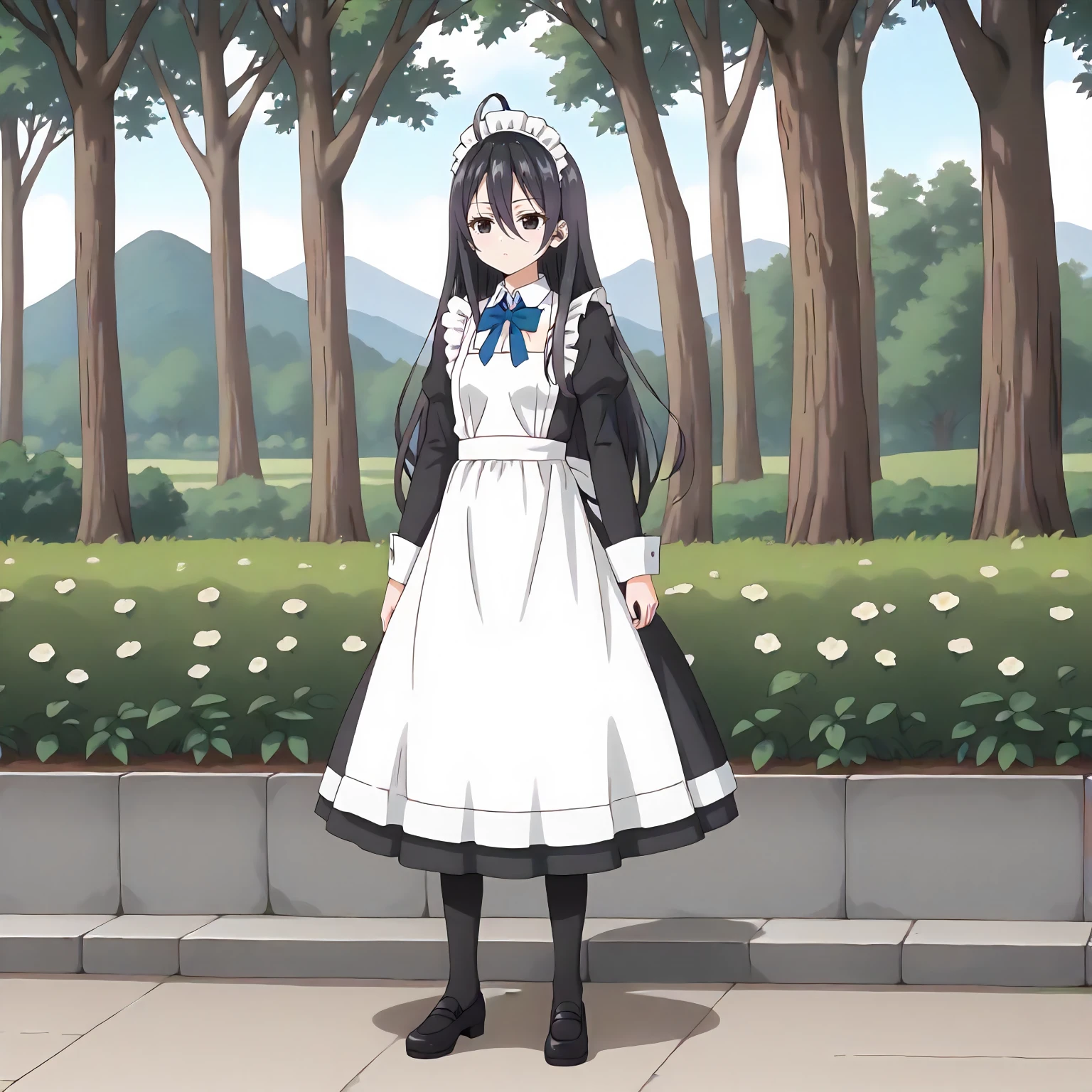 maid headdress, maid,very long_dress,long_sleeves,blue bow tie,white apron, black_pantyhose,