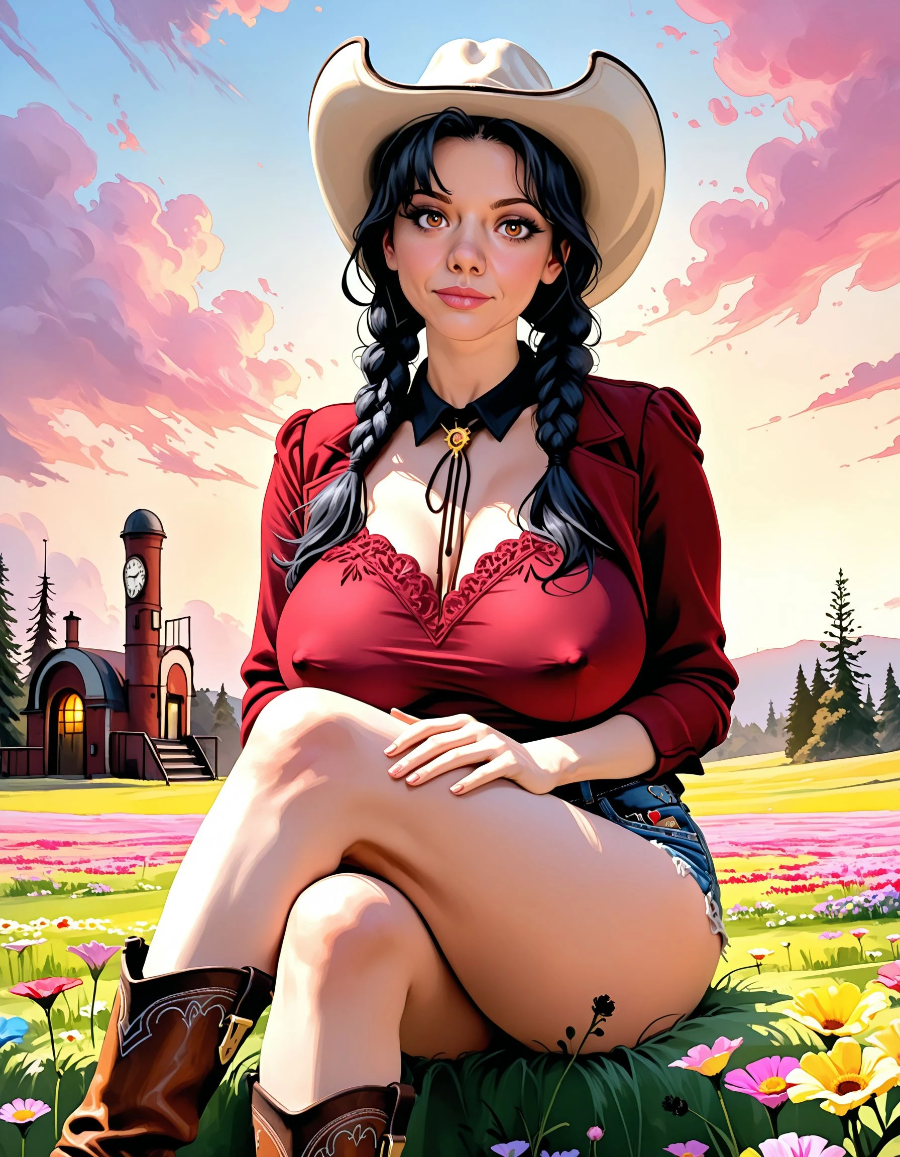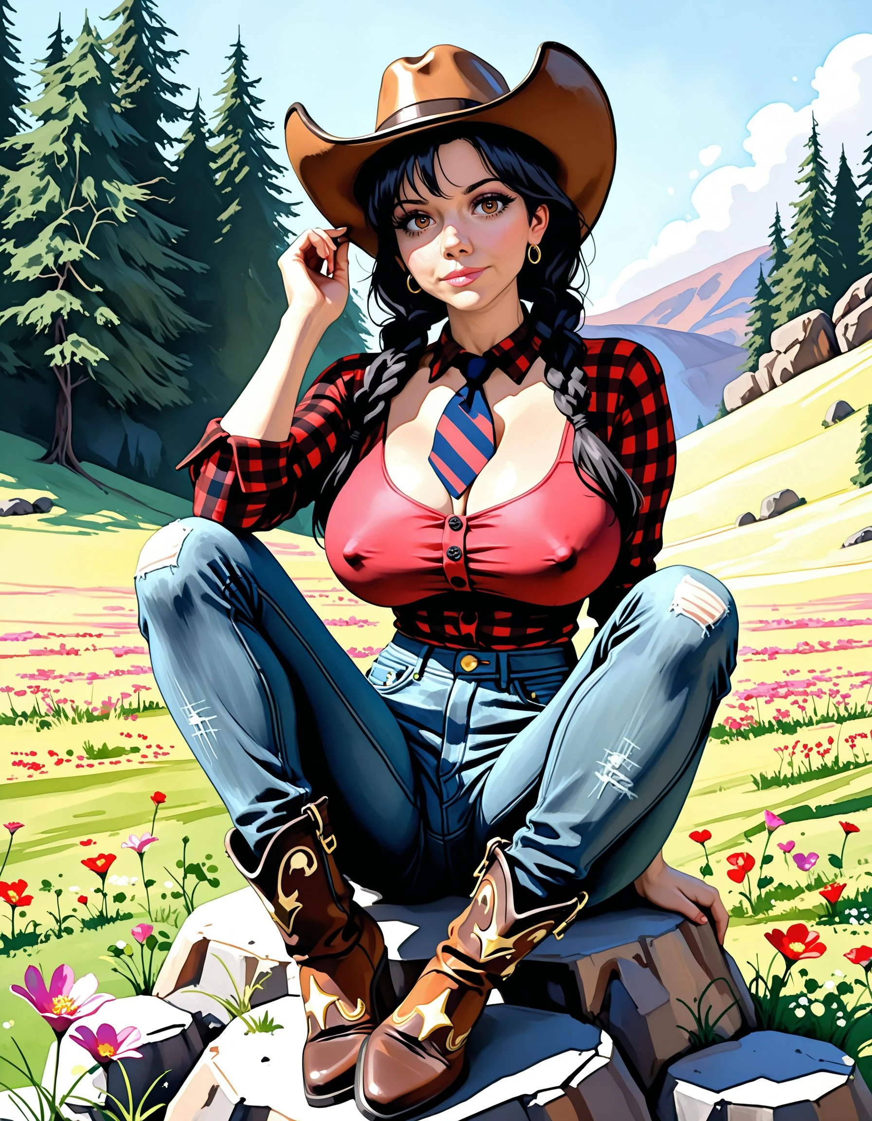 Her thick chestnut hair cascades over her shoulders in soft waves, framing a face adorned with piercing, mischievous eyes that gleam with unspoken desires. Her full lips, always slightly parted, seem ready to whisper forbidden fantasies or play with the imagination of anyone who dares to get close.
