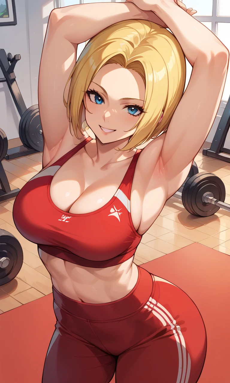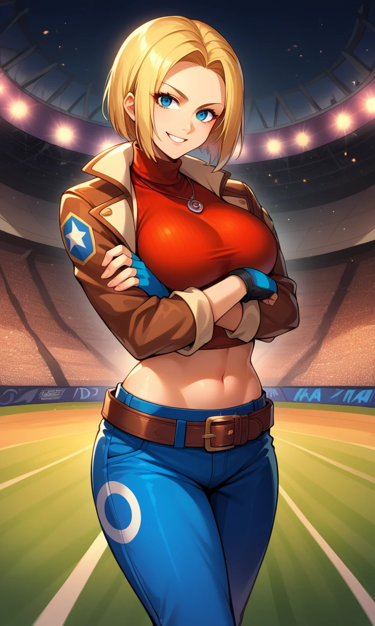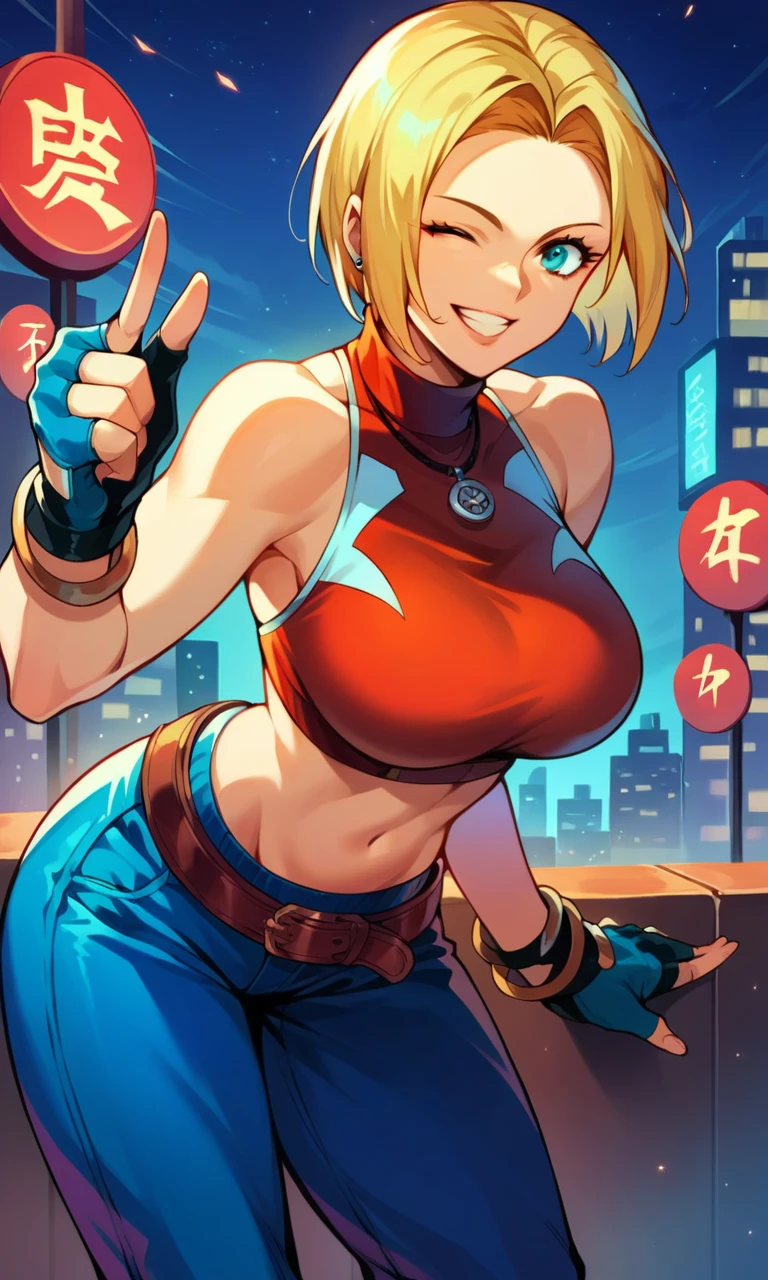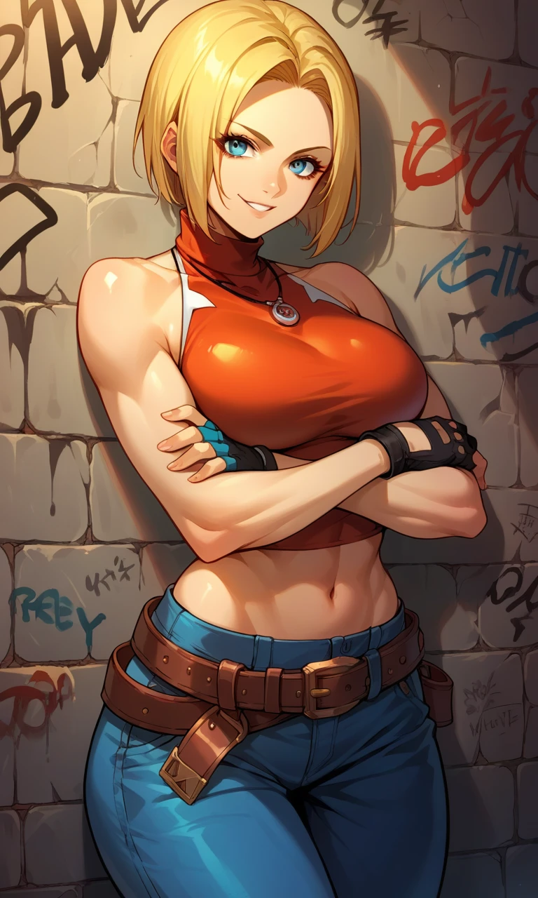 "BlueMary, short hair, blue eyes,pants, crop top, turtleneck, belt, large breasts, necklace,fingerless gloves" for her default costume.