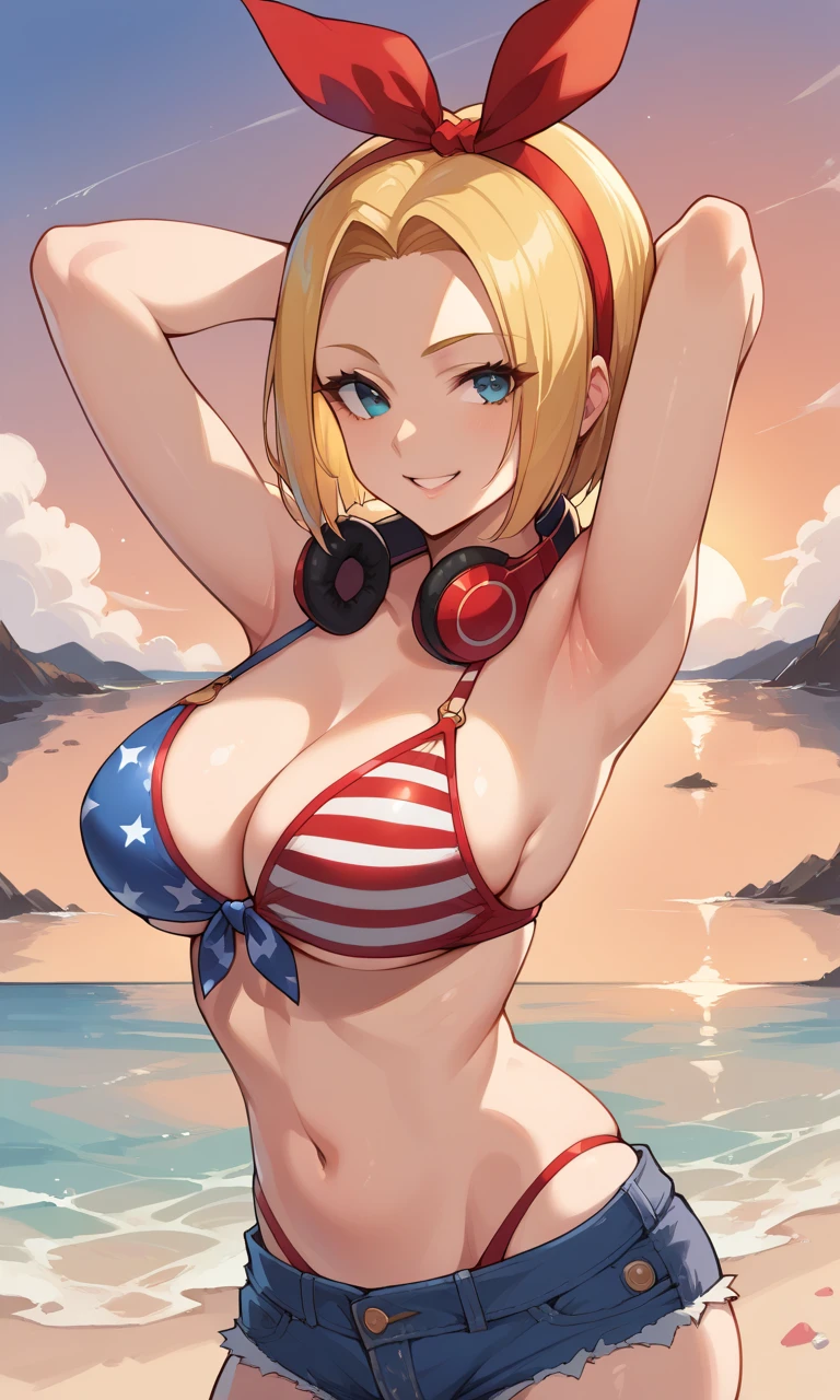BlueMaryAS, american flag bikini, hair ribbon, denim shorts, headphones around neck, large breasts
