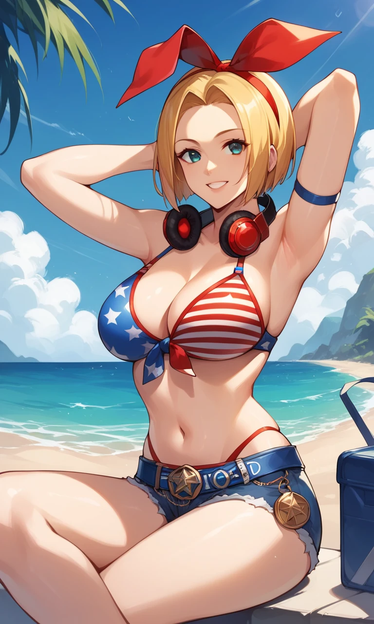 "BlueMaryAS, american flag bikini, hair ribbon, denim shorts, headphones around neck, large breasts" for her KOFAS swimsuit.