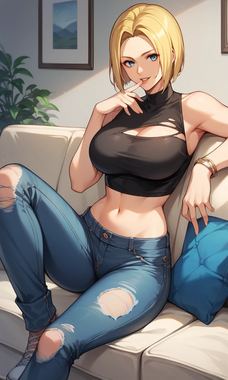 BlueMary, short hair, blue eyes,pants, crop top, turtleneck, belt, large breasts, necklace,fingerless gloves