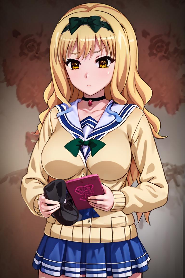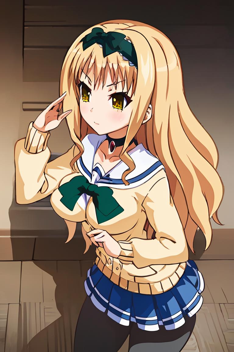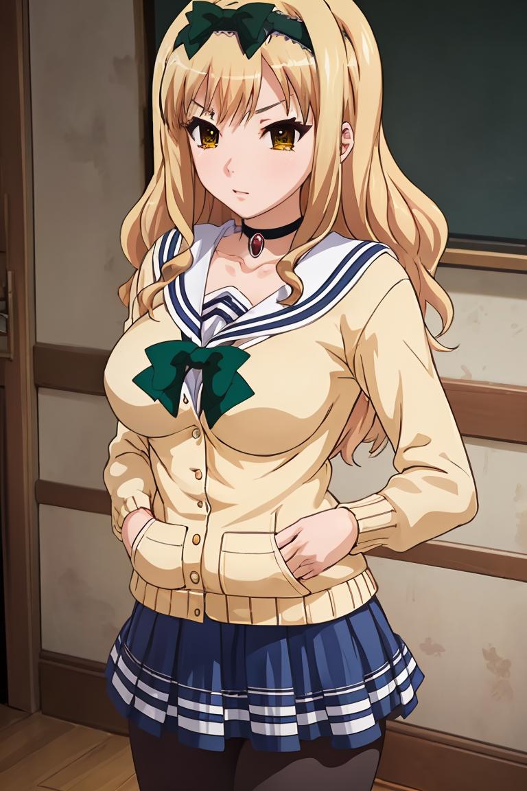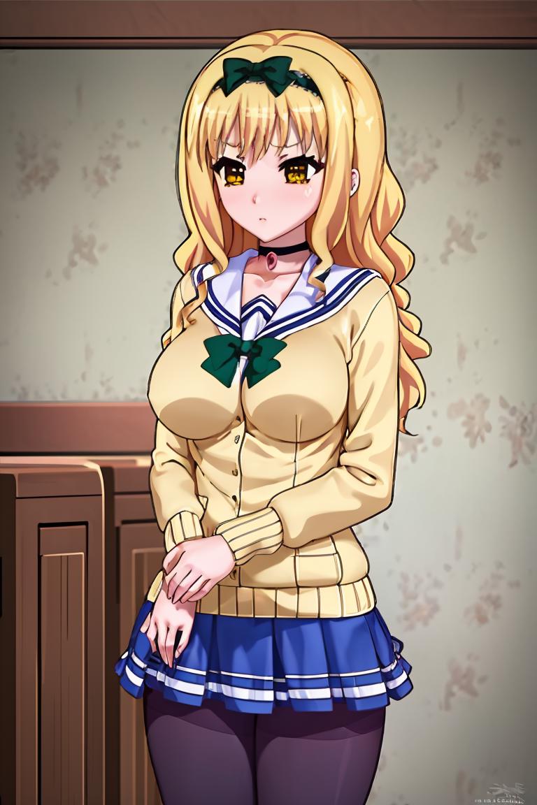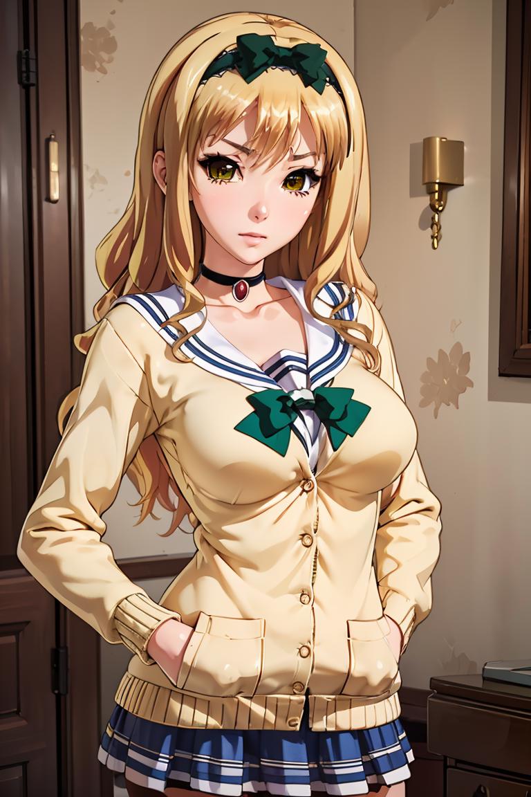 hairband, choker, school uniform, cardigan, bow, pleated skirt, pantyhose, loafers