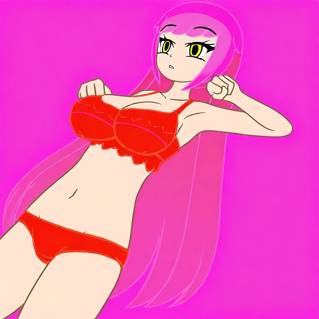 long hair, pink hair mixed with red, yellow eyes, pink and red bra, red panties with orange stripes, big breasts, giantess