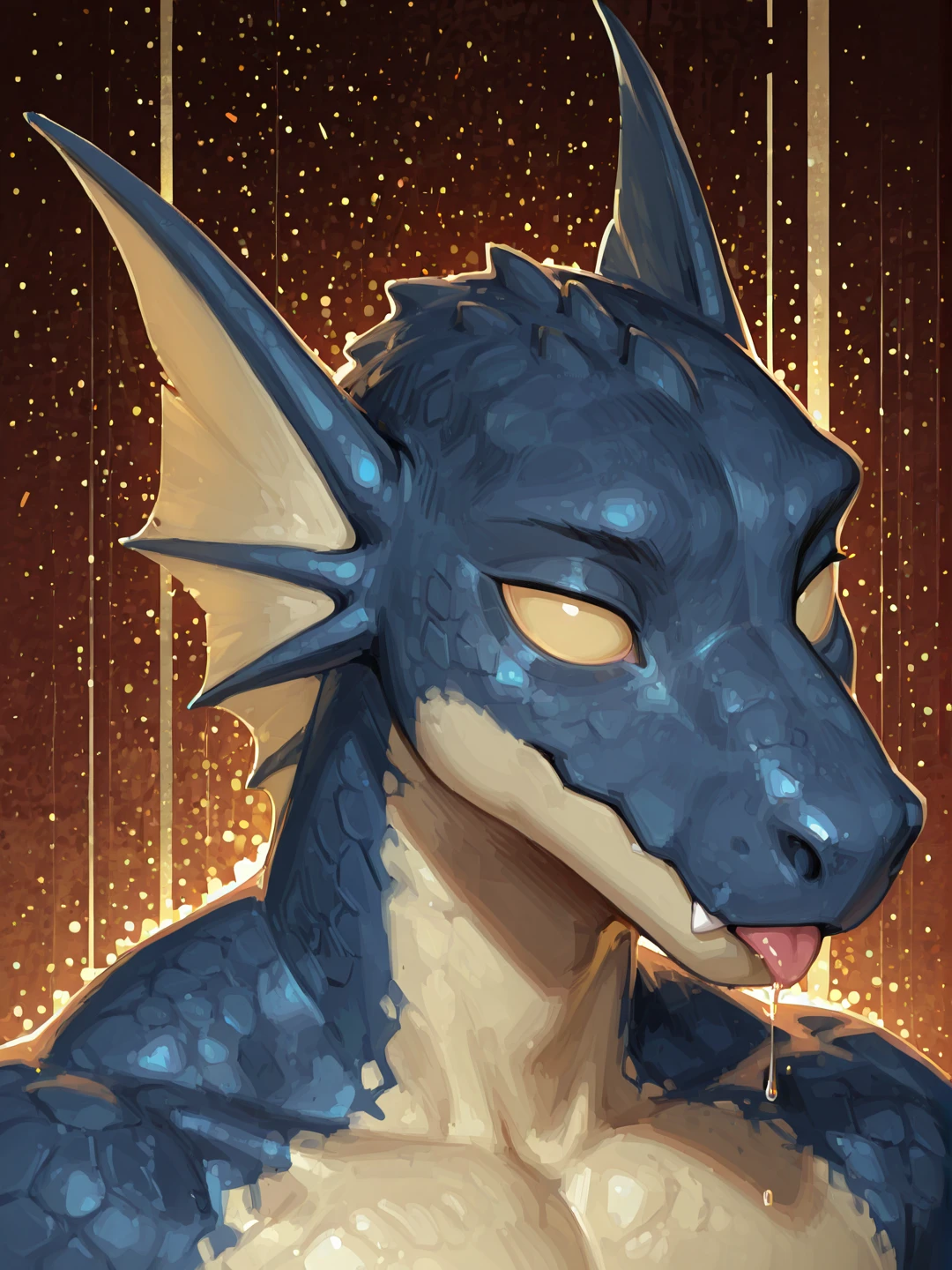 h0mm3l1z4rdm4n, male, blue scales, yellow scales, two-tone skin, head fins, solid eyes, yellow sclera, nostrils, sharp teeth, claws, tail, sharp toenails