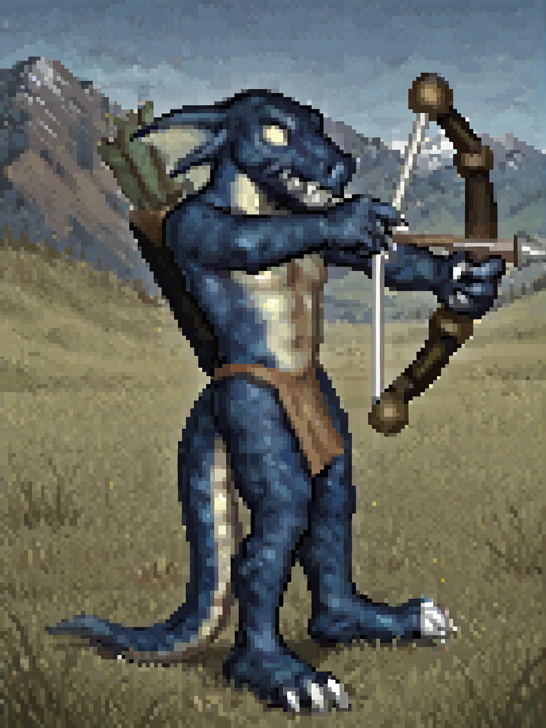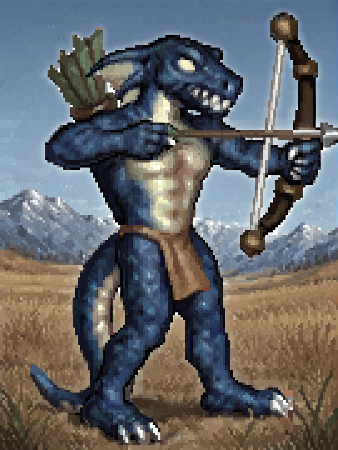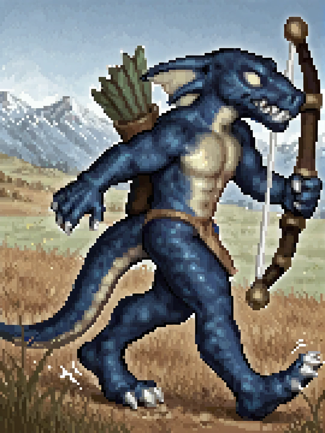 h0mm3l1z4rdm4n, male, blue scales, yellow scales, two-tone skin, head fins, solid eyes, yellow sclera, nostrils, sharp teeth, claws, tail, sharp toenailsloincloth, bow (weapon), quiverOTHER TRIGGERS: