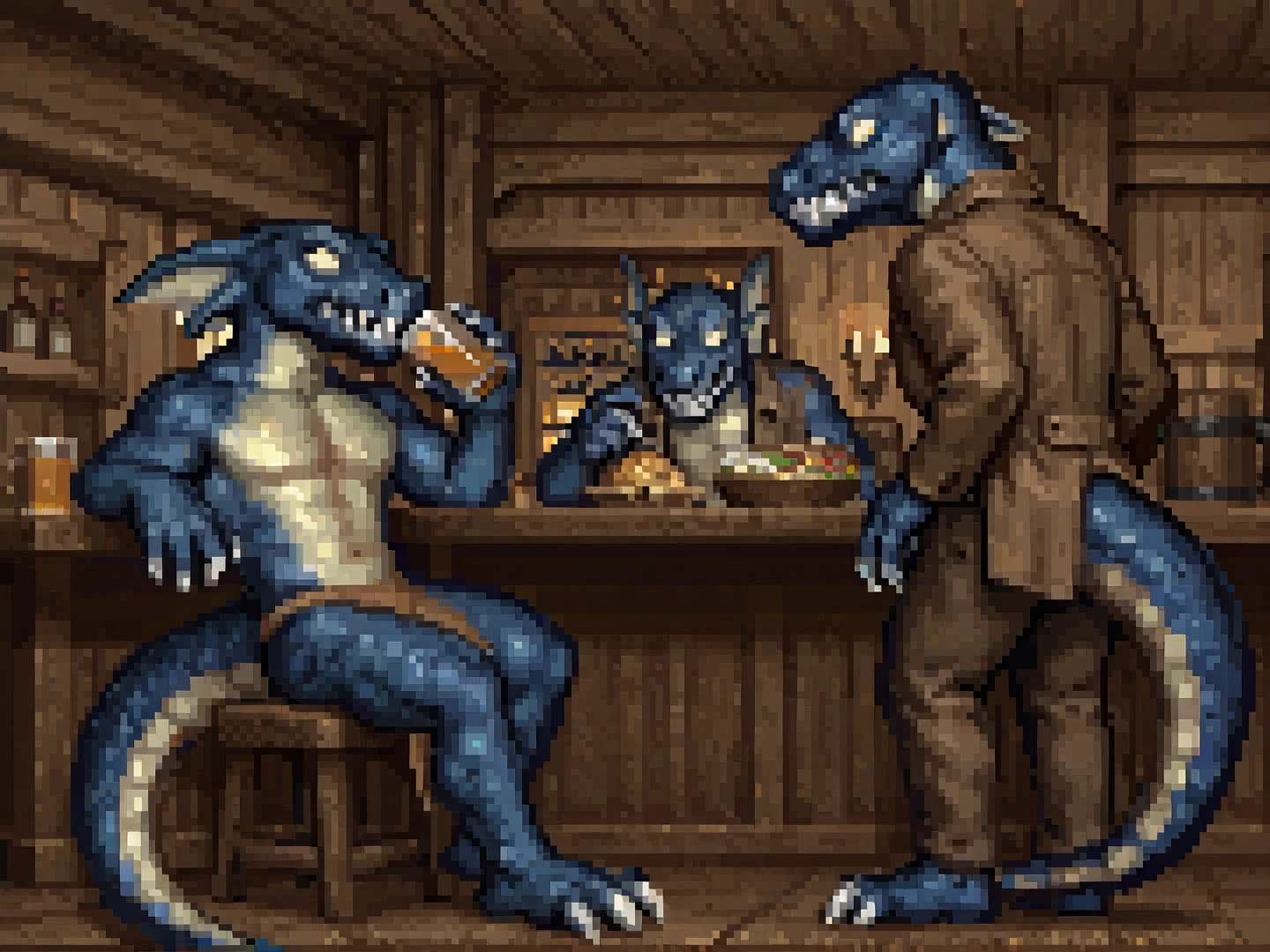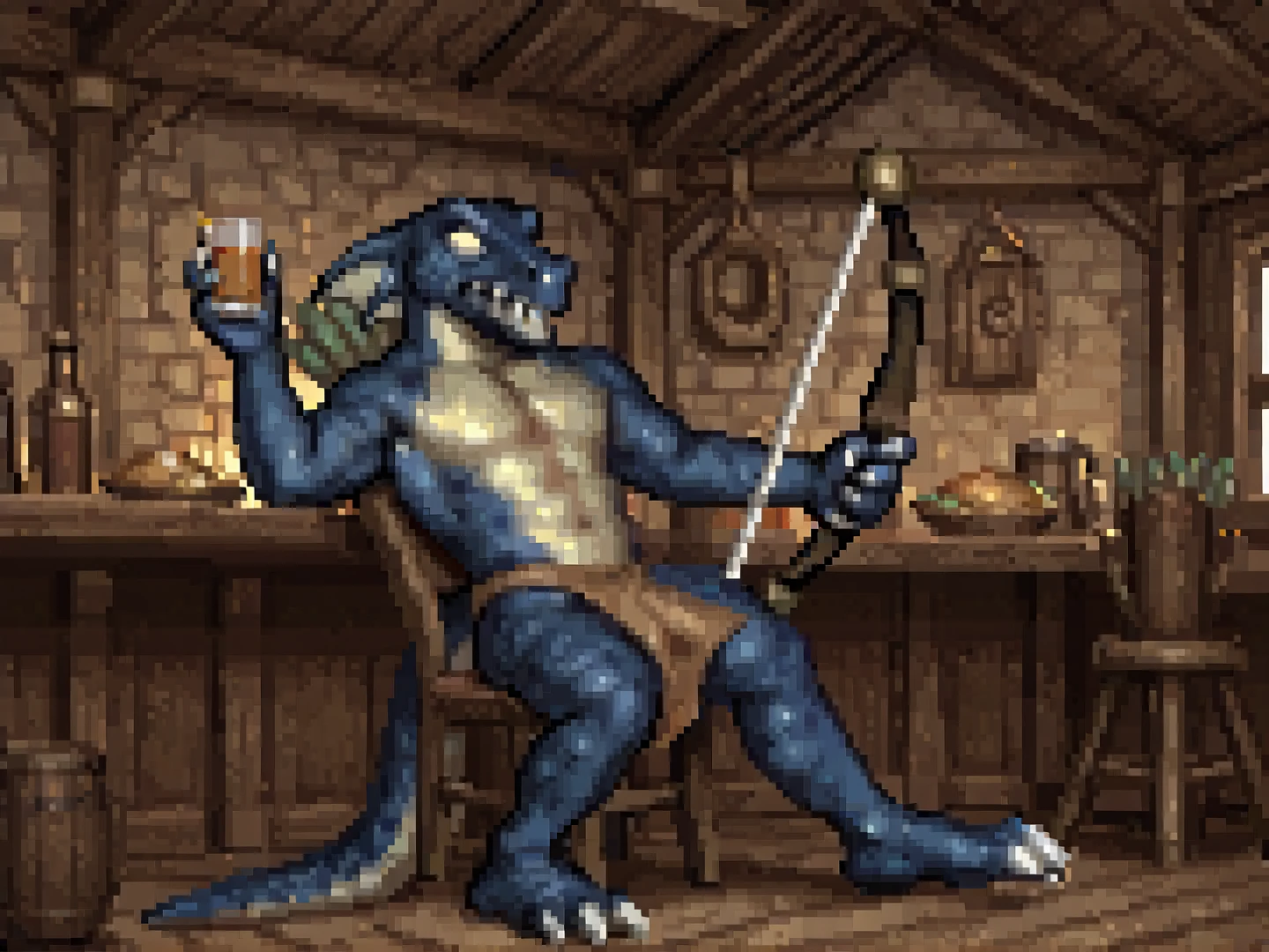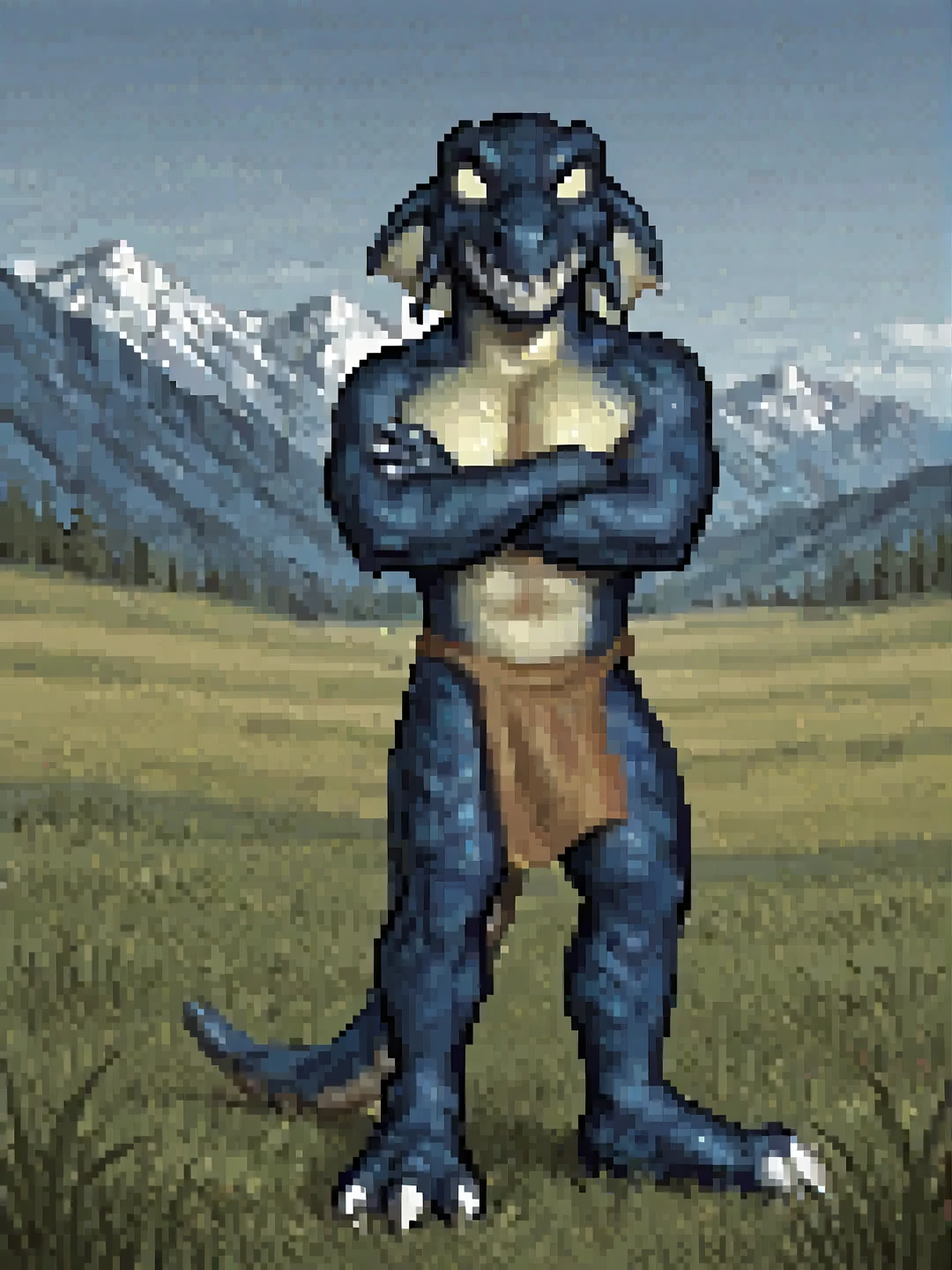h0mm3l1z4rdm4n, male, blue scales, yellow scales, two-tone skin, head fins, solid eyes, yellow sclera, nostrils, sharp teeth, claws, tail, sharp toenailsloincloth, bow (weapon), quiverOTHER TRIGGERS: