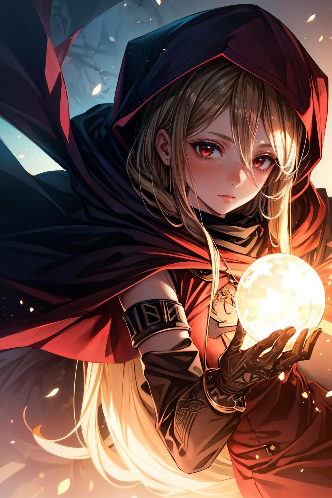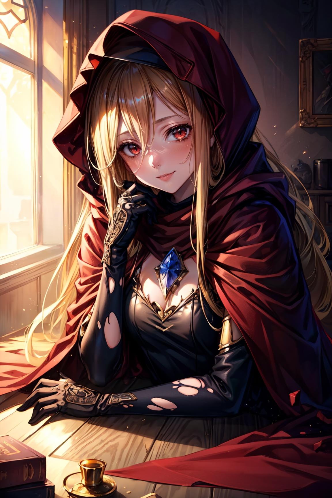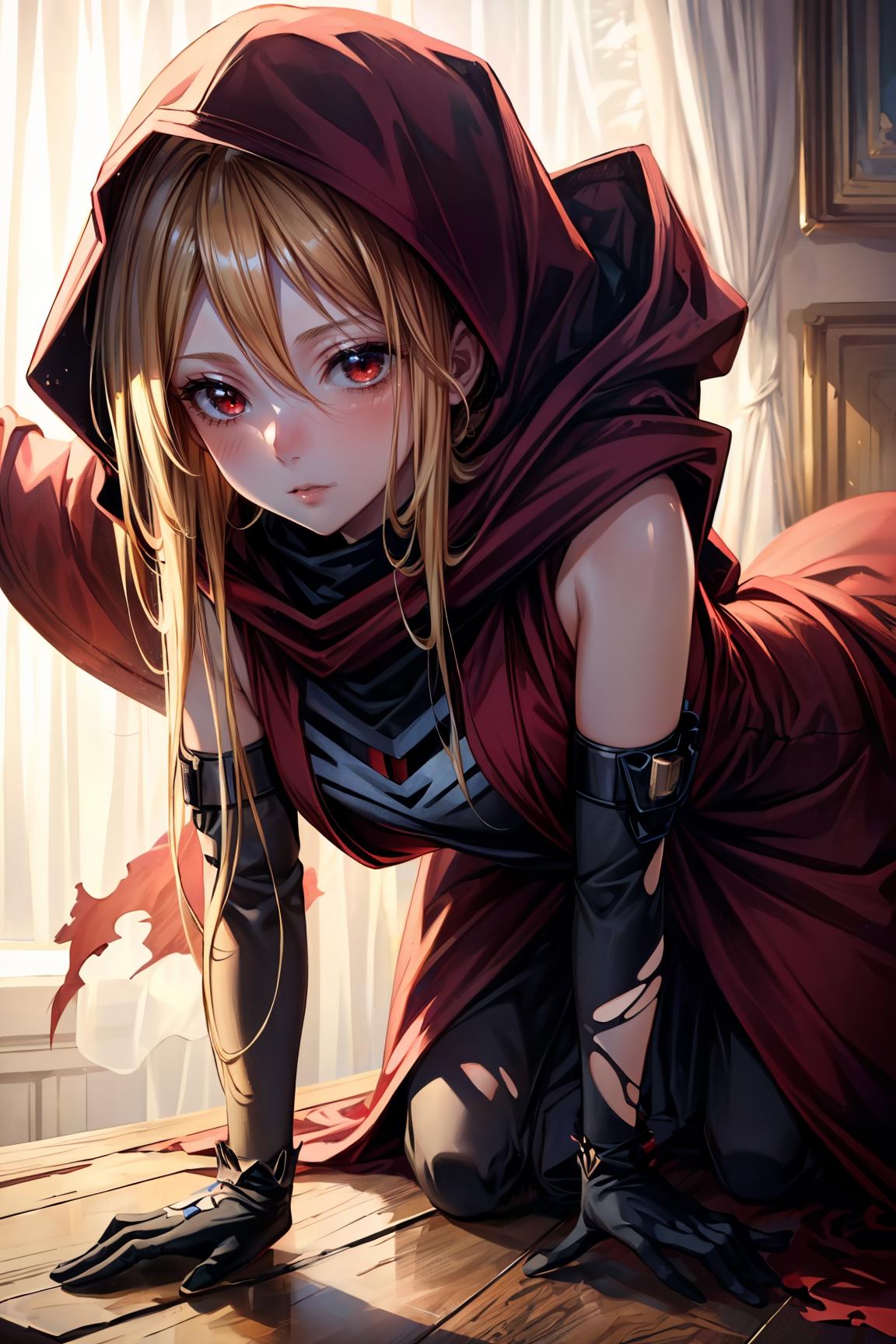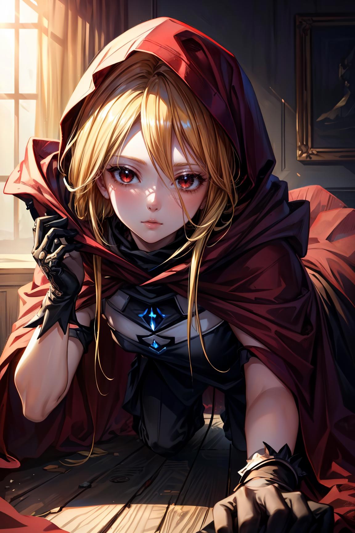 evileye_overlord, blonde hair, red eyes, cape, torn clothes, cloak, hooded cloak, mask