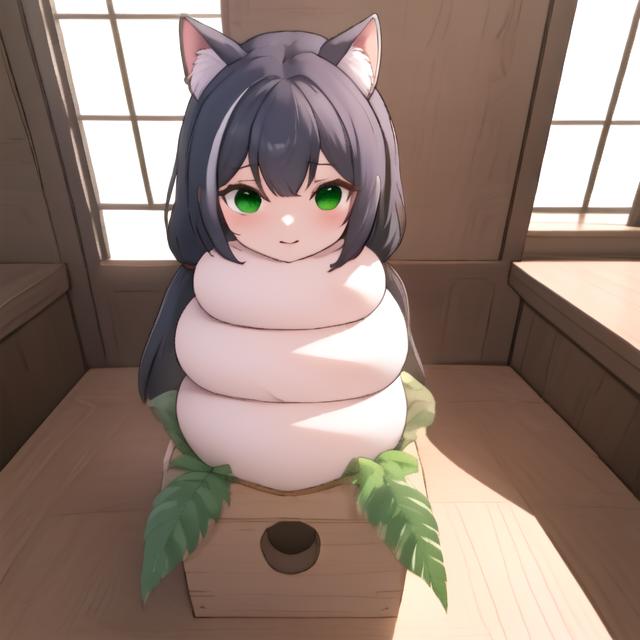 New Year: karylnewyear, cat ears, cat tail, crown_braid, hair bun, black kimono, sash, obi, hair ornament, long sleeves, wide sleeves, hair flower, floral print,