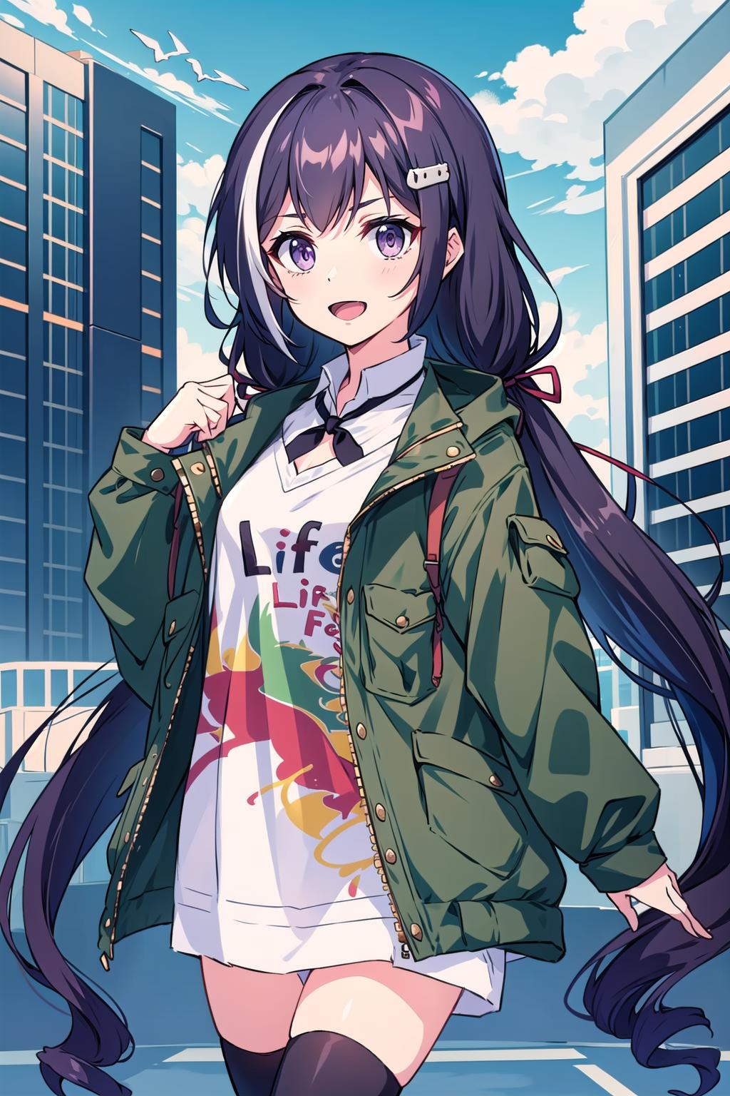 Real: karylreal, hair ornament, hairclip, purple eyes, green jacket, open clothes, long sleeves, white shirt, clothes writing, black thighhighs,