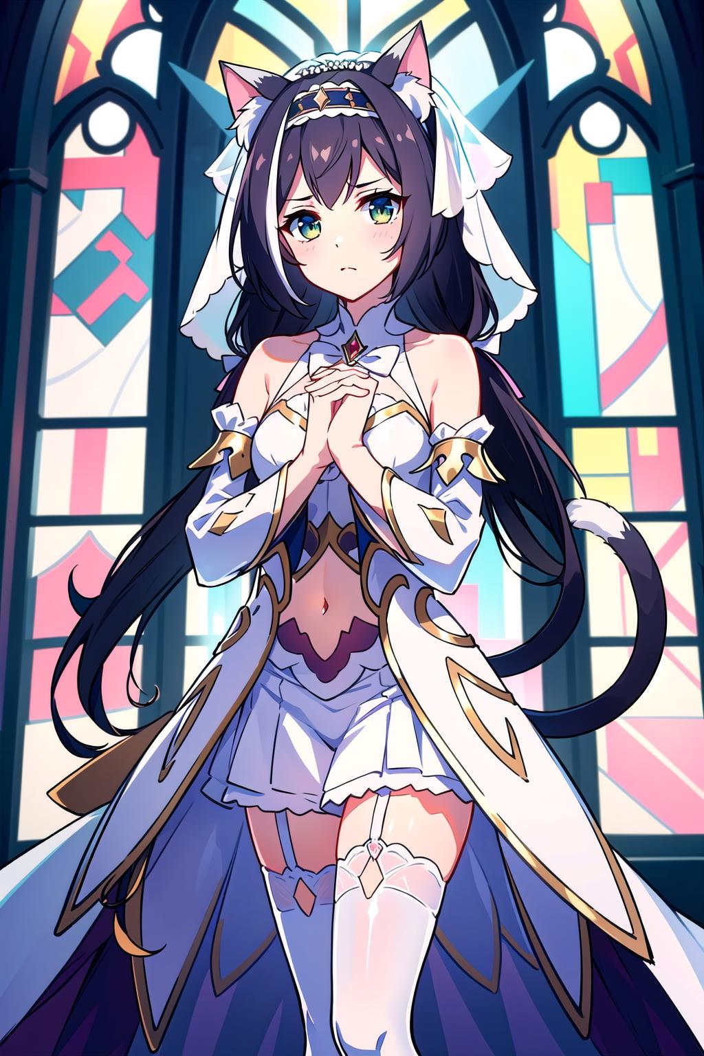 Princess: karylprincess, cat ears, cat tail, white veil, hairband, white ribbon, white dress, white sleeves, navel cutout, white thighhighs, white garter straps,