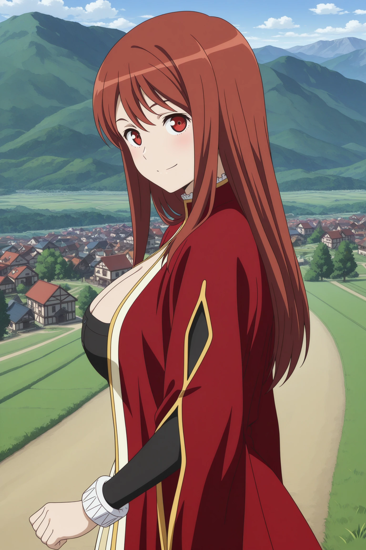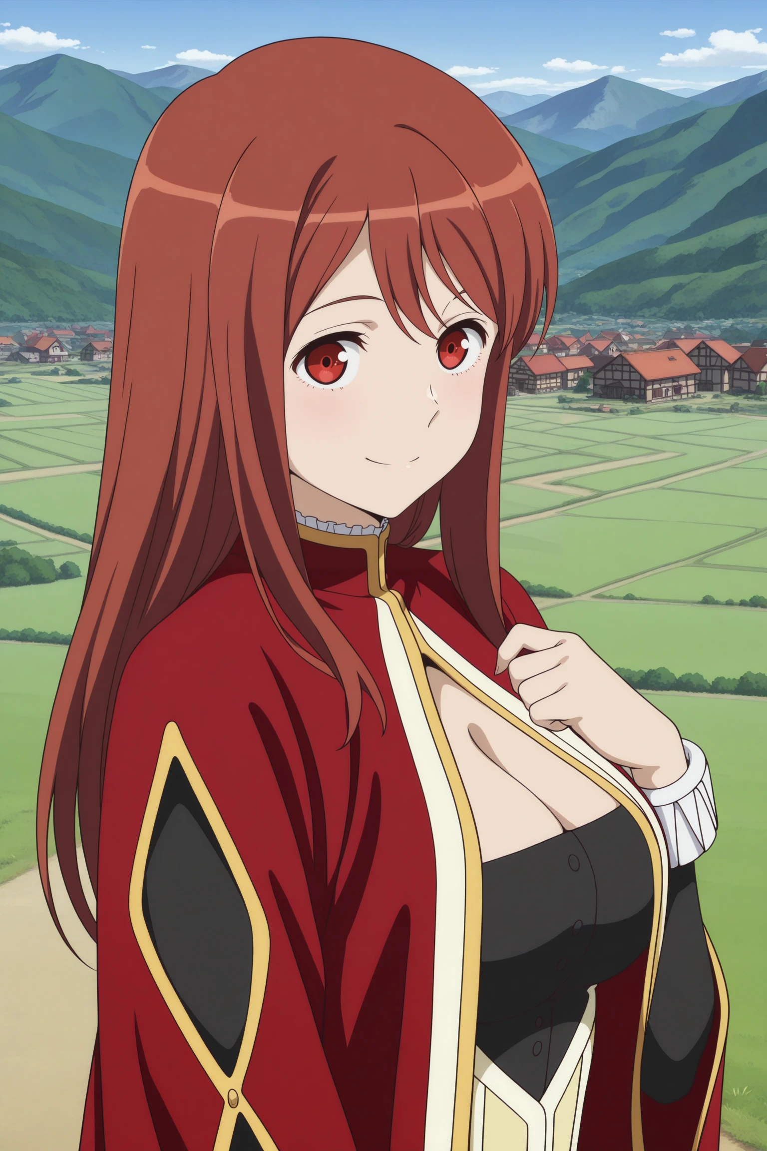 maou, long hair, brown hair, double-parted bangs, sidelocks, red eyes, long sleeves, wide sleeves, sleeve cuffs, red coat, long coat, bib collar, multicolored dress, long dress