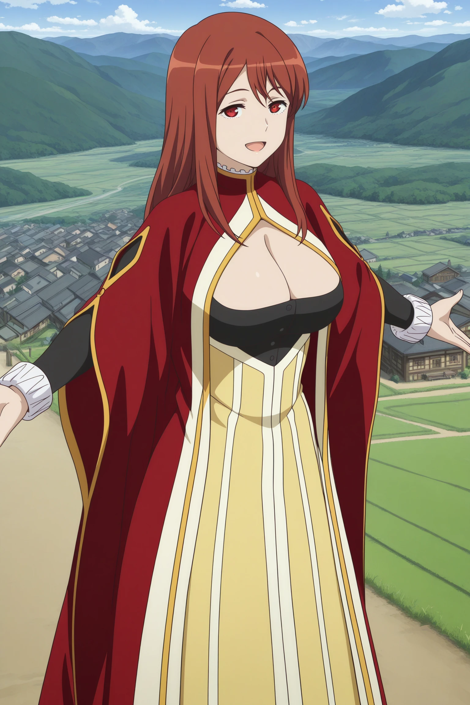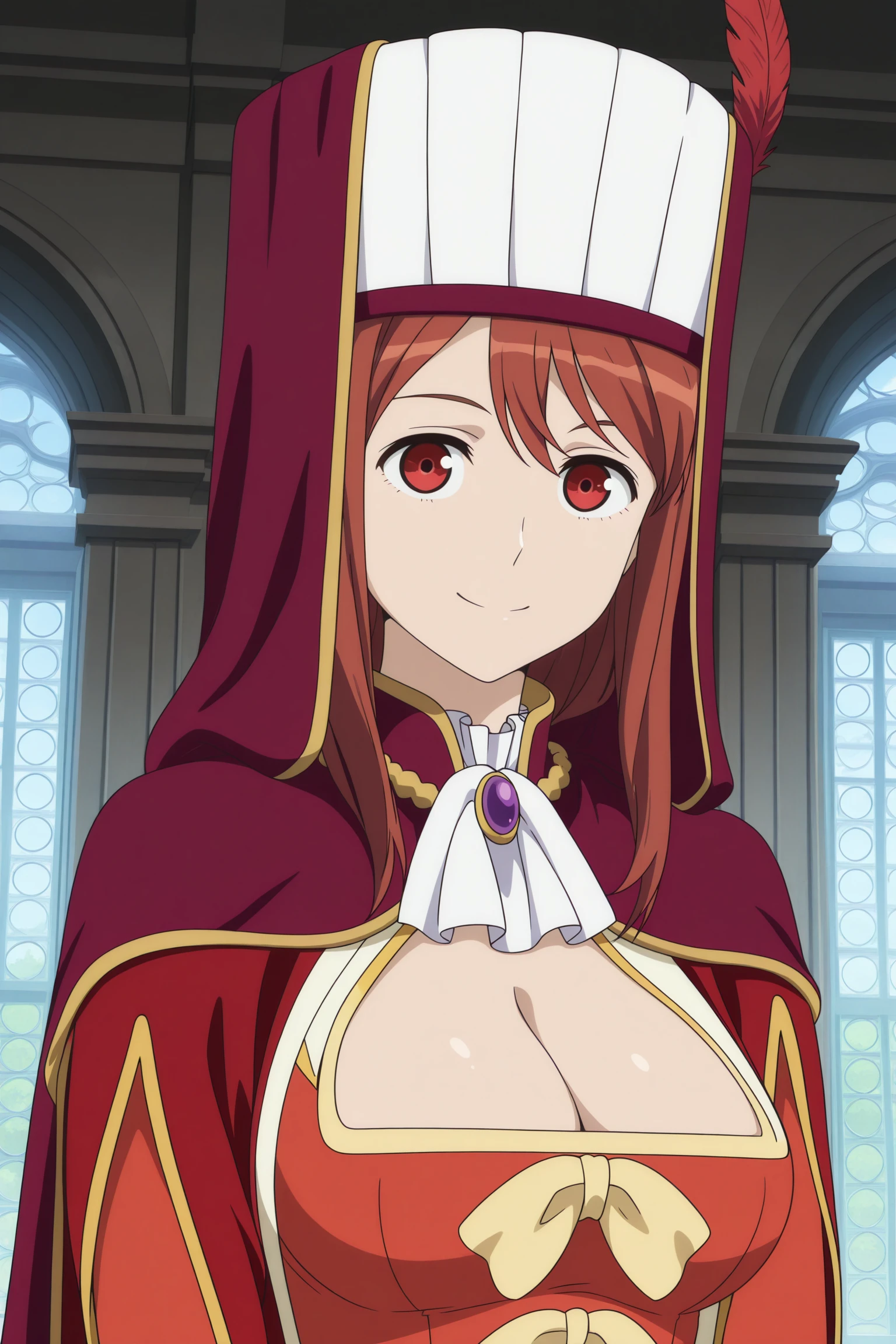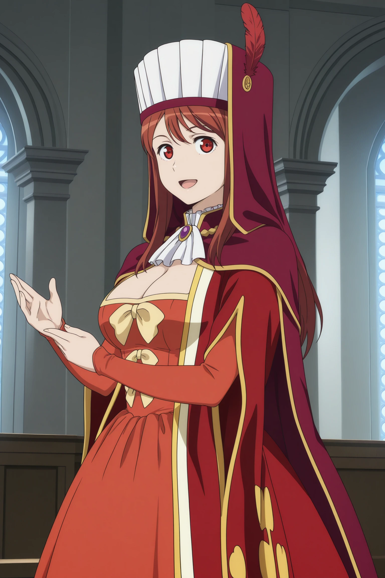 maou, long hair, brown hair, double-parted bangs, hat, hat feather, sidelocks, red eyes, juliet sleeves, purple cape, red coat, open coat, long coat, bib collar, brooch, ascot, orange dress, dress bow