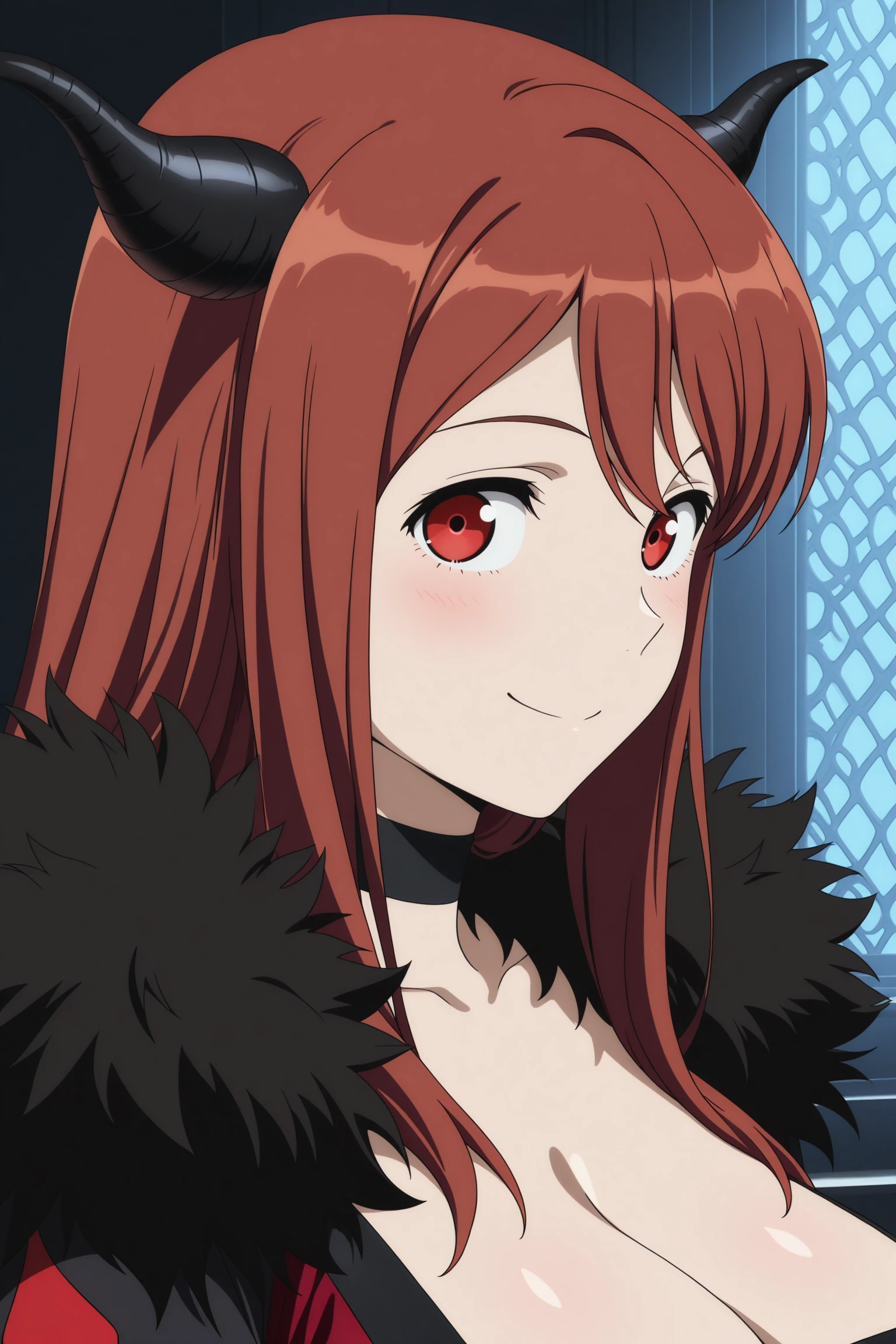 maou, long hair, brown hair, demon horns, double-parted bangs, sidelocks, red eyes, choker, long sleeves, long coat, black coat, fur-trimmed coat, fur-trimmed sleeves, red dress, long dress, dress ribbon, underburstOutfit 2