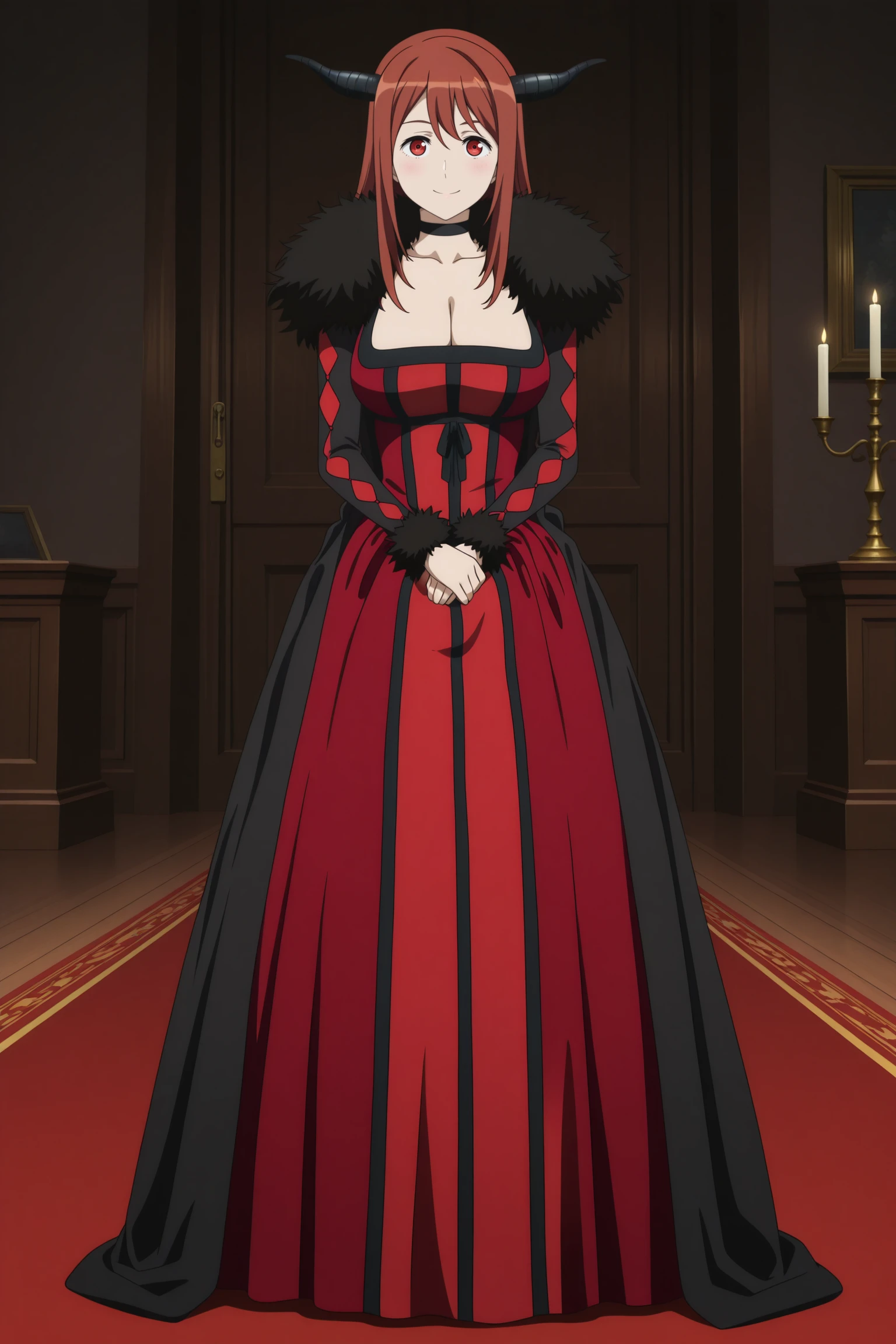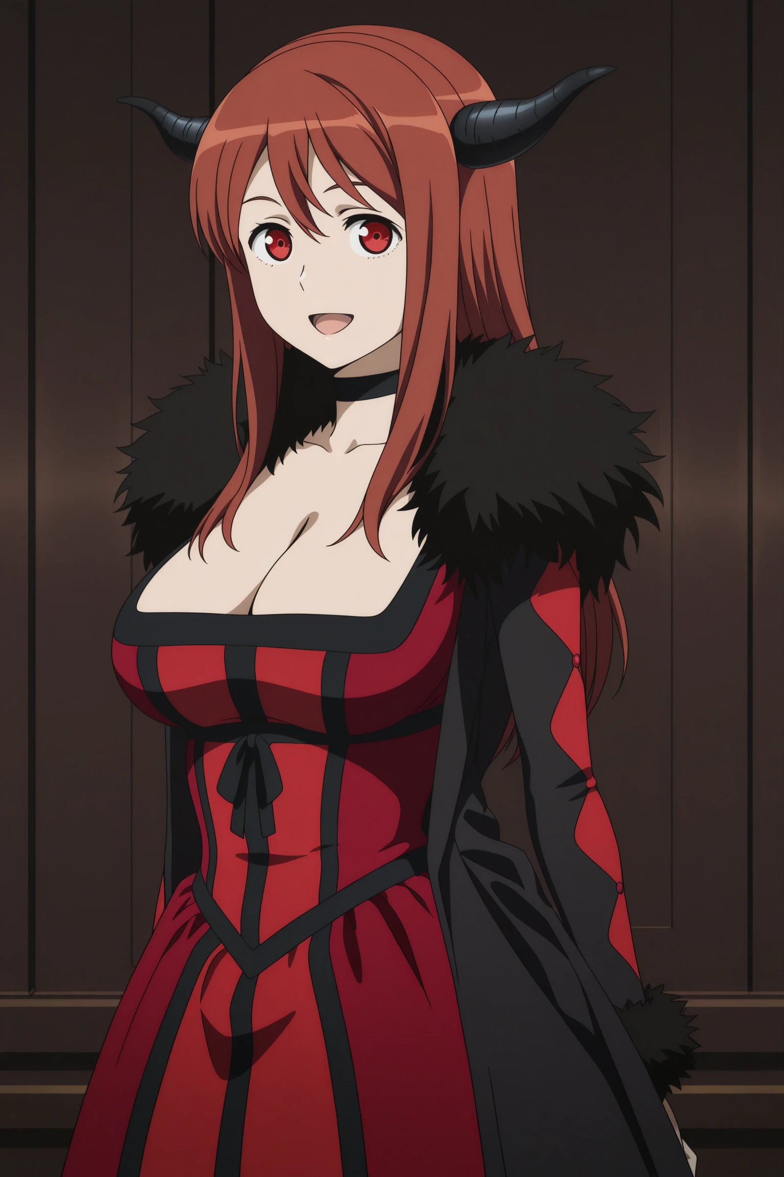 maou, long hair, brown hair, demon horns, double-parted bangs, sidelocks, red eyes, choker, long sleeves, long coat, black coat, fur-trimmed coat, fur-trimmed sleeves, red dress, long dress, dress ribbon, underburst