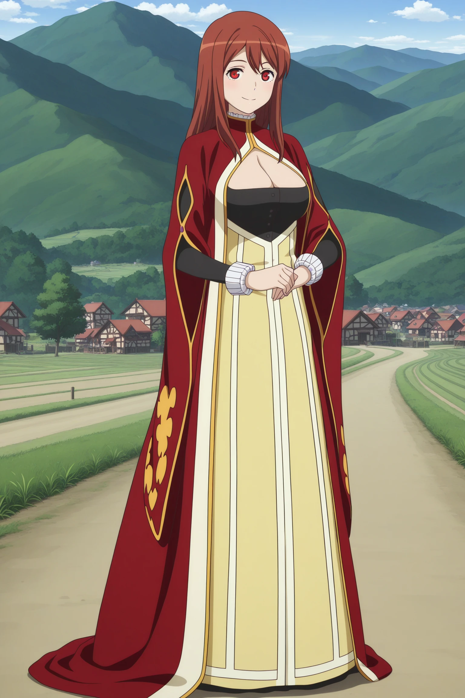 maou, long hair, brown hair, double-parted bangs, sidelocks, red eyes, long sleeves, wide sleeves, sleeve cuffs, red coat, long coat, bib collar, multicolored dress, long dressOutfit 3