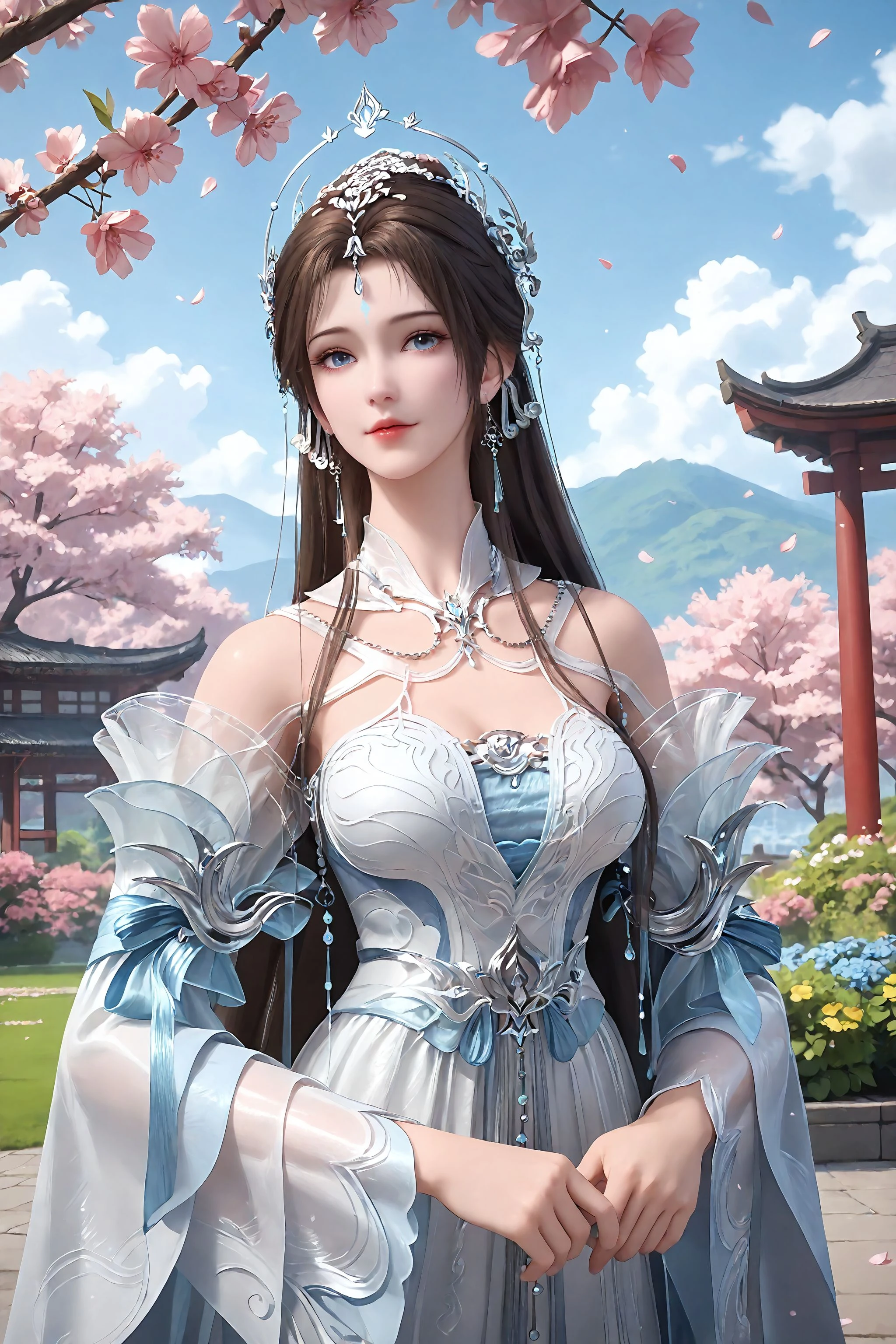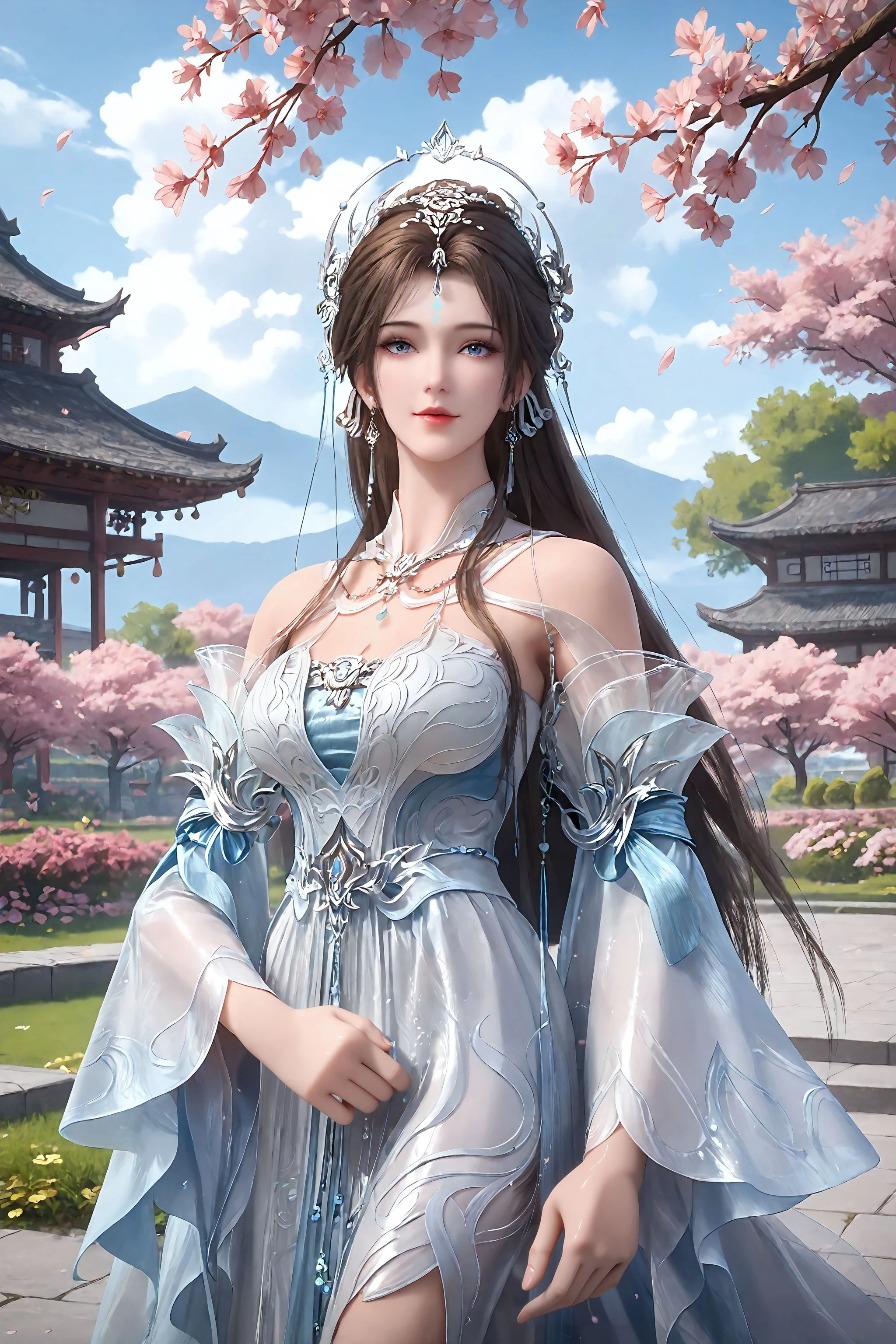 1girl, forehead mark, long hair, dress, hair ornament, jewelry, brown hair, facial mark, white dress, detached sleeves, earrings, blue eyes