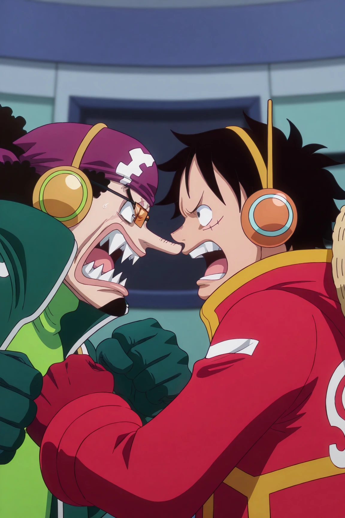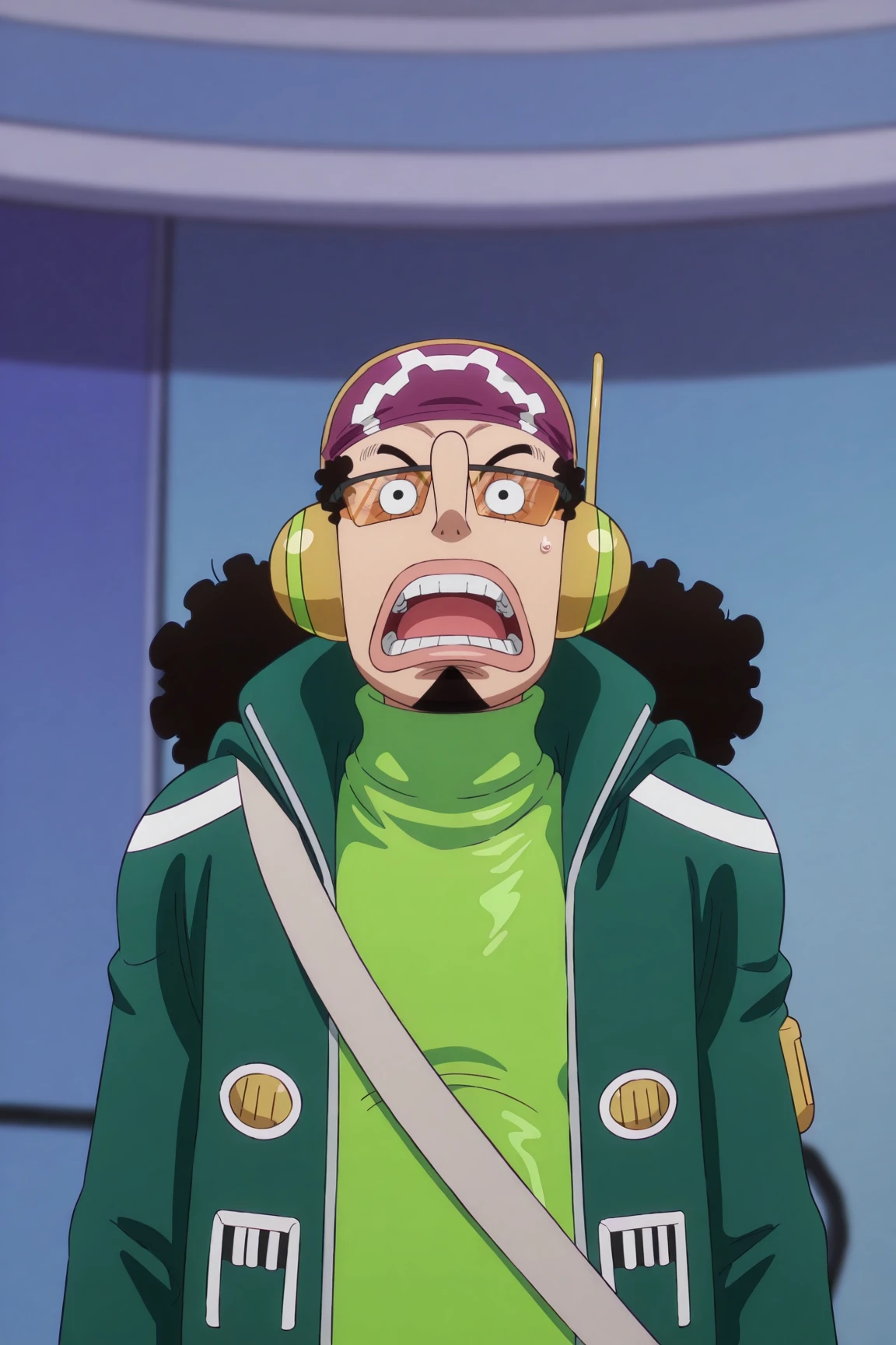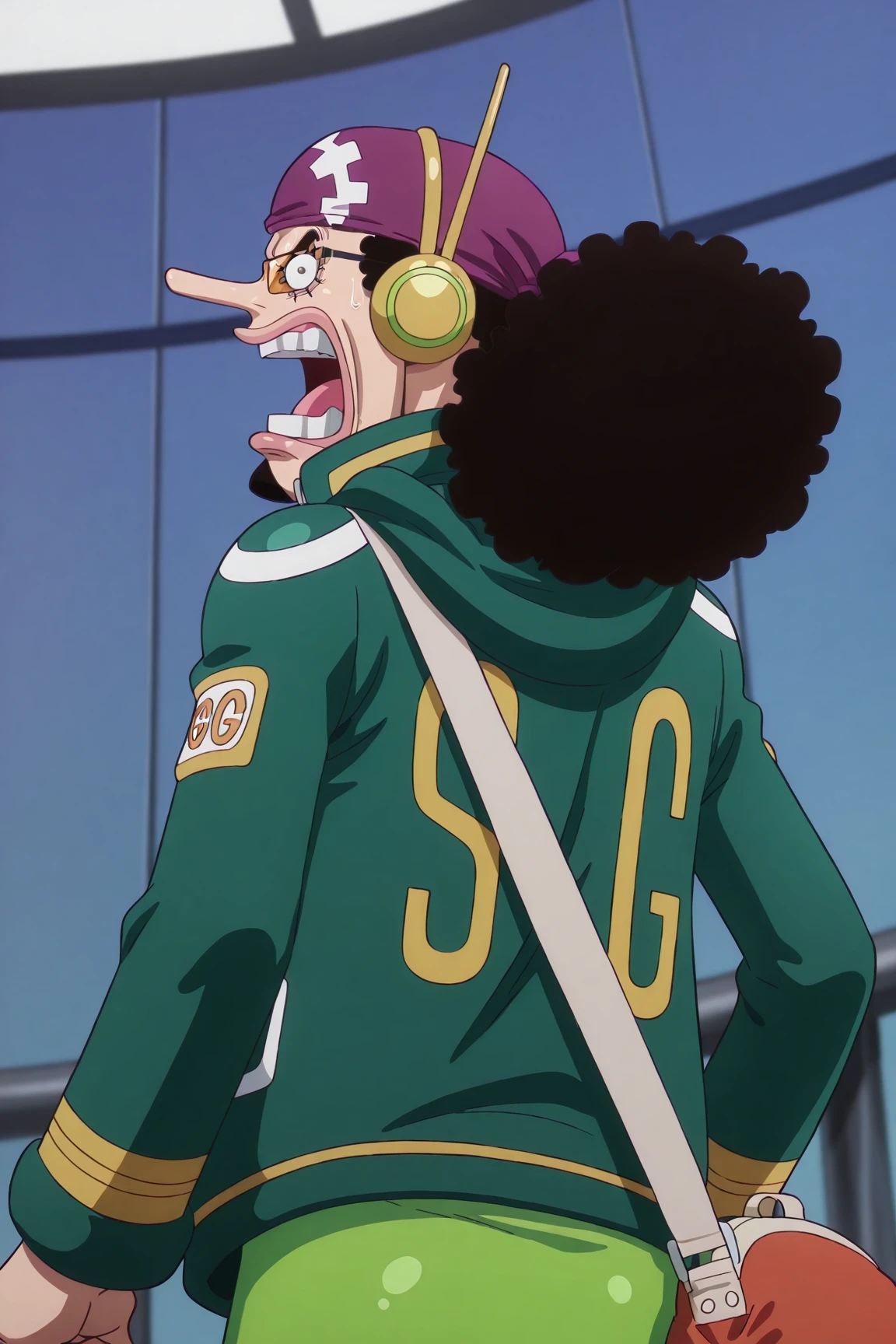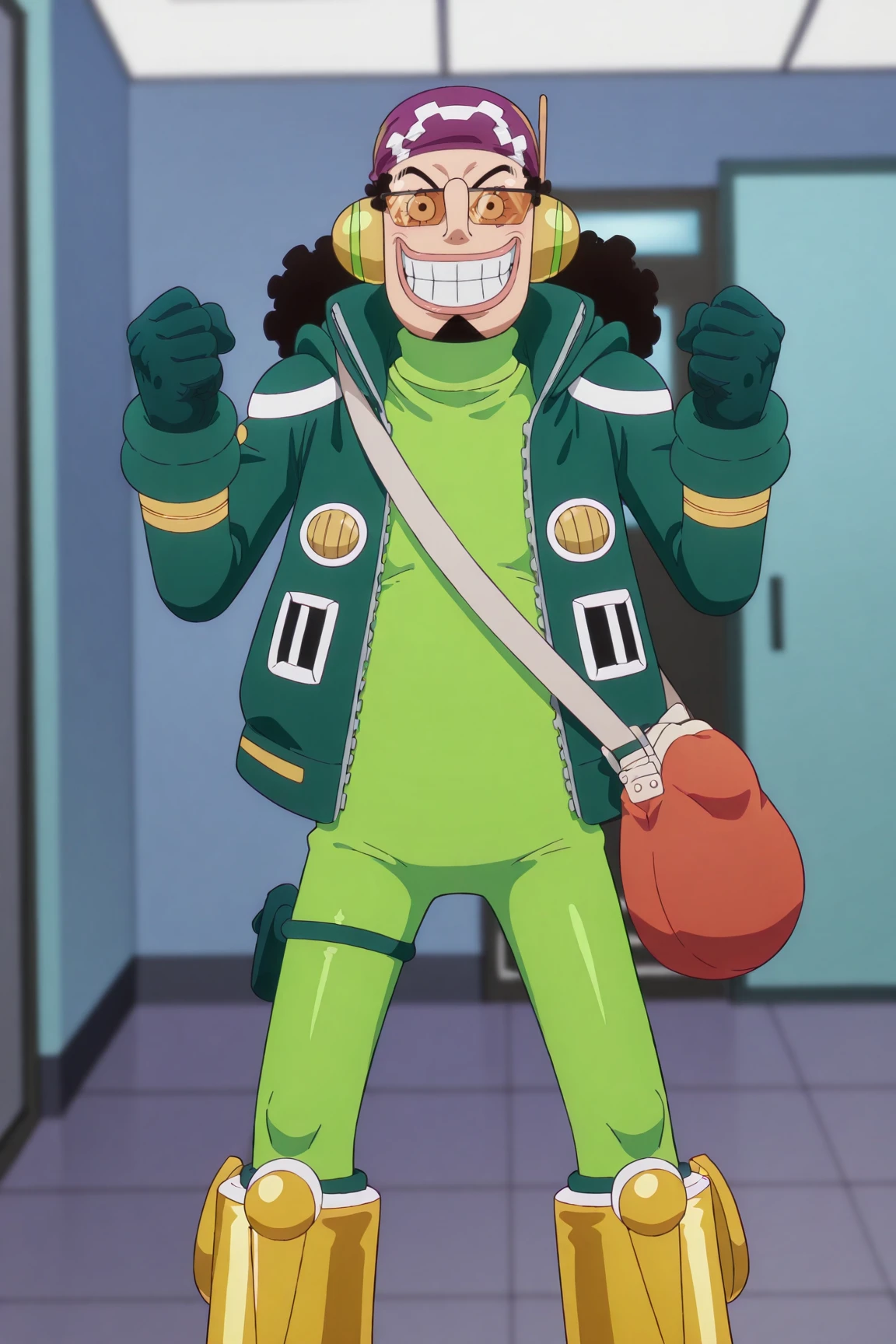 Usopp, black hair, black eyes, purple bandana, sunglasses, headgear, green hooded jacket, green ????????, yellow boots, thigh strap,