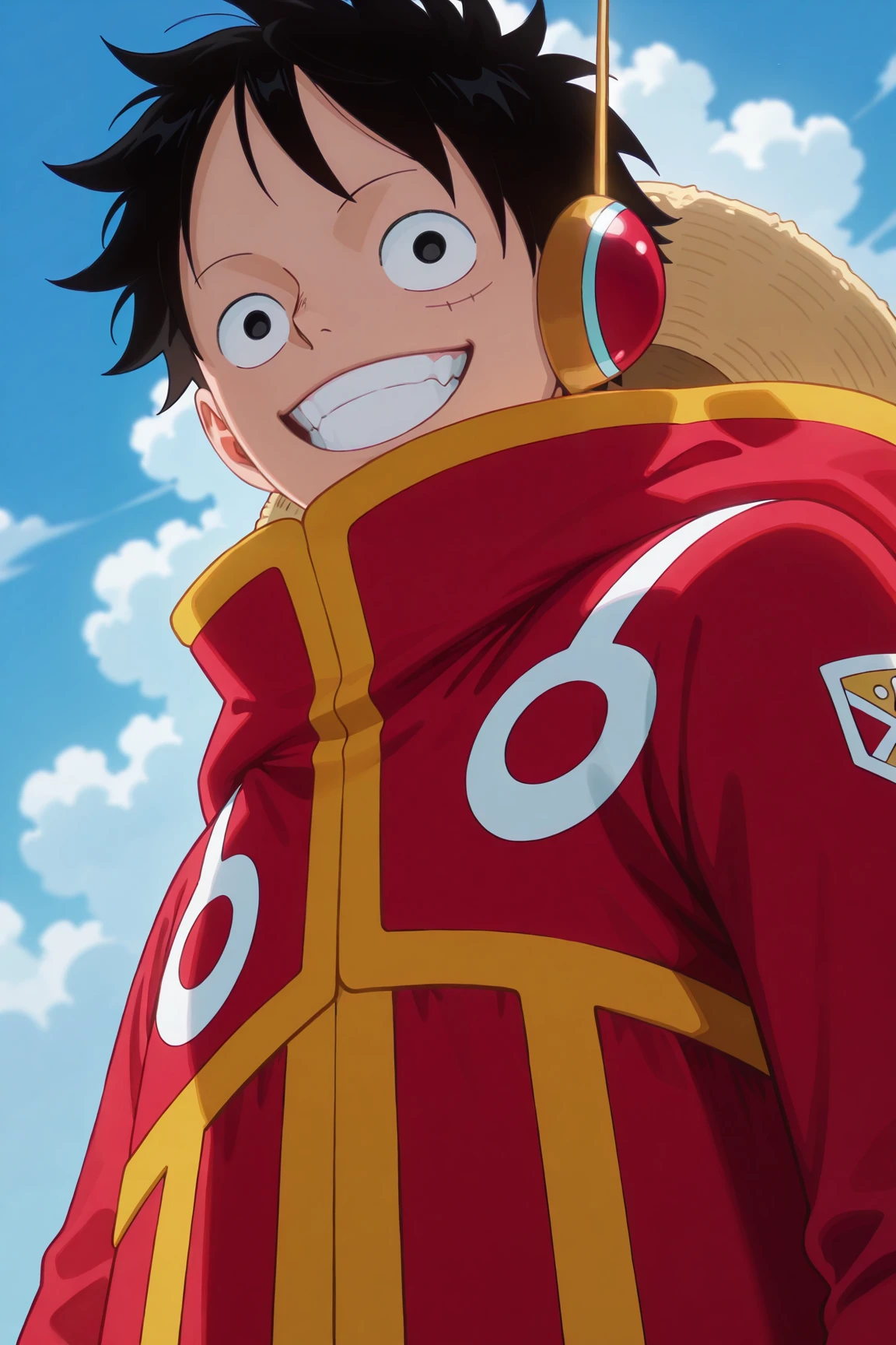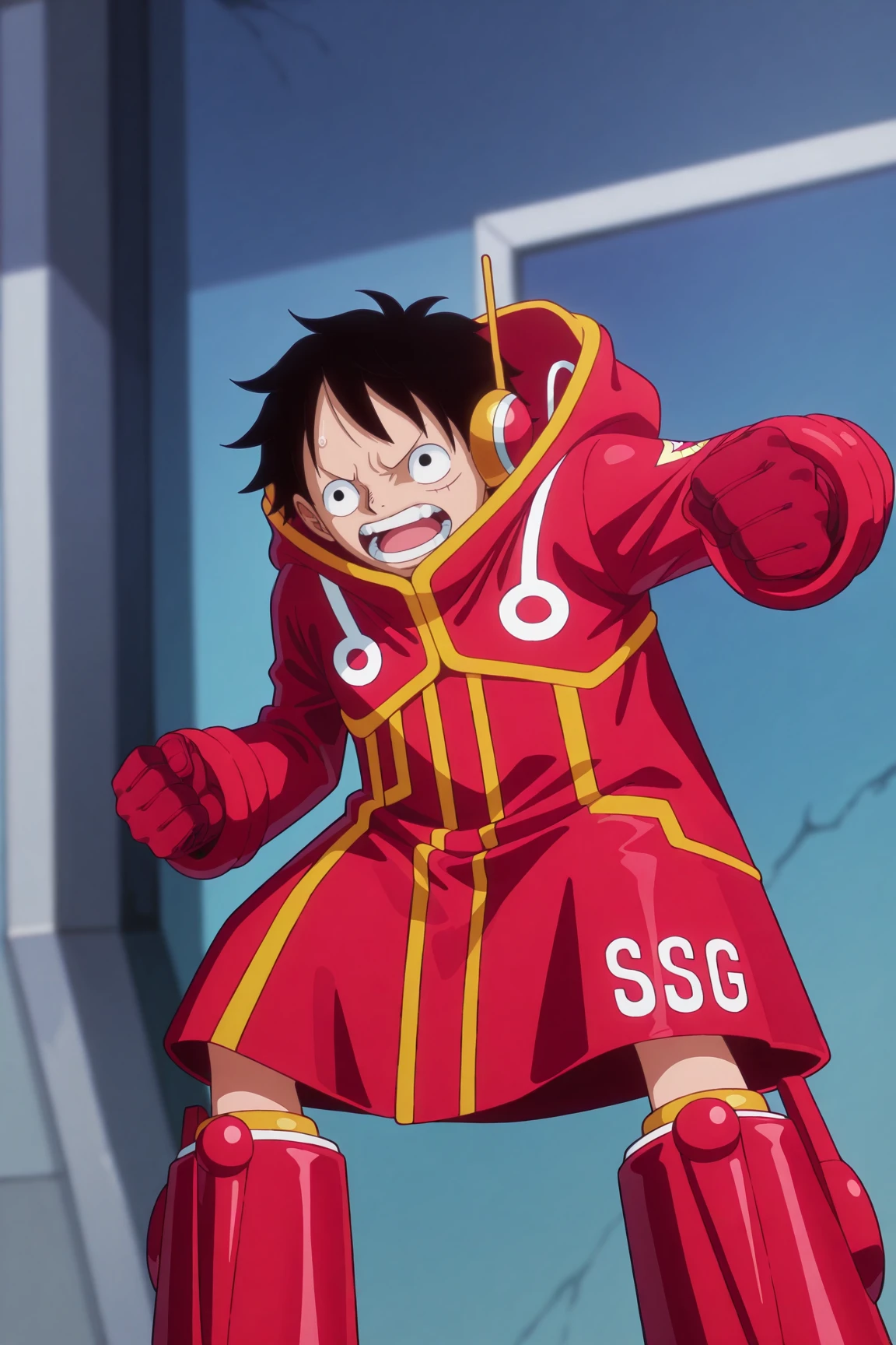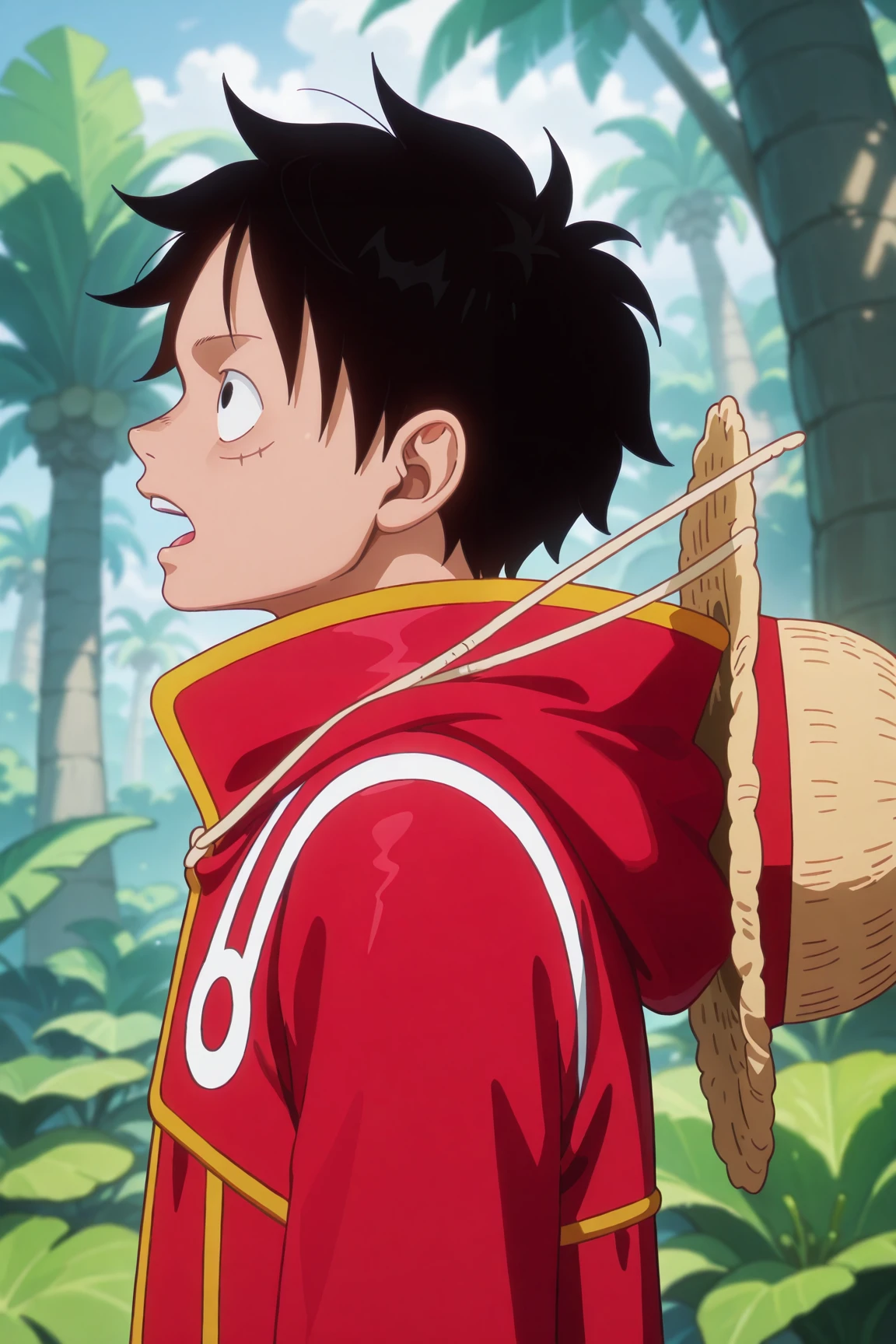 luffy, black hair, black eyes, scar on face, red hooded coat, red gloves, red boots, hat on back,