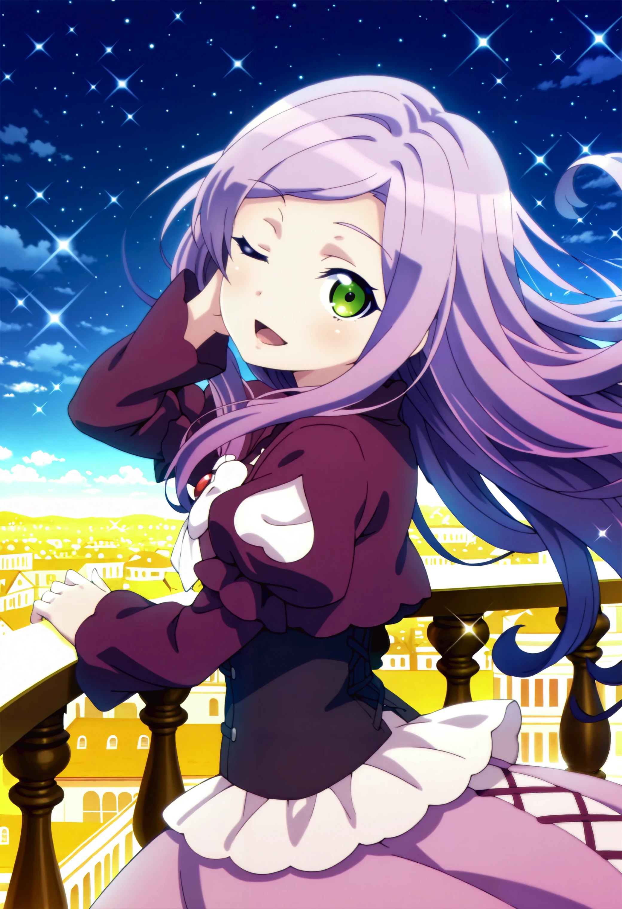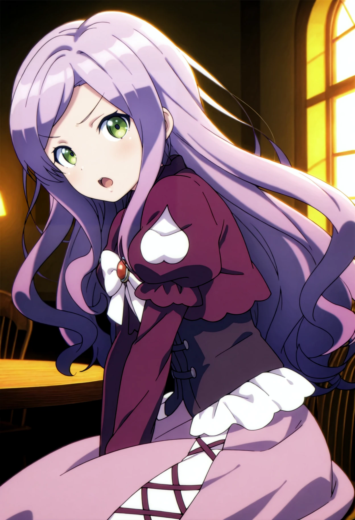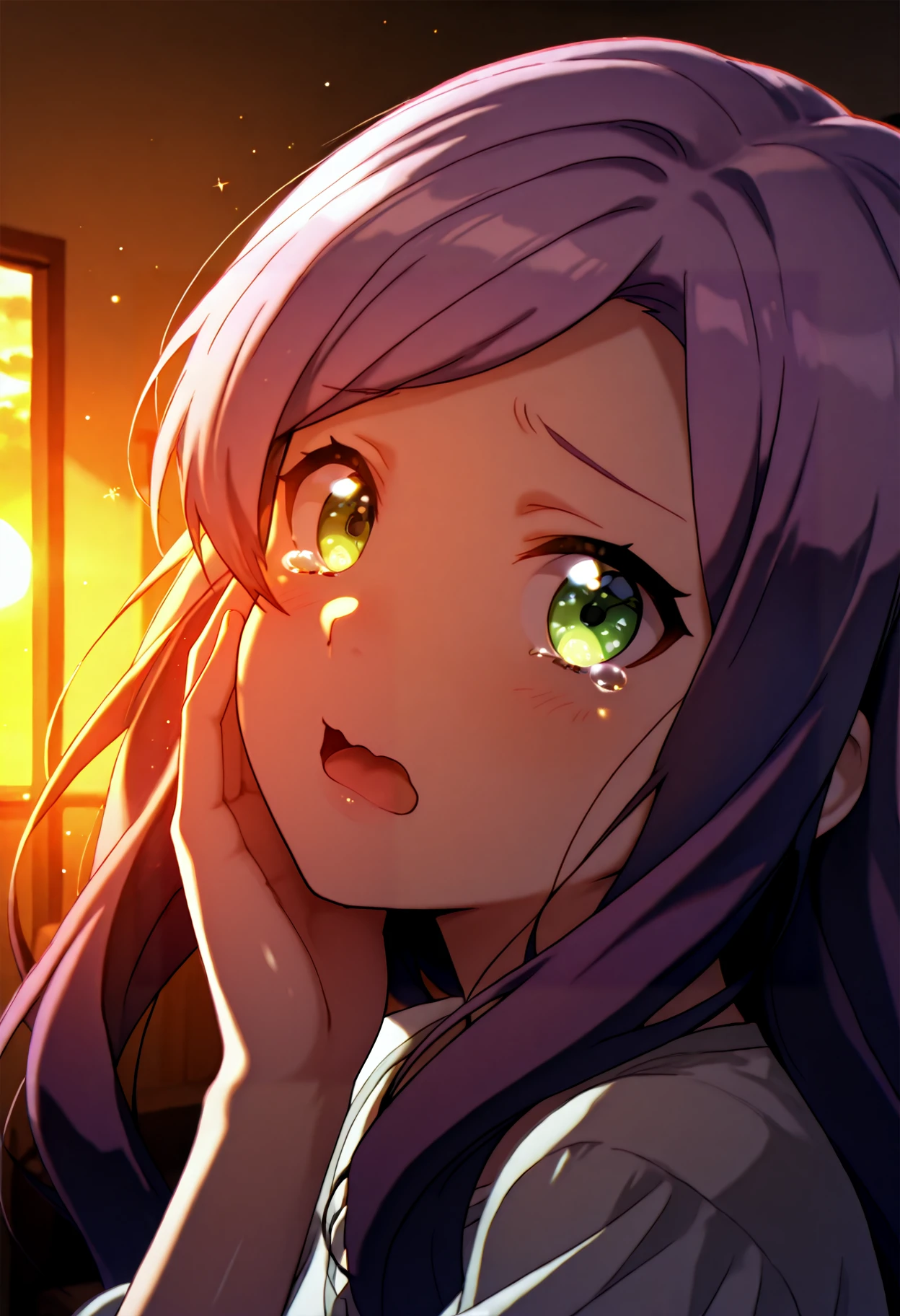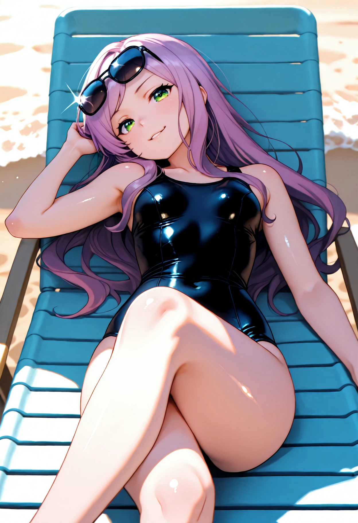 flat chest, green eyes, long hair, purple hair, swept bangs