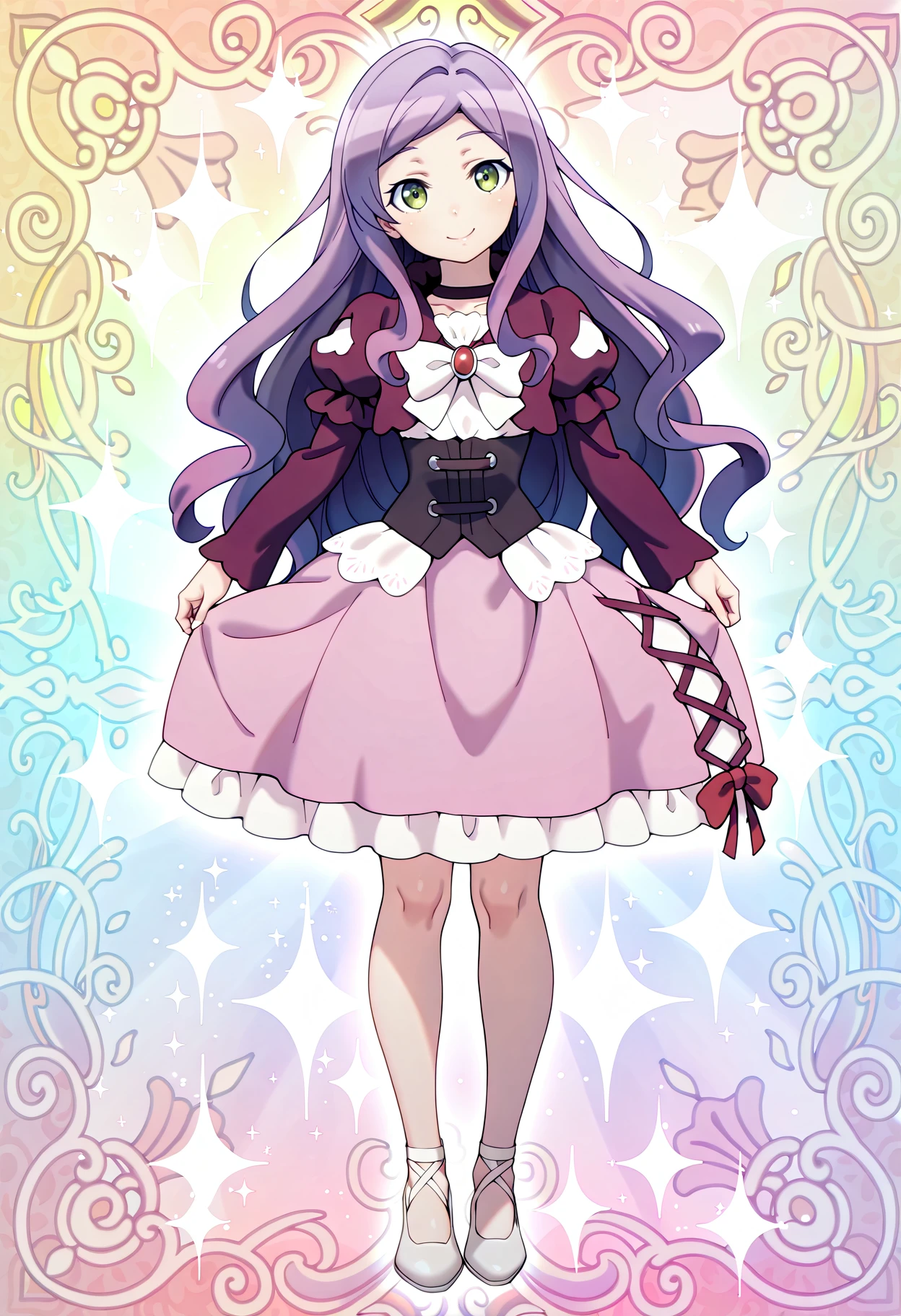 catDMArisa, dress, skirt, white bow, red brooch, corset, long sleeves, puffy sleeves, white ballerina, cross-laced clothes
