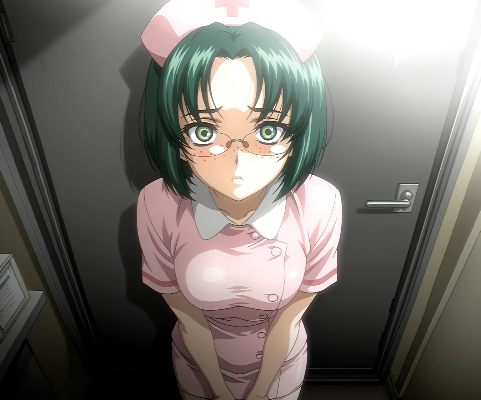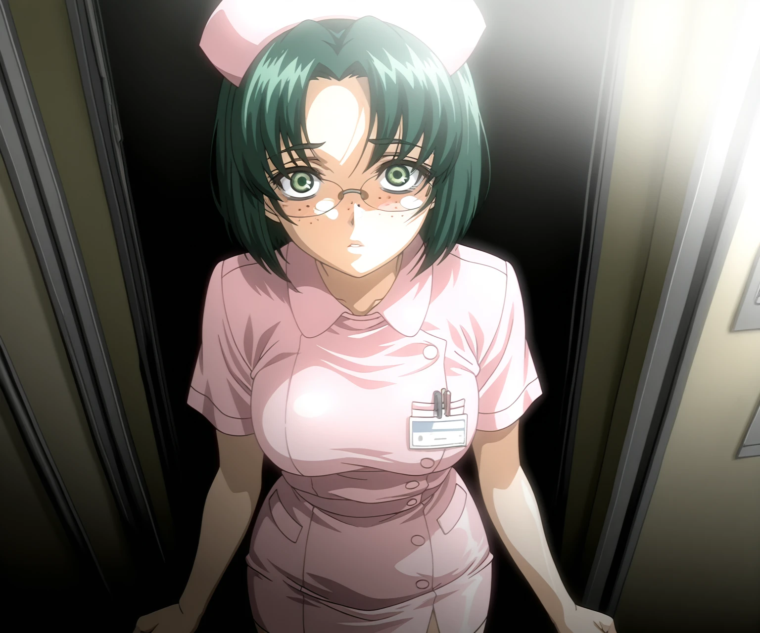 green hair, short hair, parted bangs, green eyes, glasses, freckles, pink nurse, nurse cap, shirt, pencil skirt,