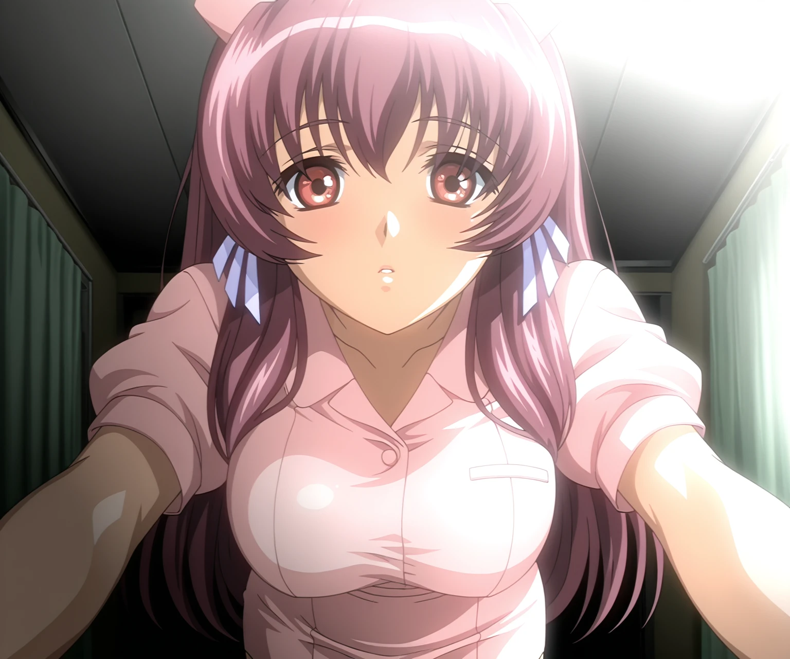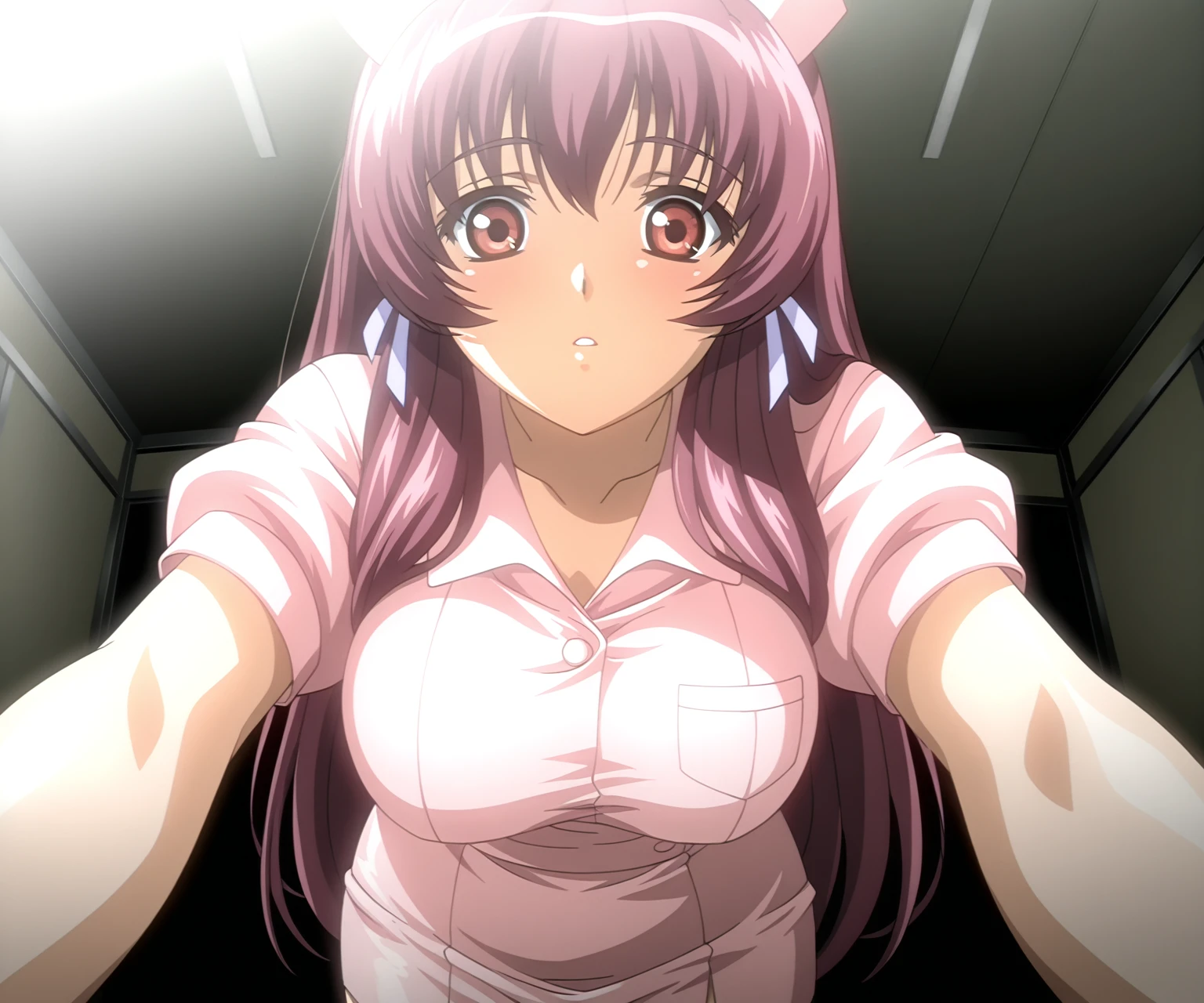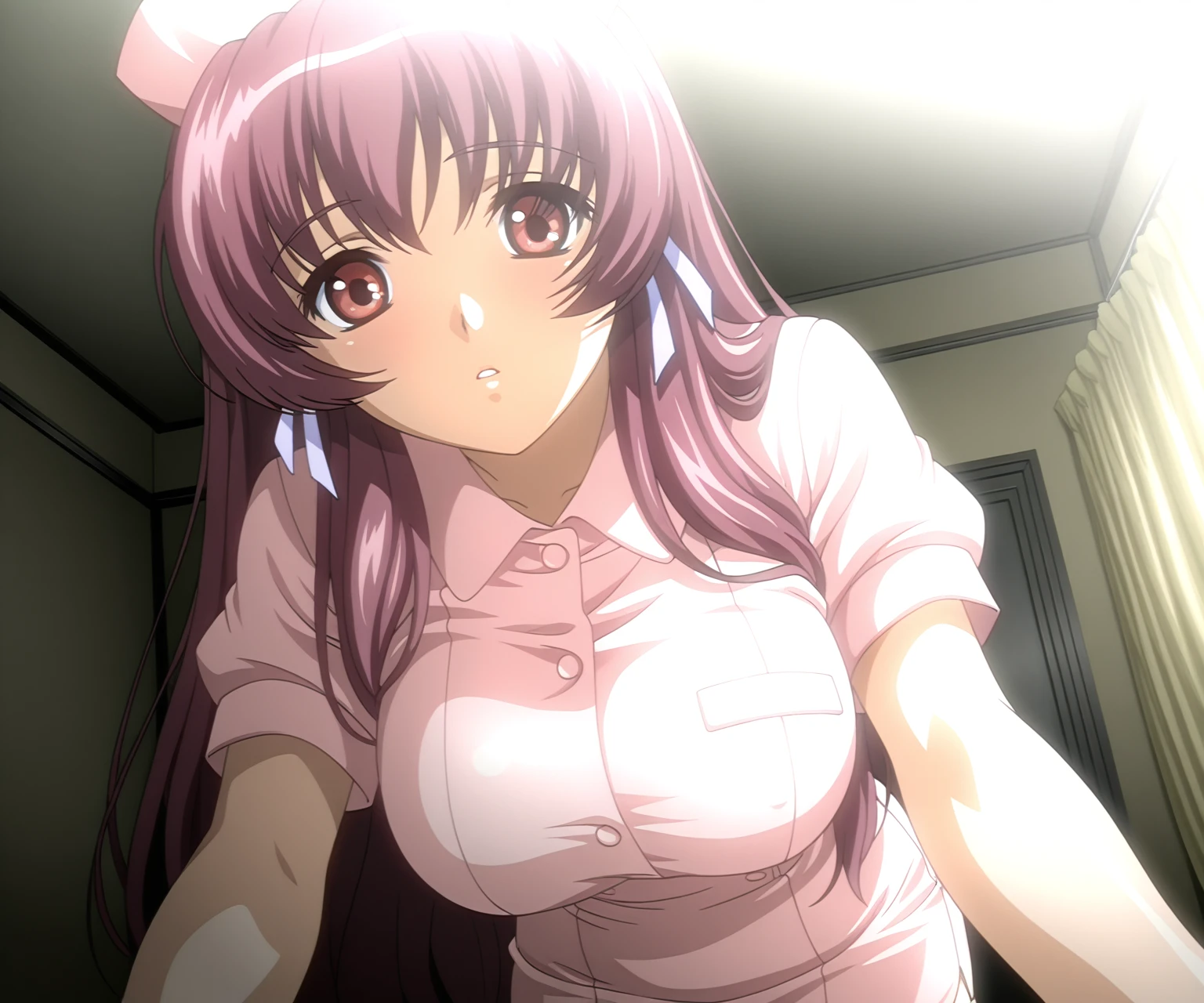 kazama mana, large breasts, pink hair, long hair, hair ribbon, red eyes, pink nurse, nurse cap, shirt, pencil skirt,