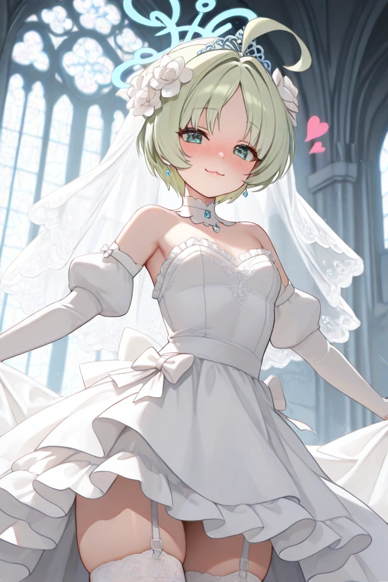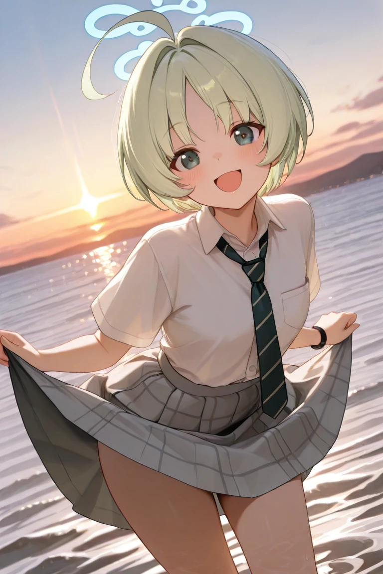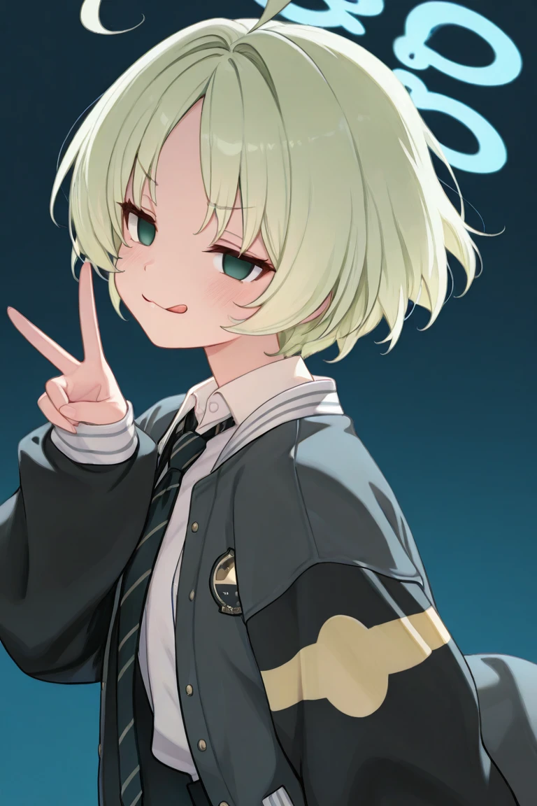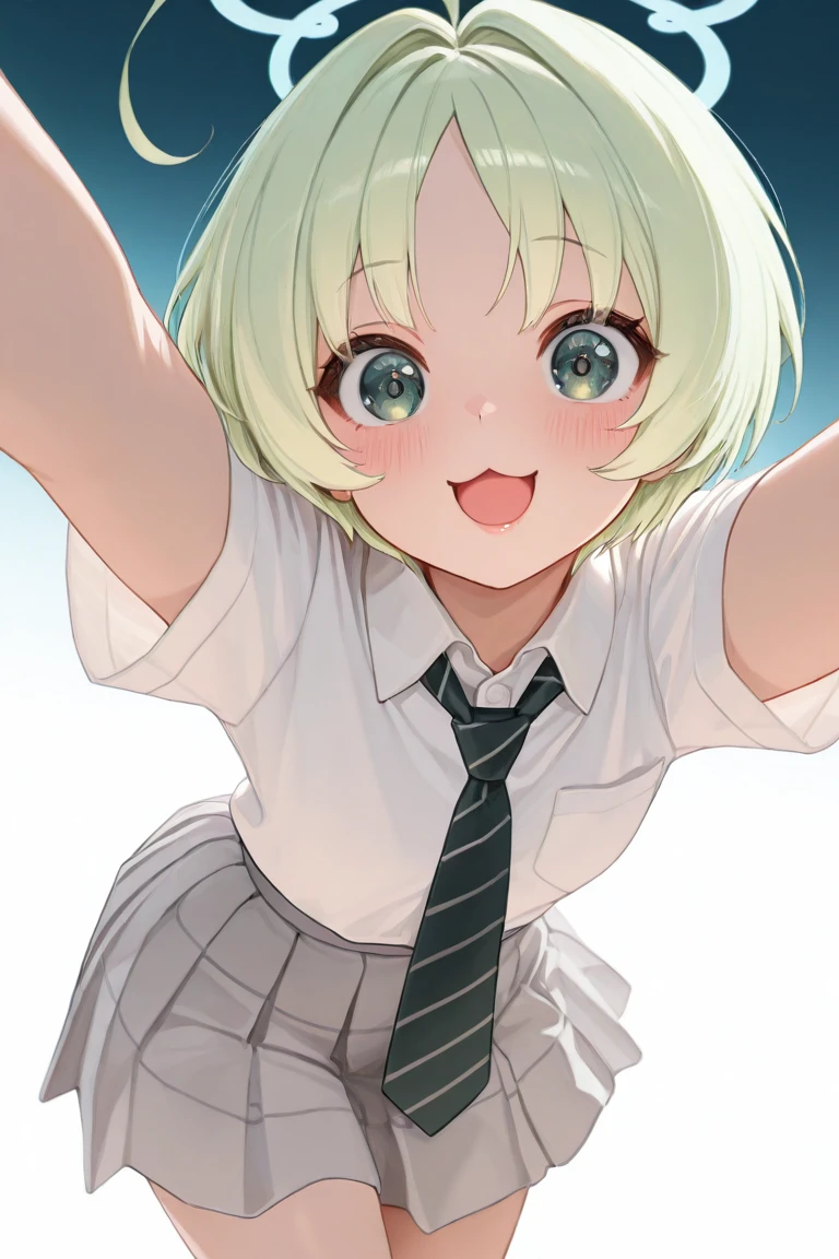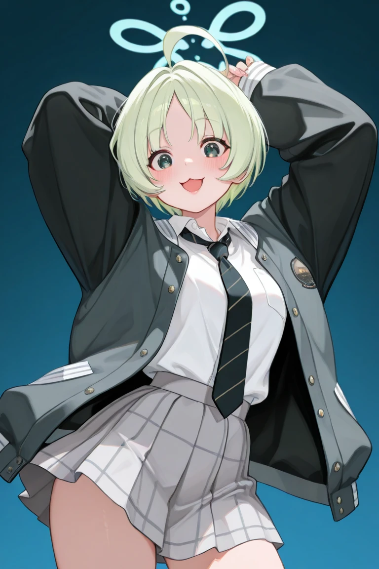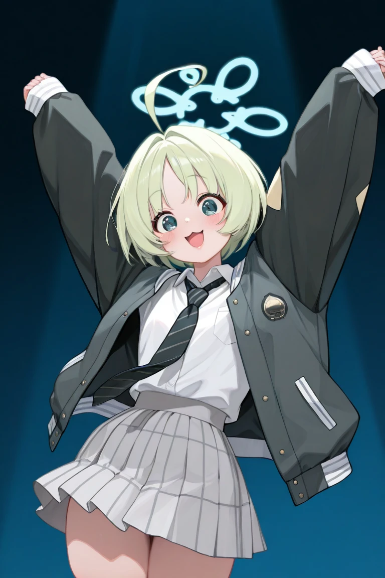 Ritsu_Default,short hair, light green hair, parted bangs, huge ahoge, hair intakes, green eyes, blue halo,black jacket, open jacket, long sleeves, puffy sleeves, sleeves past wrists,white shirt, collared shirt, short sleeves,grey skirt, pleated skirt,white socks, loafers, brown footwear,necktie, striped necktie,Description