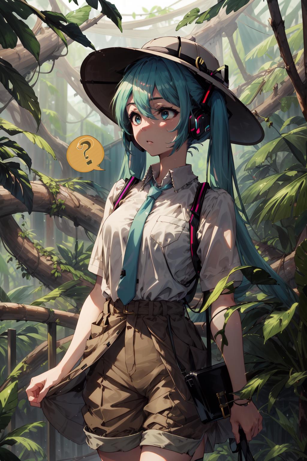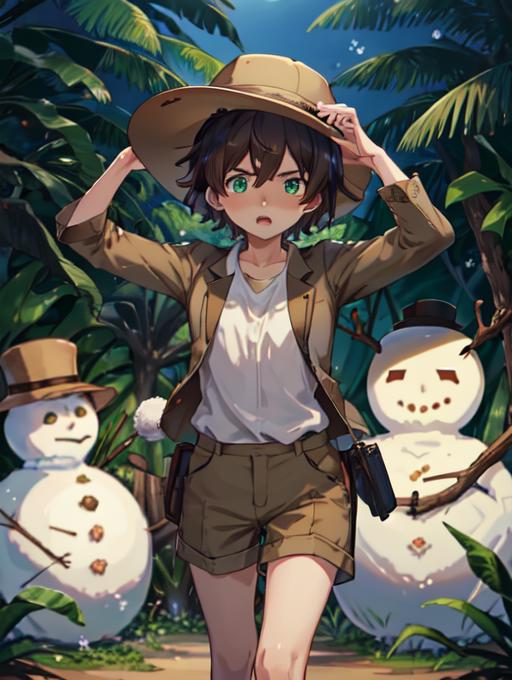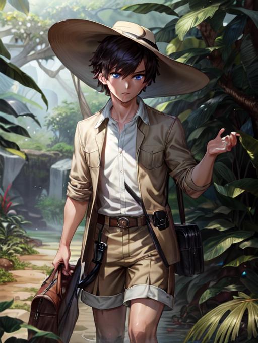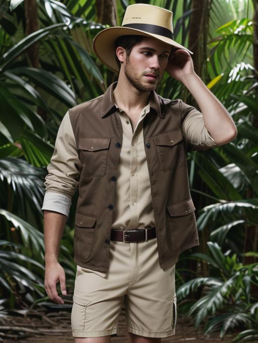 Additional words that may help: white dress shirt, brown shorts, brown pants, brown hat, jungle,