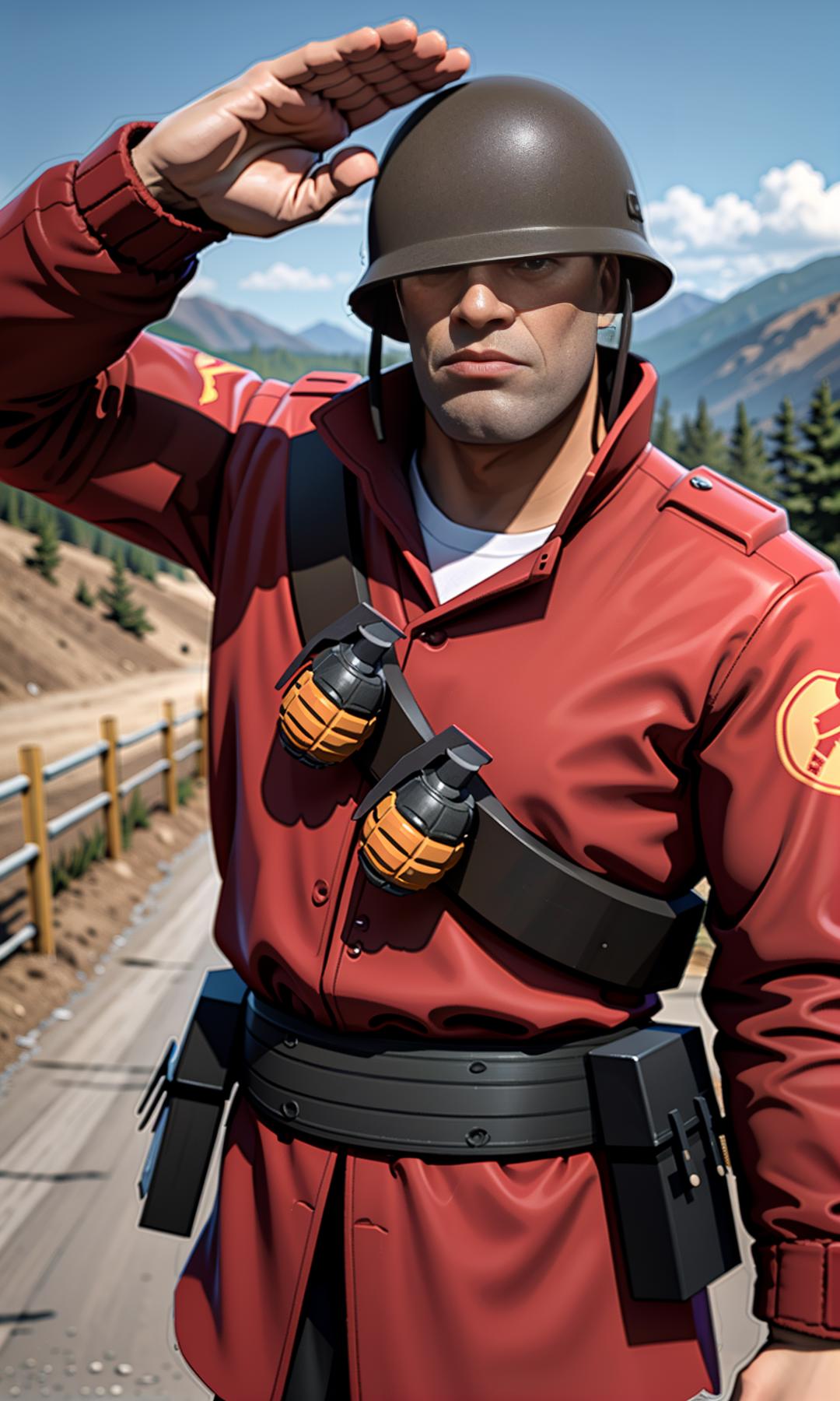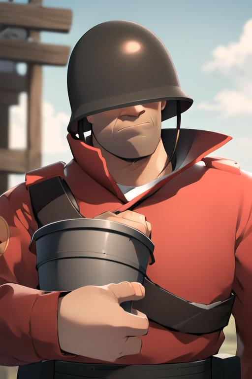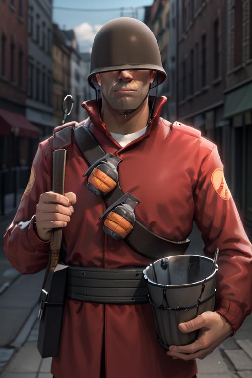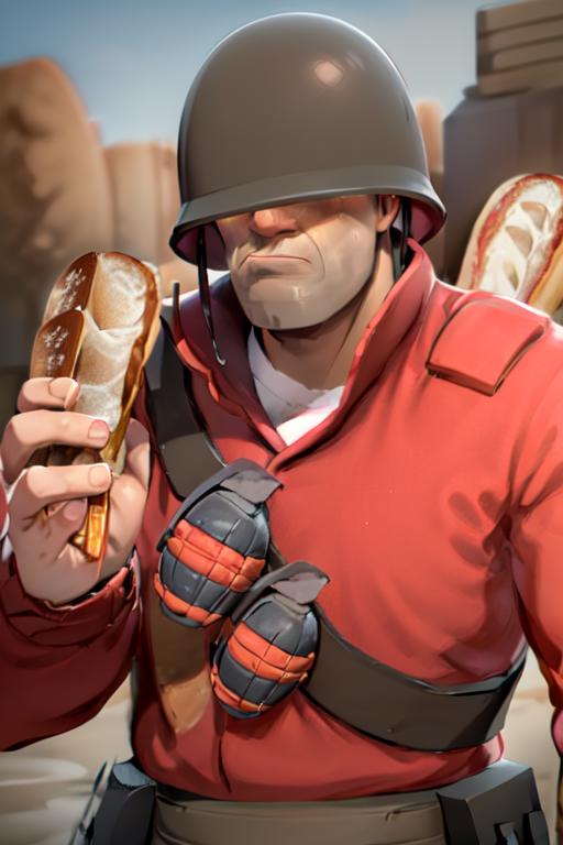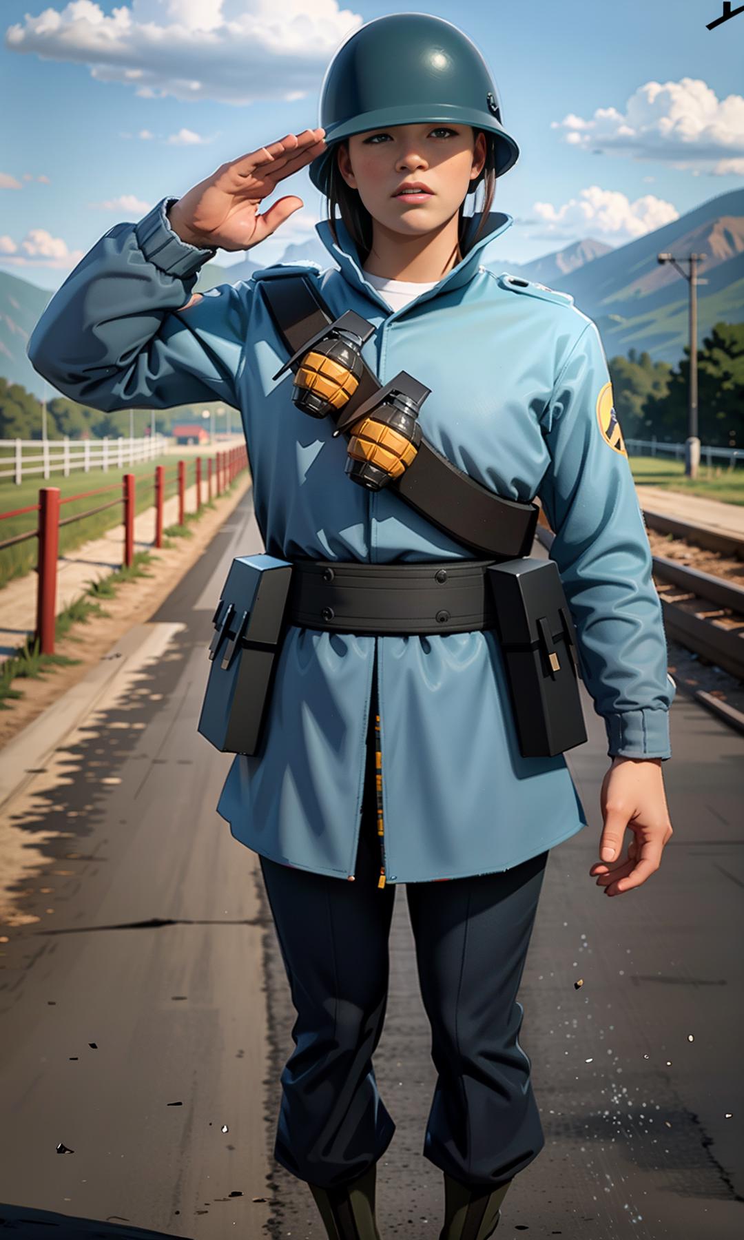 helmet, red/blue jacket, bandolier, two grenades, covered eyes, on prompts can help