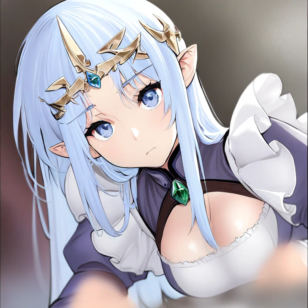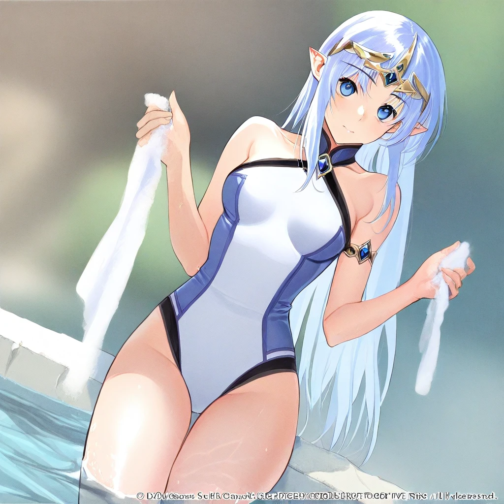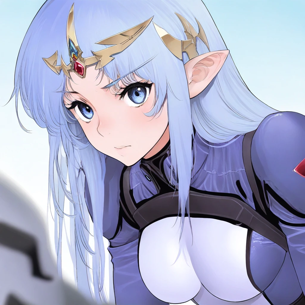 lafiel,blue hair,blue eyes,spacesuit,medium breasts,tiara,gem in forehead,pointy ears