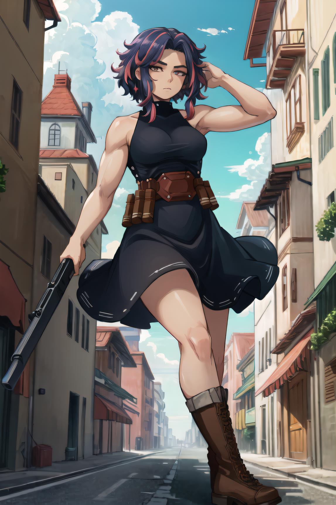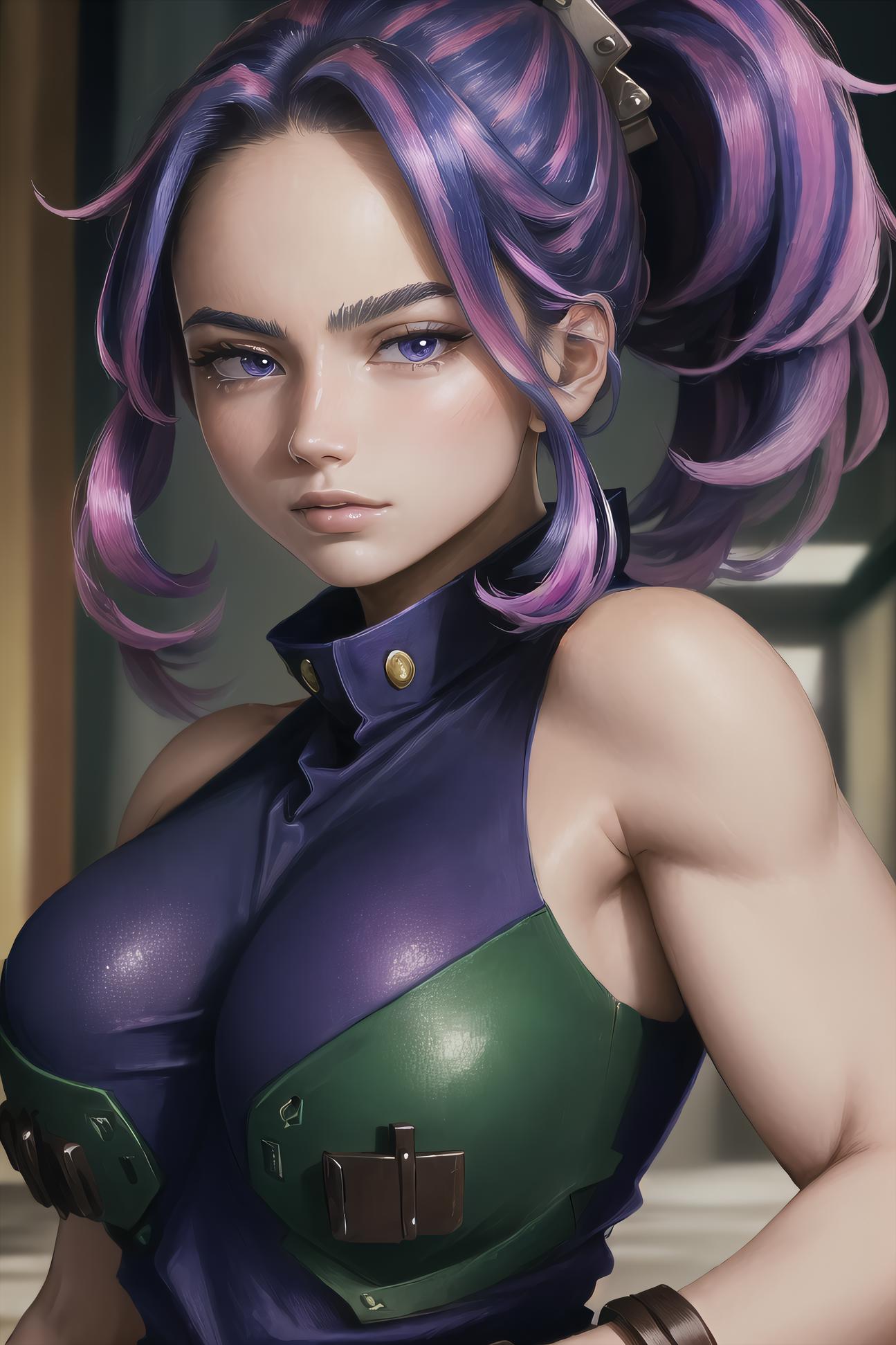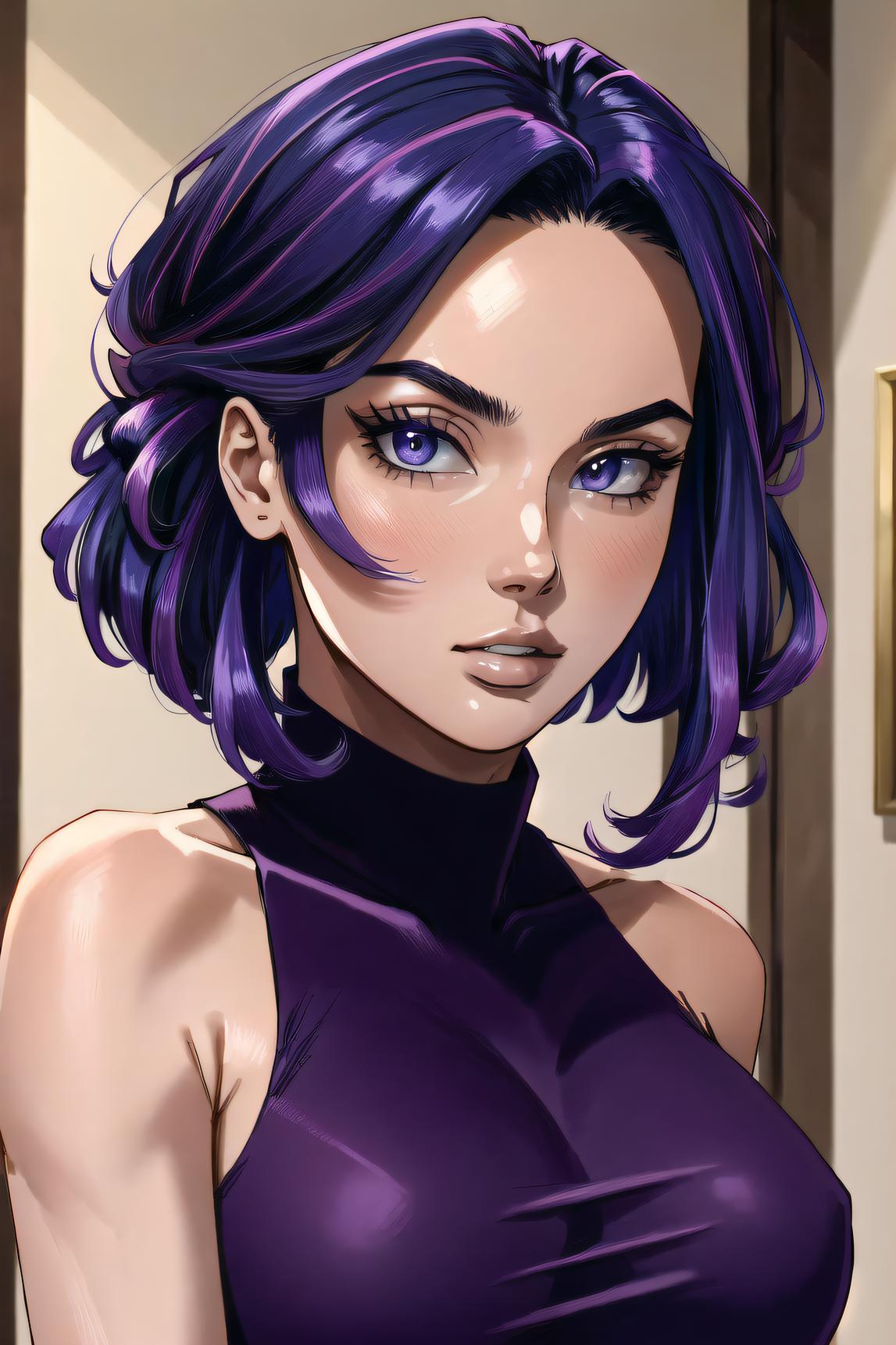 Kaina Tsutsumi version: Kaina, hair ornament, sleeveless, black bodysuit, high ponytail, white pupils, purple eyes, medium breasts, turtleneck, boots.
