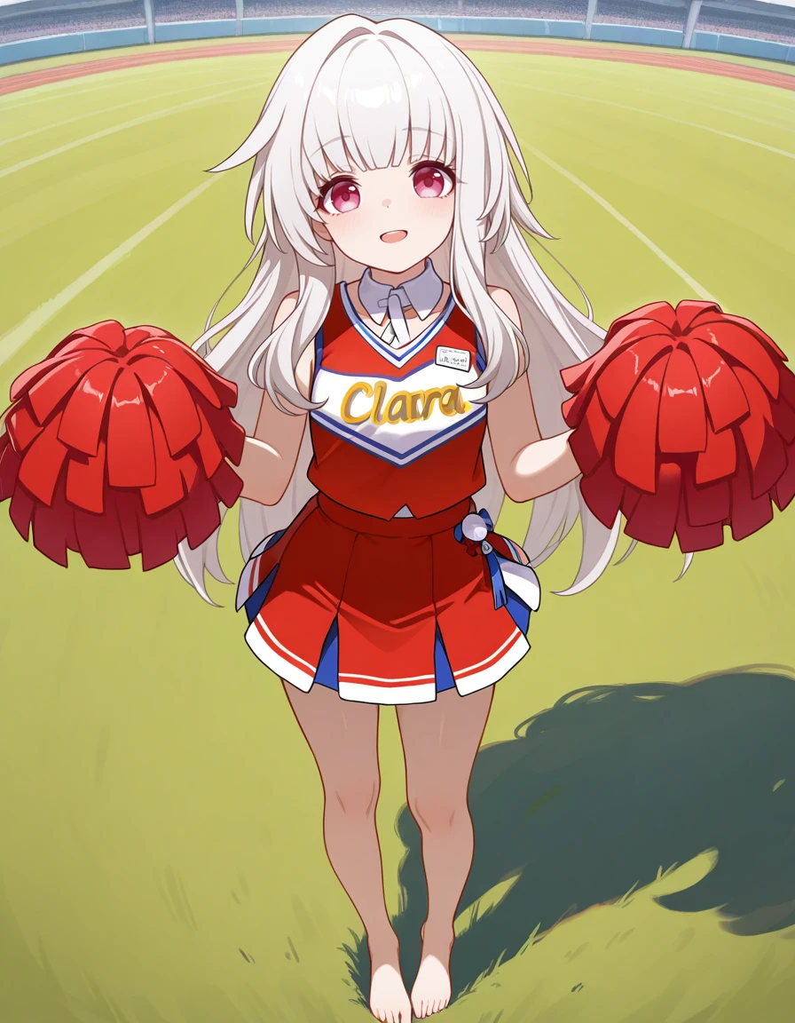 With outfit prompts: clara \(honkai: star rail\), long hair, barefoot, bangs, long sleeves, coat, red jacket, dress, very long hair, bare legs, wide sleeves, jacket, blunt bangs, pom pom (clothes),