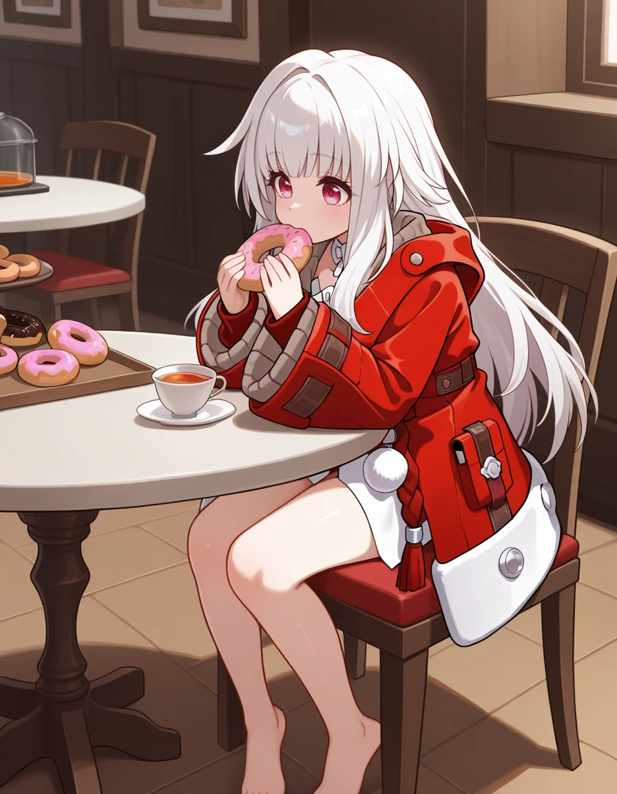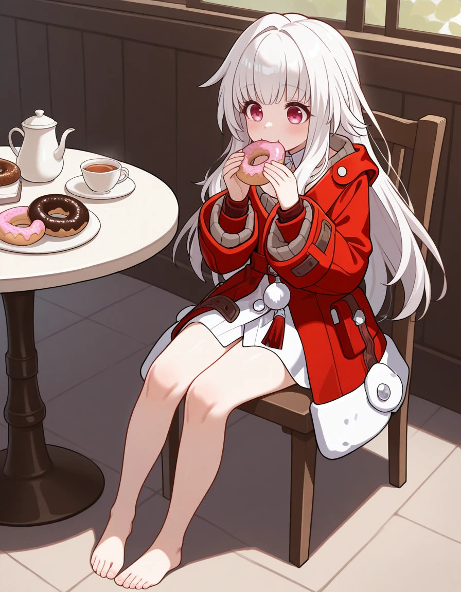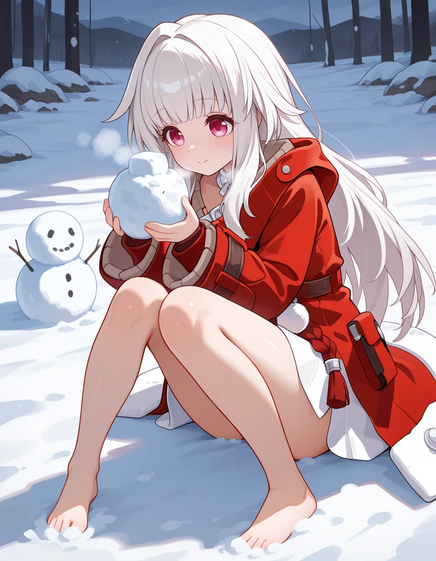 <lora:Clara-IL-V1:1> clara \(honkai: star rail\), long hair, barefoot, bangs, very long hair, bare legs, blunt bangs, long sleeves, coat, red jacket, dress, wide sleeves, jacket, pom pom (clothes),