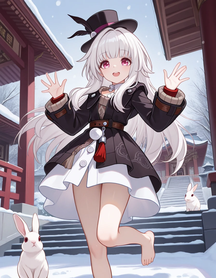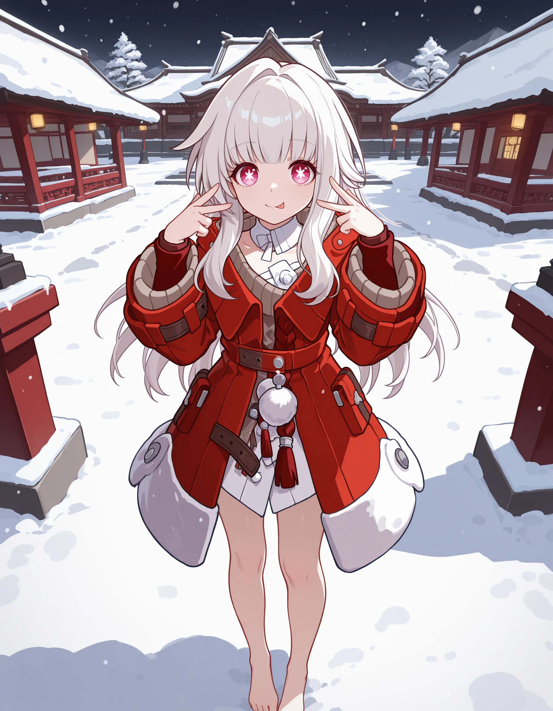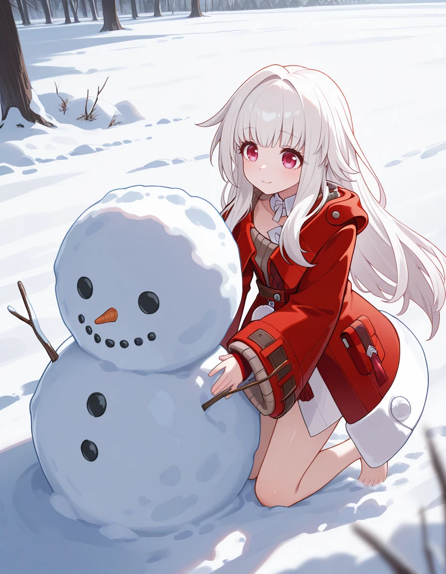 <lora:Clara-IL-V1:1> clara \(honkai: star rail\), long hair, barefoot, bangs, very long hair, bare legs, blunt bangs, long sleeves, coat, red jacket, dress, wide sleeves, jacket, pom pom (clothes),