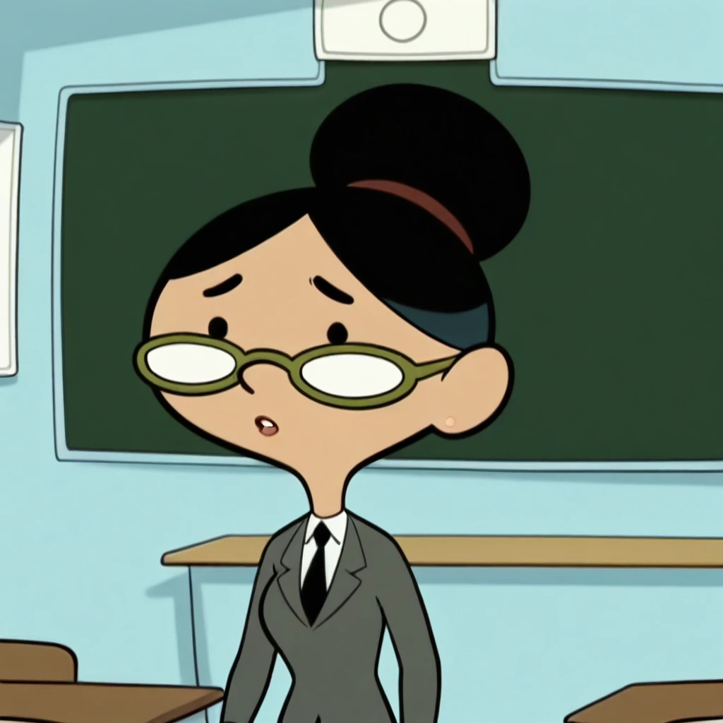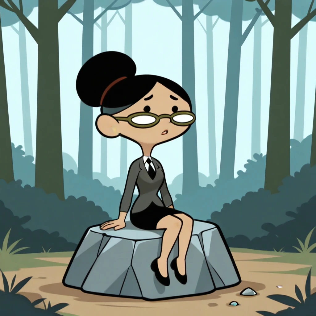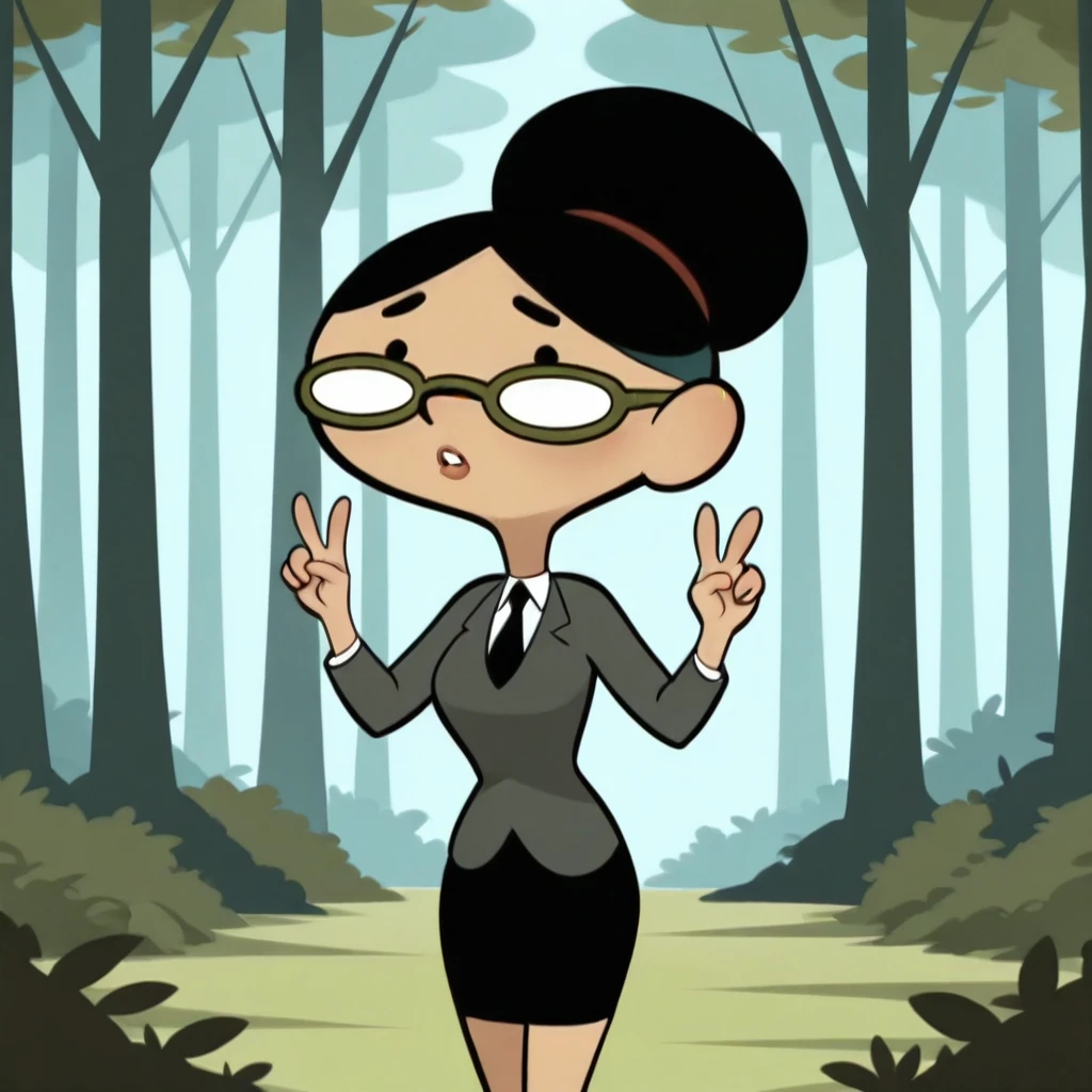 mrswoolingantz, parody, chibi, 1girl, solo, black hair, single hair bun, black eyes, opaque glasses,