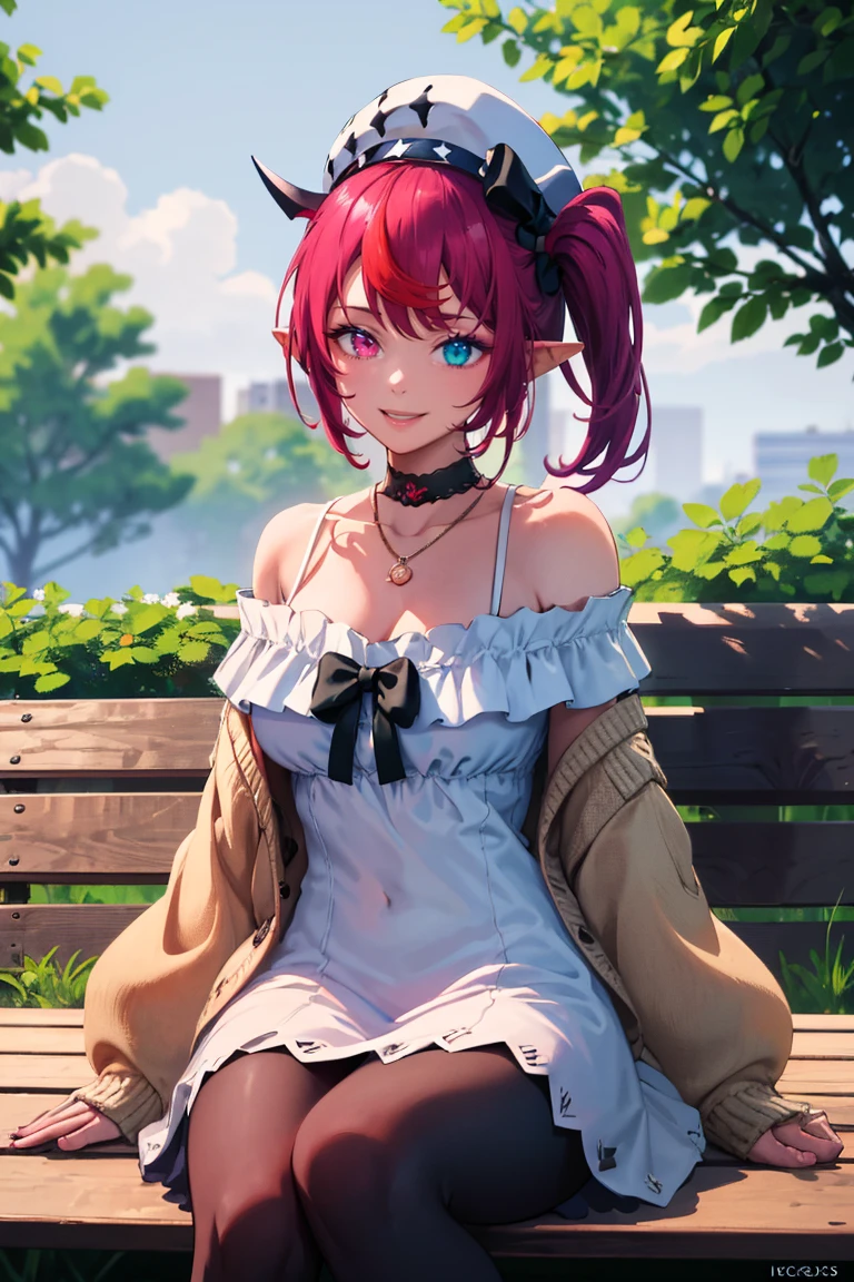IrysCasual, heterochromia, short hair, side ponytail, hat, choker, off-shoulder dress, white dress, black bow, black pantyhose, beige cardiganIdol Uniform: