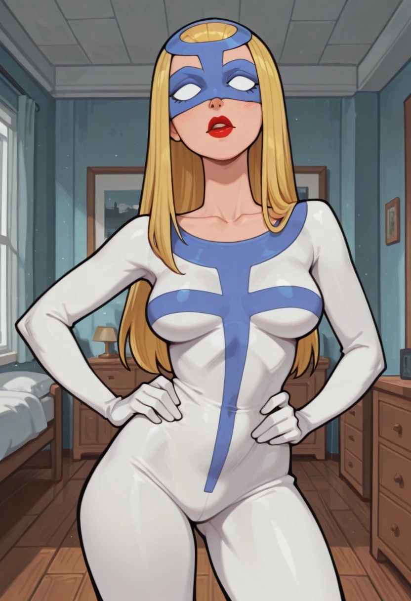 femmepg, 1girl , blonde , blue mask , red lips , , neck bone, multicolor , white and blue , white gloves , white eyes