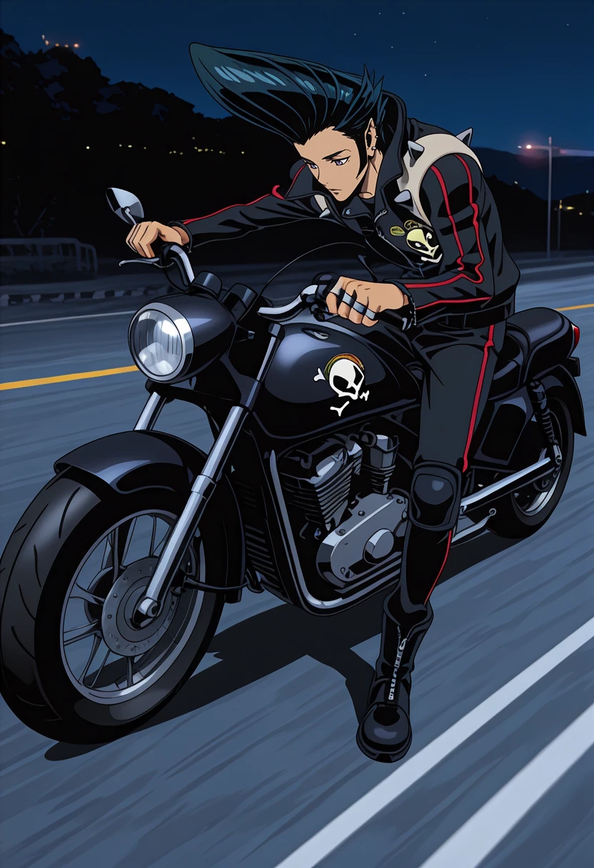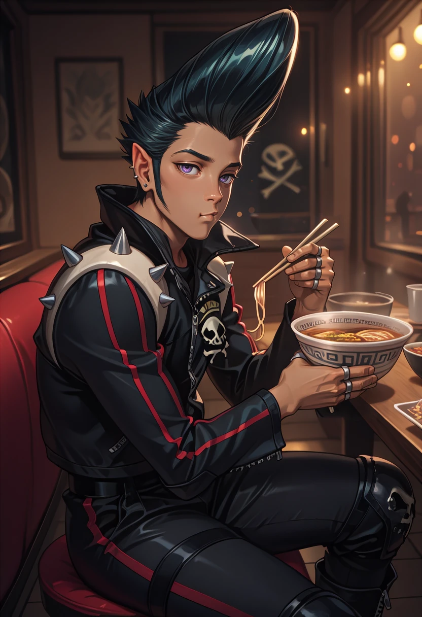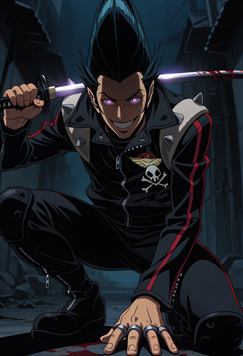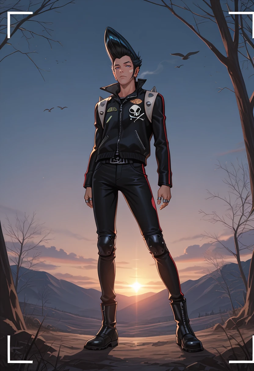 Jr3dl1n3, purple eyes, black hair, pompadour, sideburns, stud earrings, ear piercing, pointy ears, spiked hair, black leather jacket, high collar, long sleeves, shoulder spikes, red trim, skull print, black leather pants, knee pads, zipper pull tab, belt, silver ring, multiple rings, patch, black boots,anime screenshot,