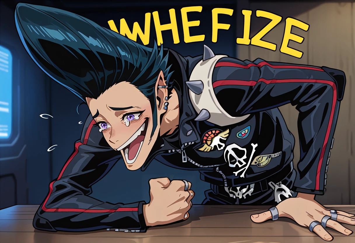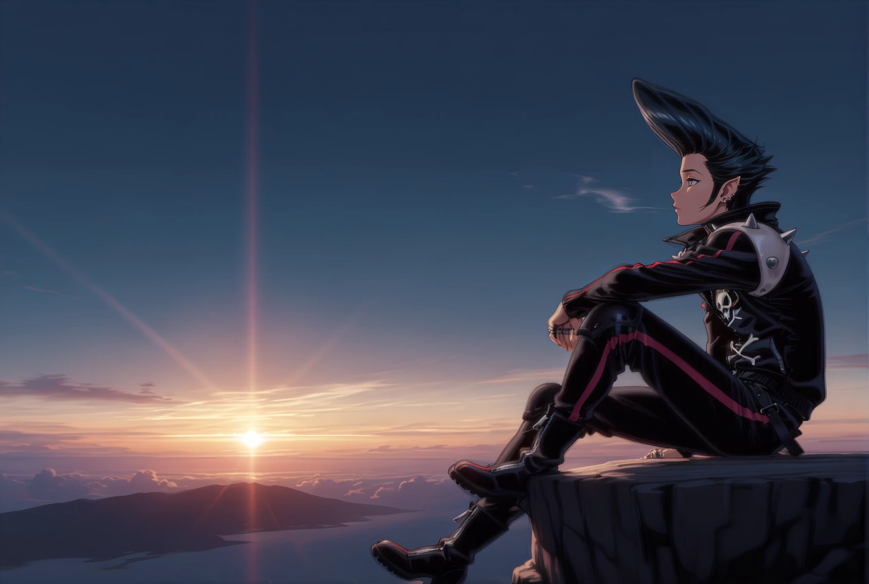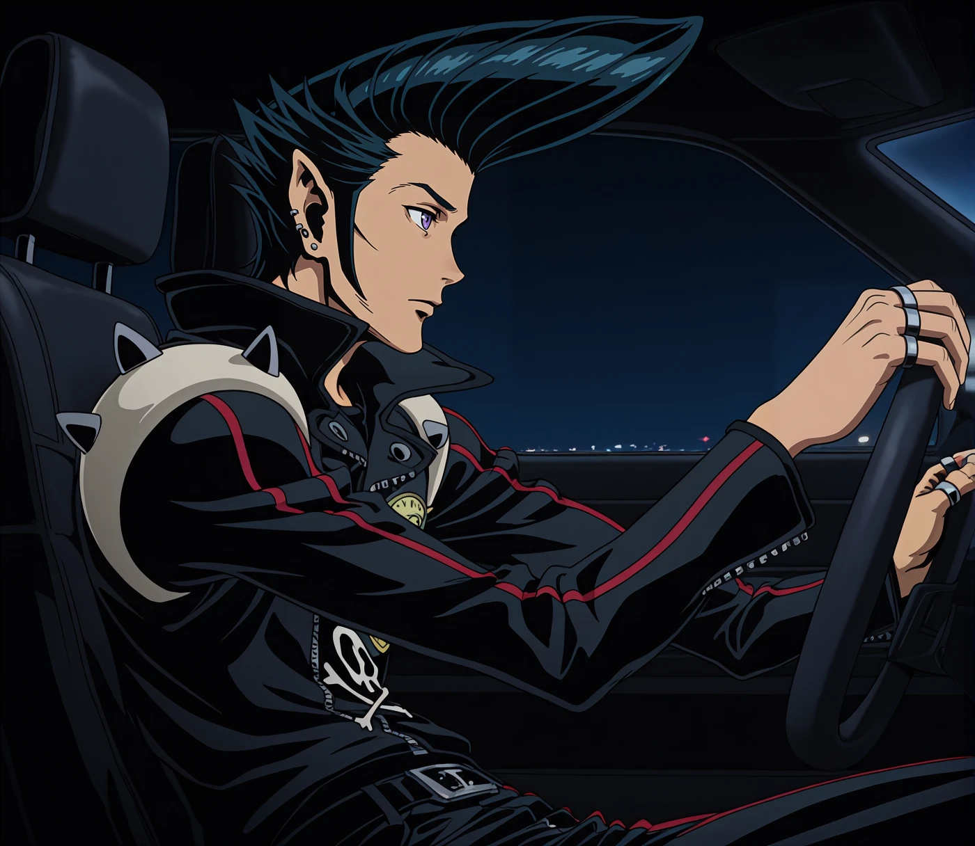 Jr3dl1n3, purple eyes, black hair, pompadour, sideburns, stud earrings, ear piercing, pointy ears, spiked hair, black leather jacket, high collar, long sleeves, shoulder spikes, red trim, skull print, black leather pants, knee pads, zipper pull tab, belt, silver ring, multiple rings, patch, black boots,anime screenshot,