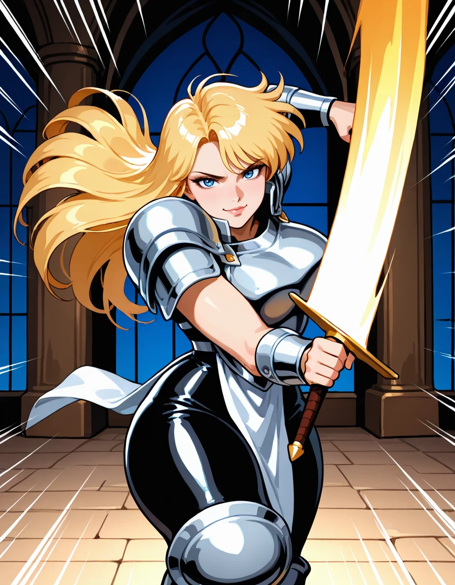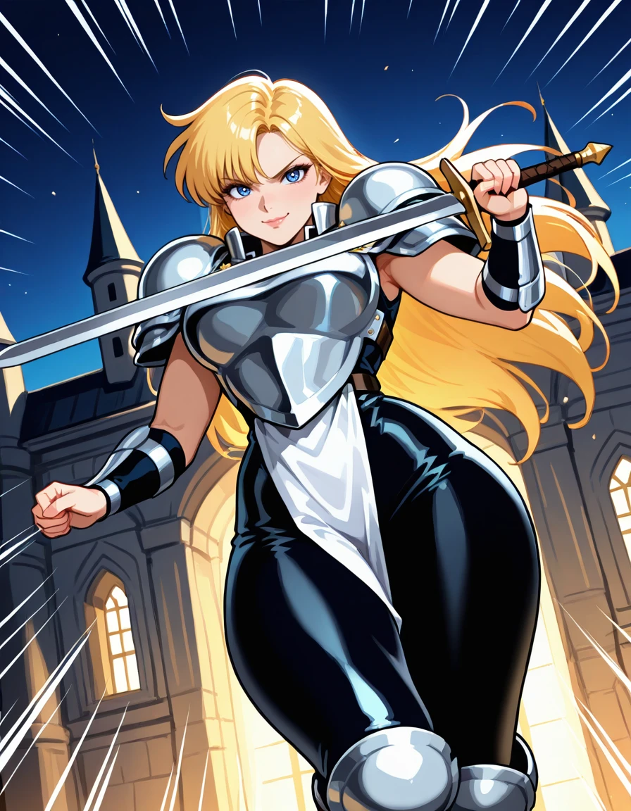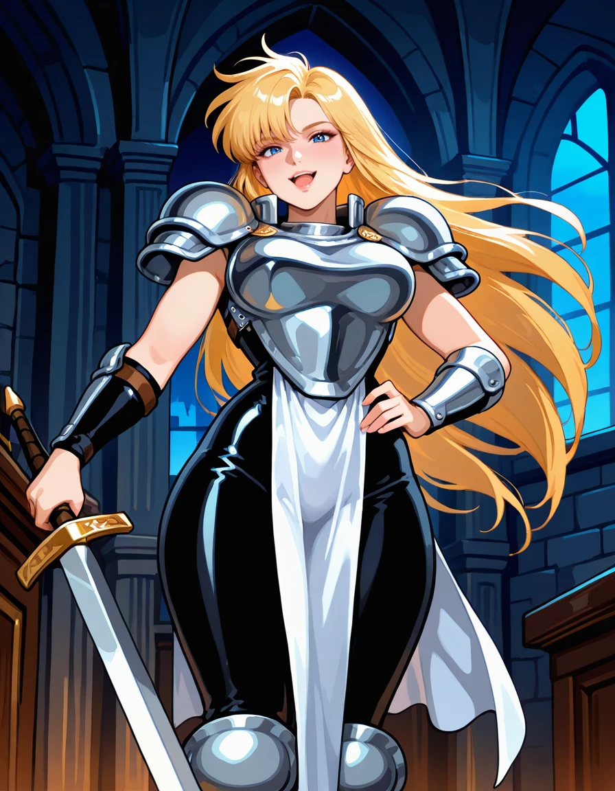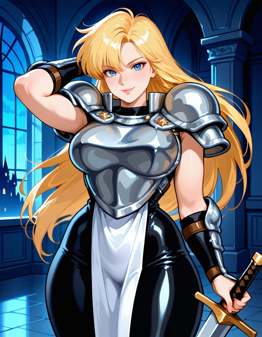 (retro artstyle:0.8), (jeanne-darc, blue eyes, blonde hair, long hair, bangs, lips, large breasts, wide hips, thick thighs), (armored dress, boobplate, shoulder armor, bare arms, arm guards, pelvic curtain, skin tight, knee armor, armored boots), (holding sword)