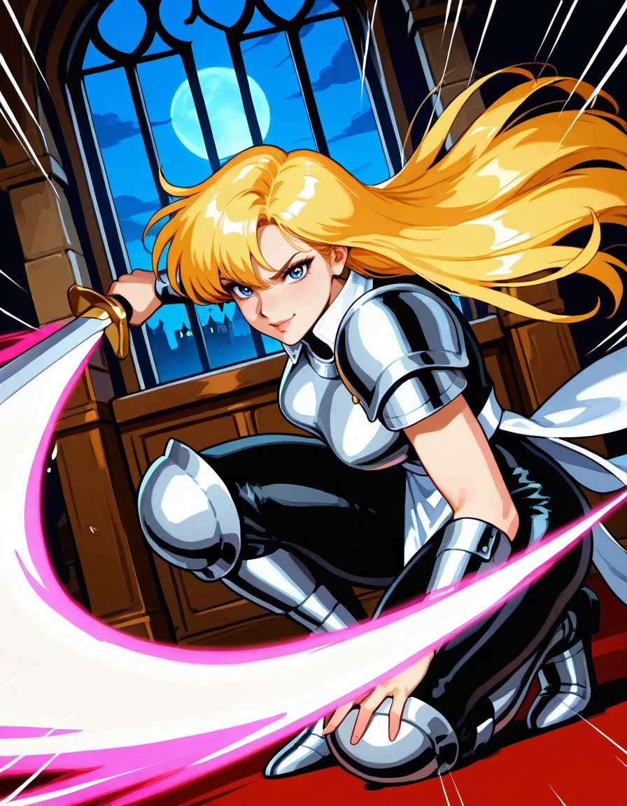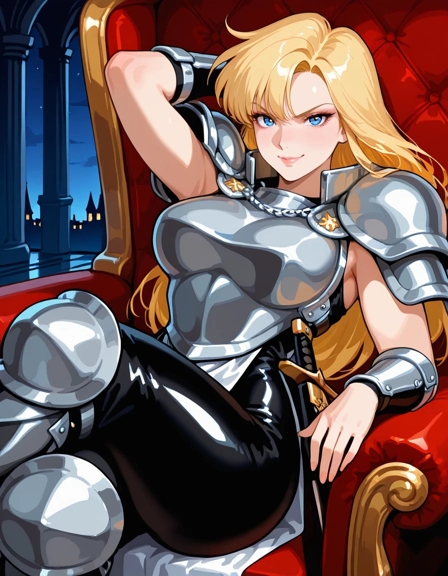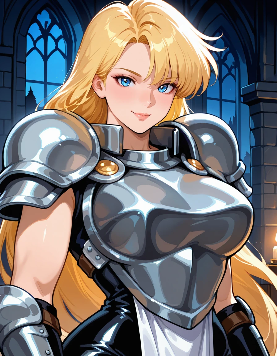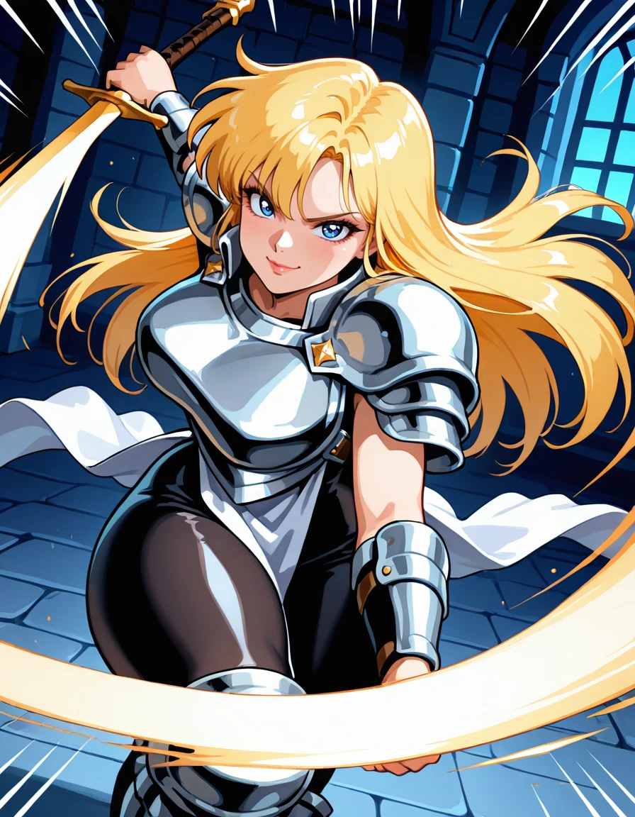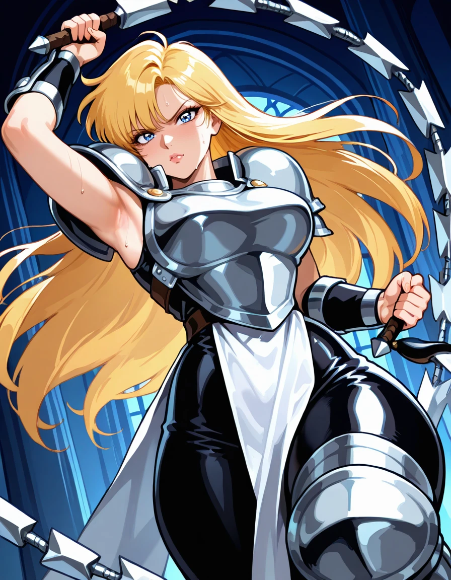 (retro artstyle:0.8), (jeanne-darc, blue eyes, blonde hair, long hair, bangs, lips, large breasts, wide hips, thick thighs), (armored dress, boobplate, shoulder armor, bare arms, arm guards, pelvic curtain, skin tight, knee armor, armored boots), (holding sword)