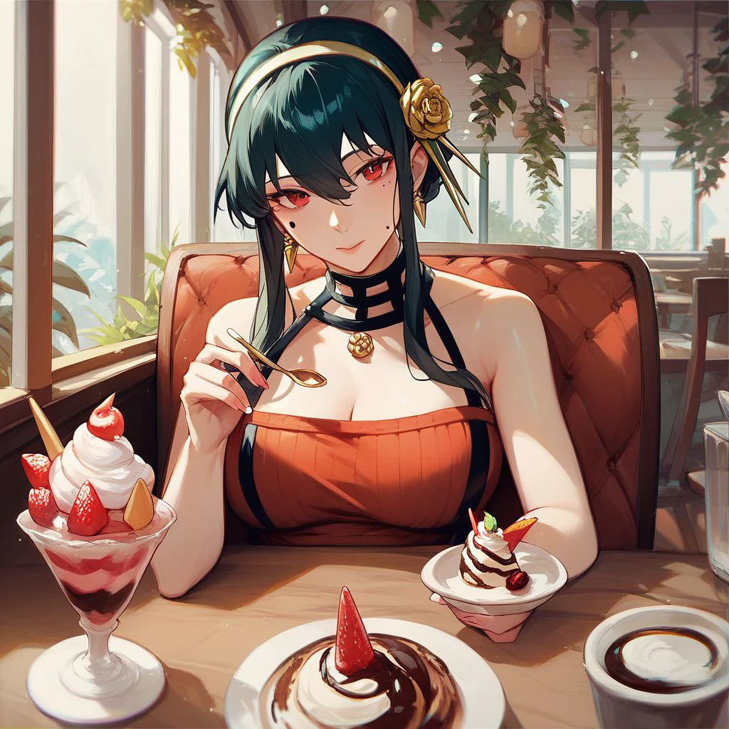 score_9, score_8_up, score_7_up, rating_explicit, CONCEPT_PovDating_ownwaifu, 1girl, yor_briar, spoon, looking at viewer, food, pov across table, mole under eye, cup, ice cream, sitting, parfait, restaurant, chair, cafe, coffee, sundae, pov dating,