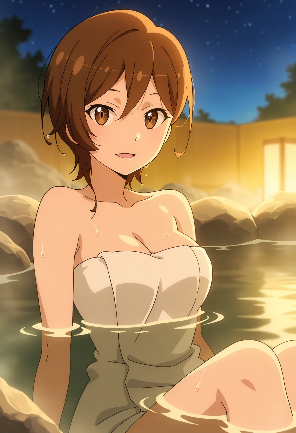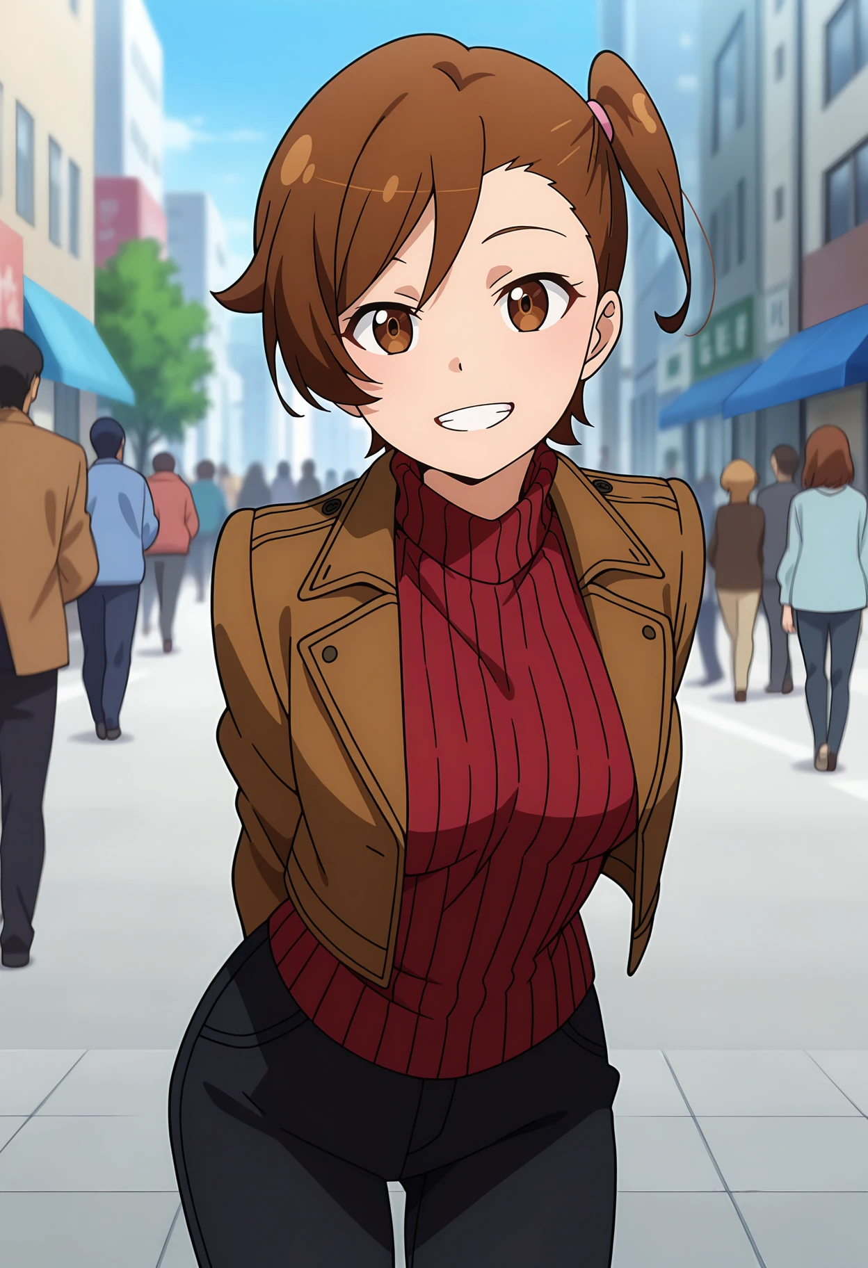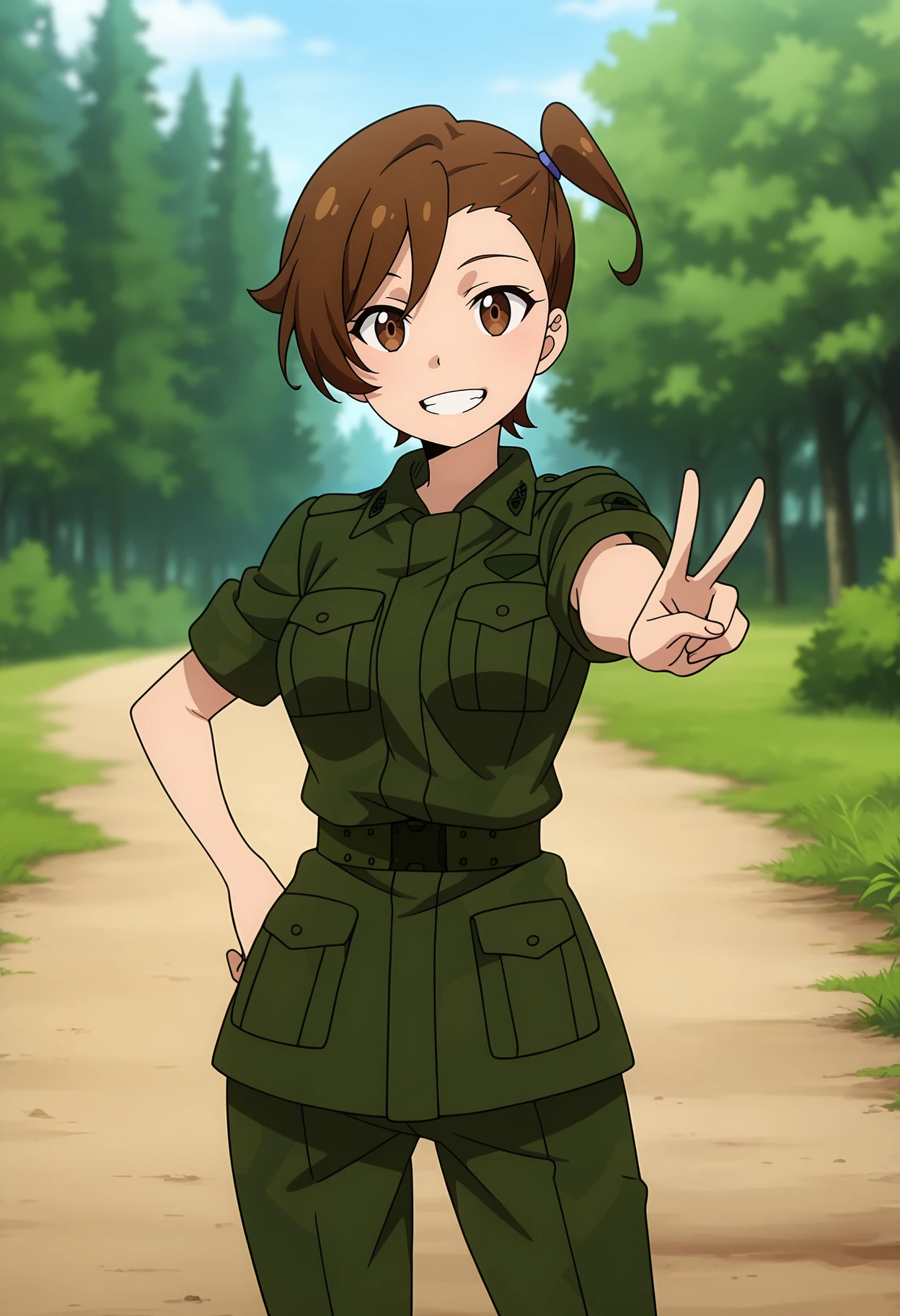 short hair, brown hair, brown eyes, side ponytail, hair tie