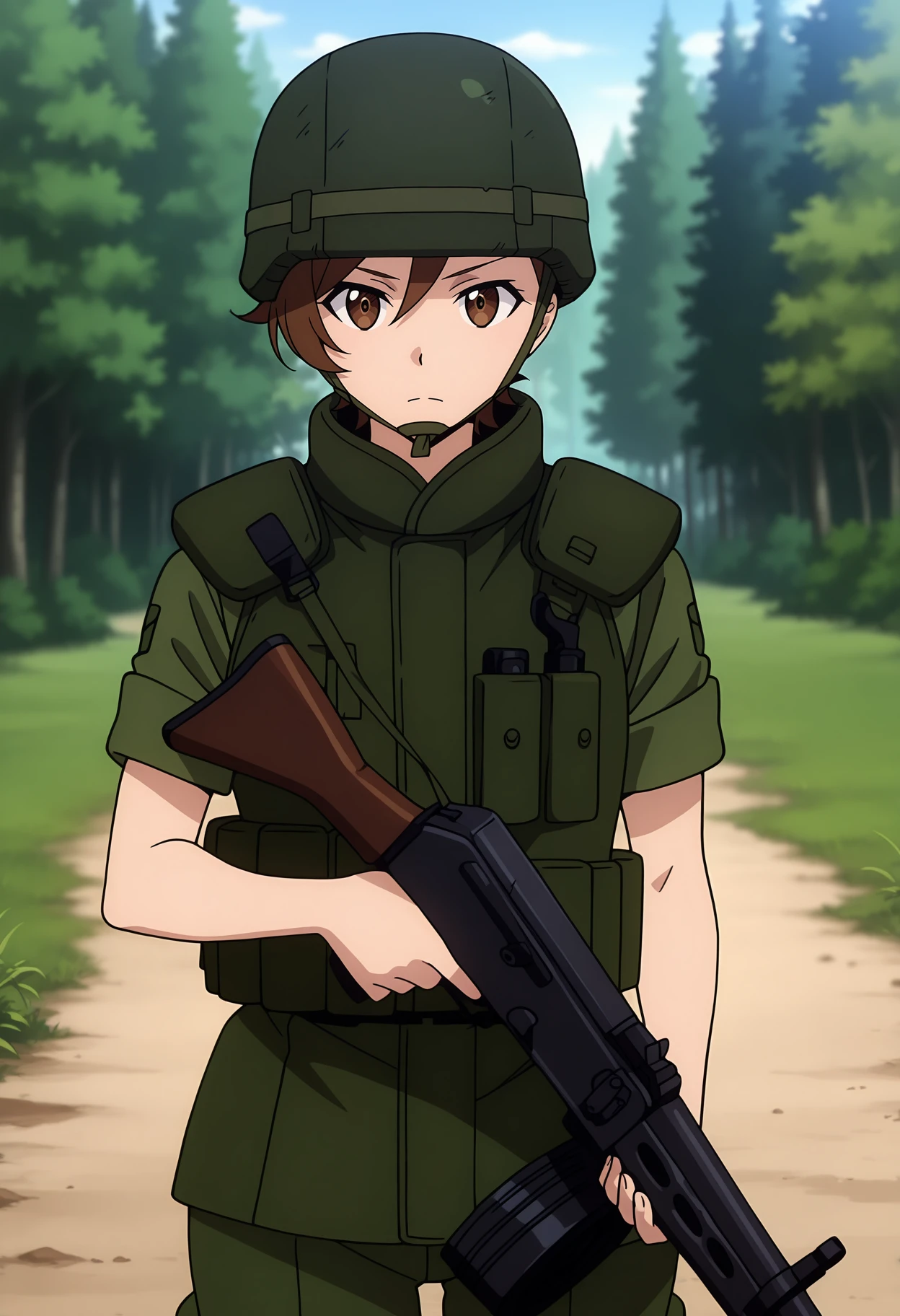 combat helmet, chin strap, military uniform, green shirt, short sleeves, body armor, green pants
