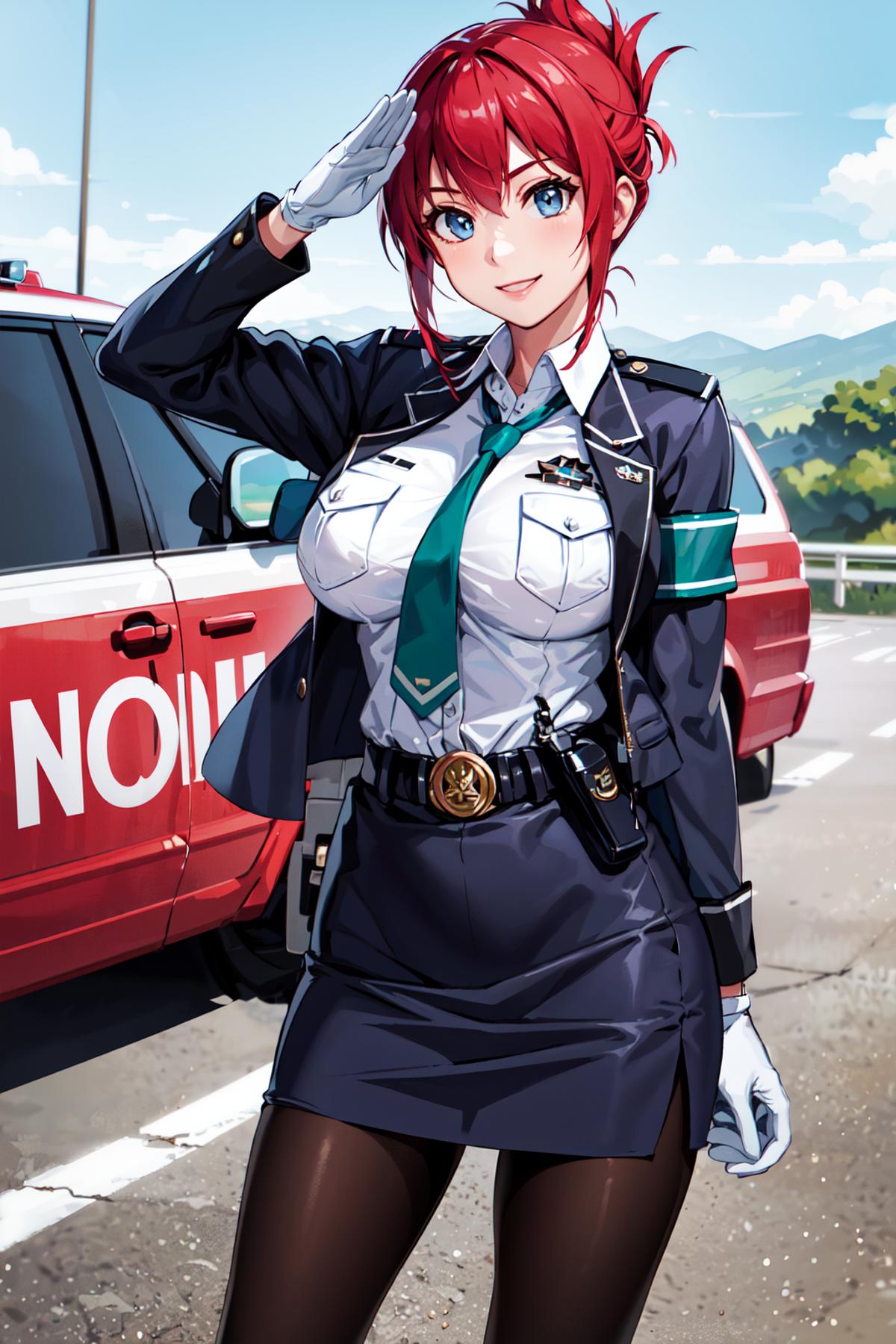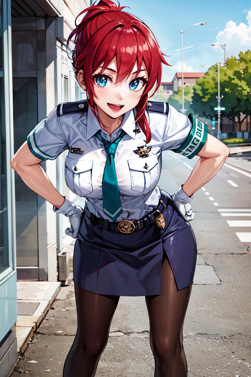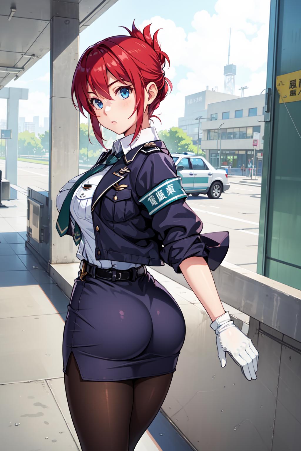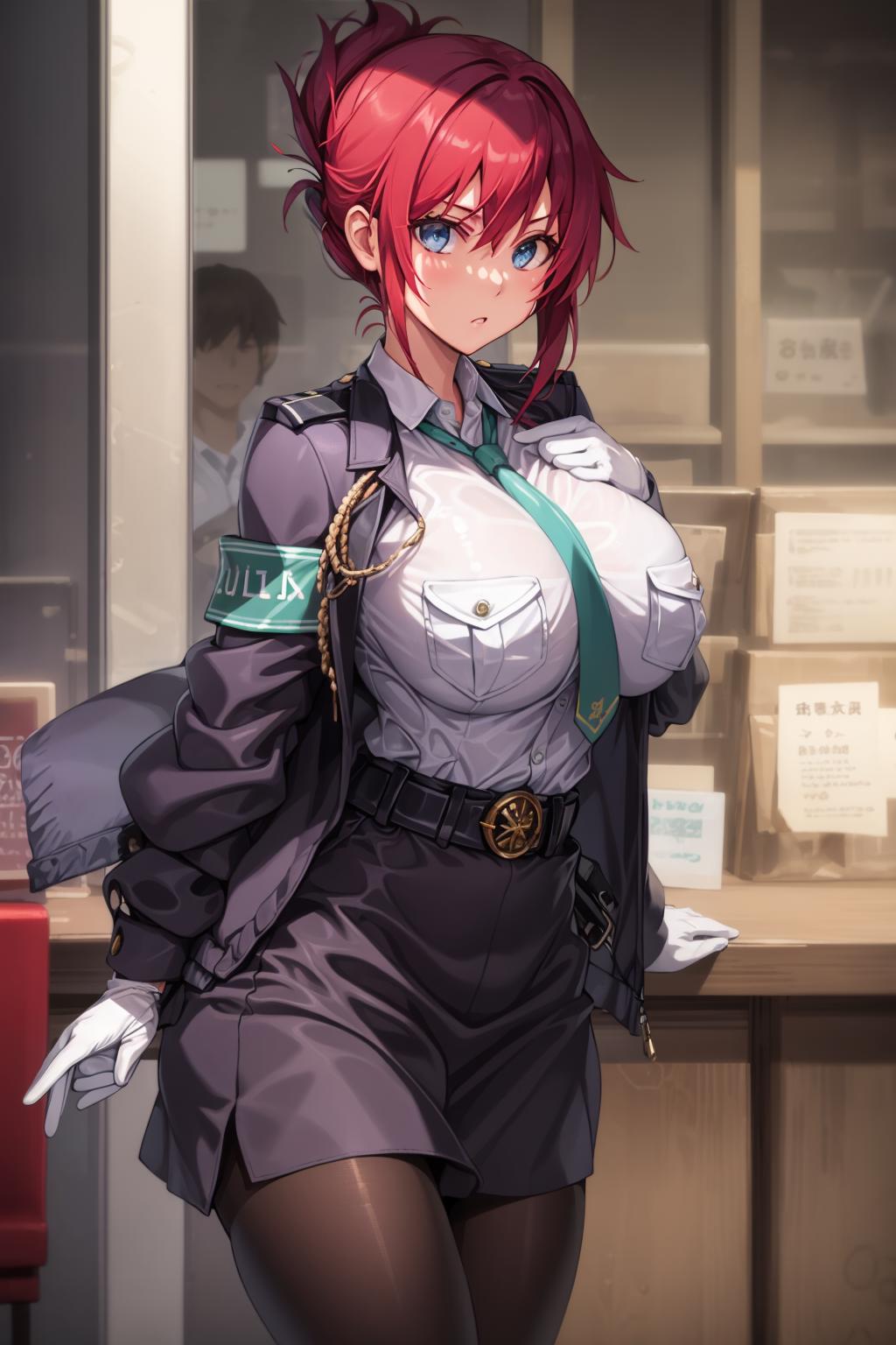 aoi1, 1girl, solo, red hair, folded ponytail, blue eyes, skirt, necktie, white gloves, police uniform, belt, black pantyhose, jacket, armband, large breasts