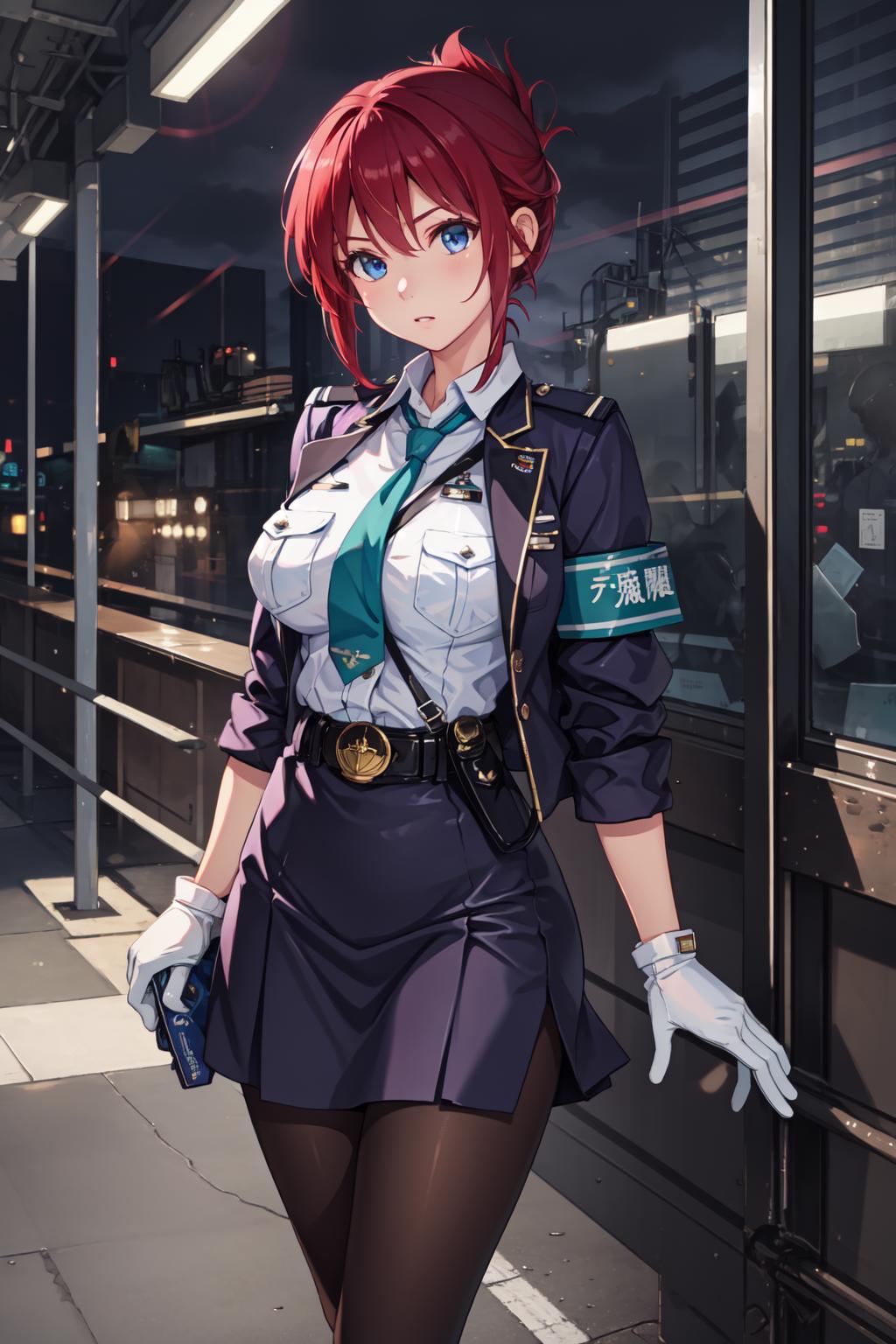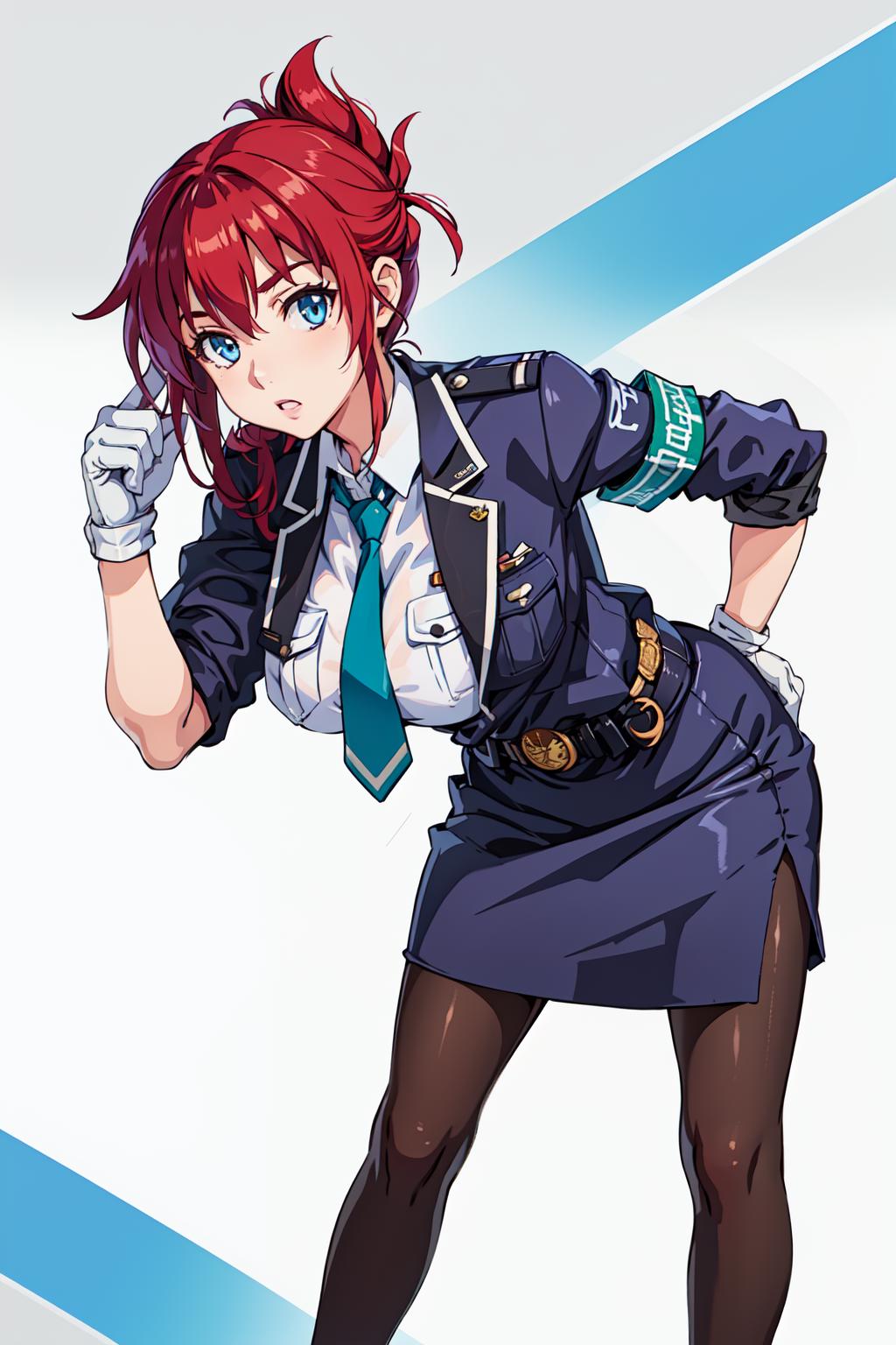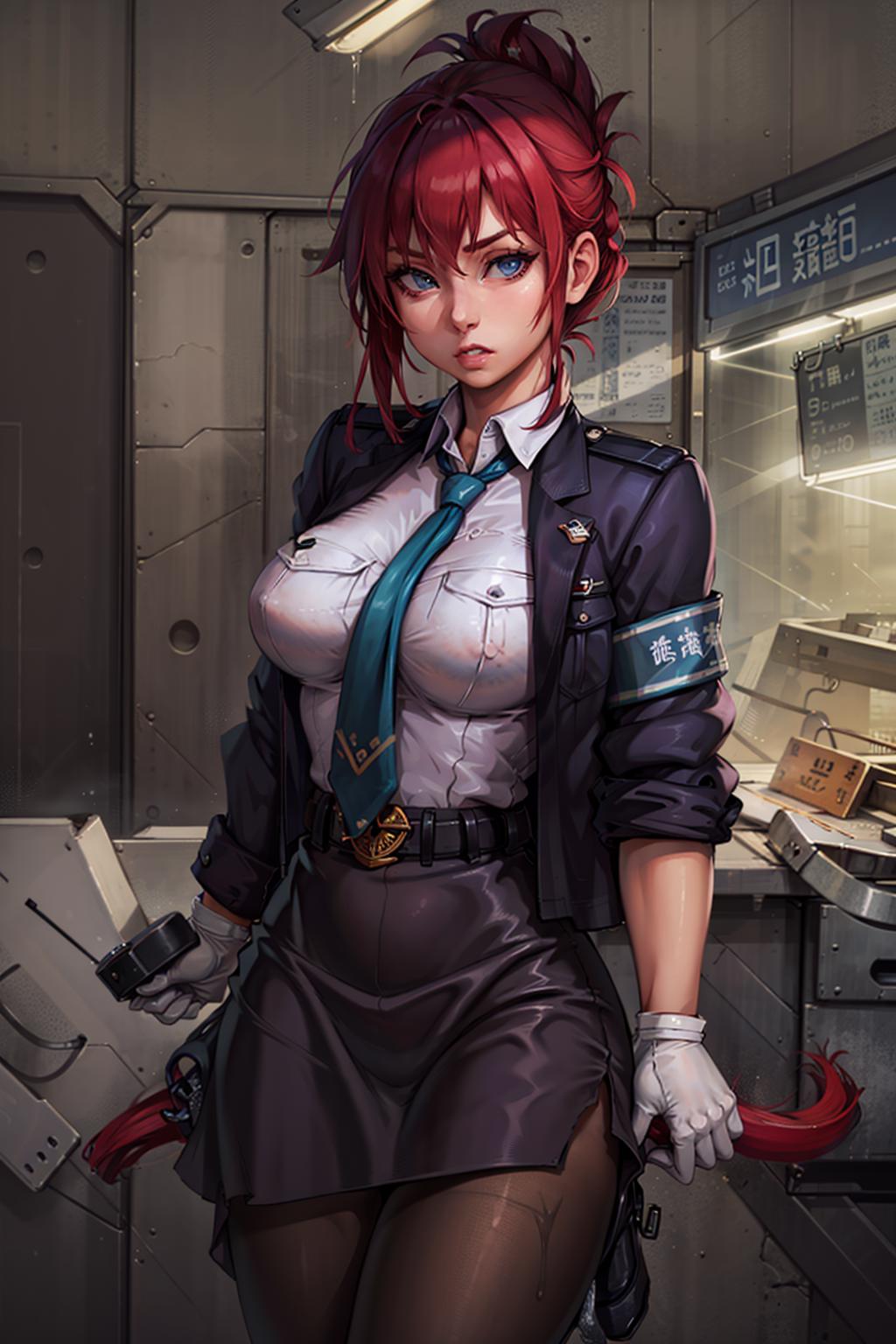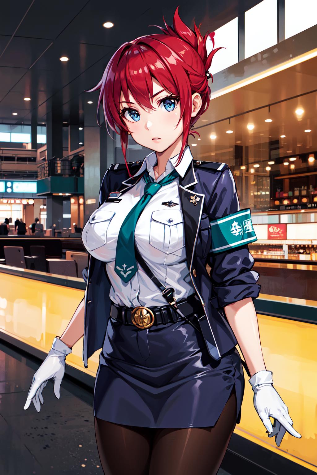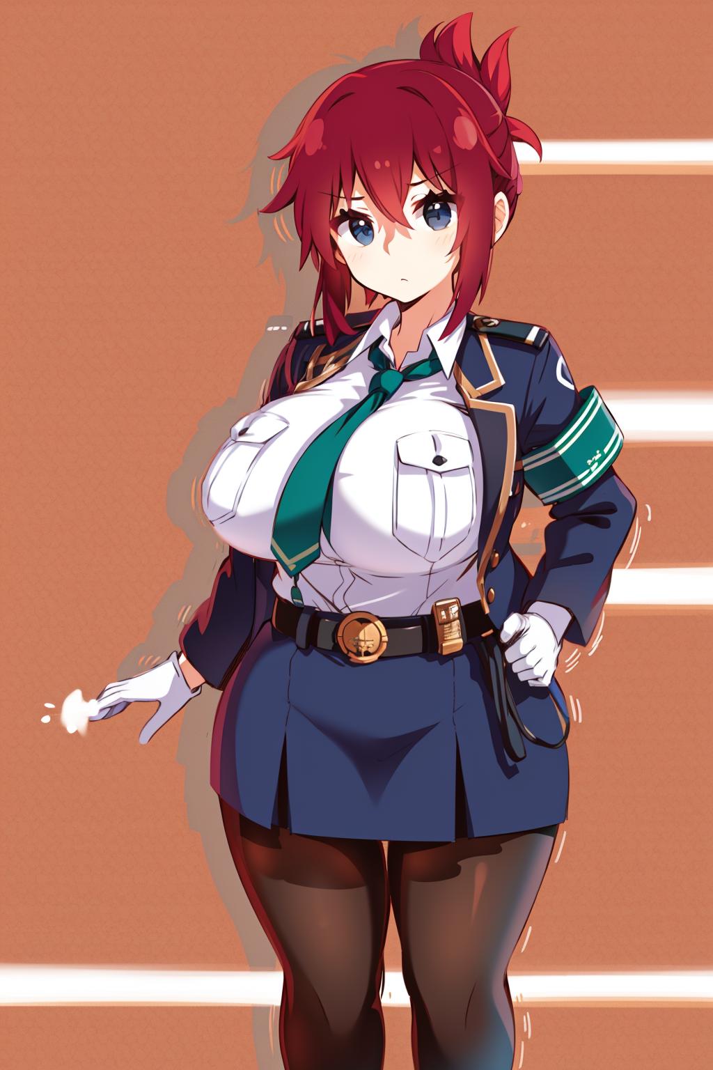 aoi1, 1girl, solo, red hair, folded ponytail, blue eyes, skirt, necktie, white gloves, police uniform, belt, black pantyhose, jacket, armband, large breasts