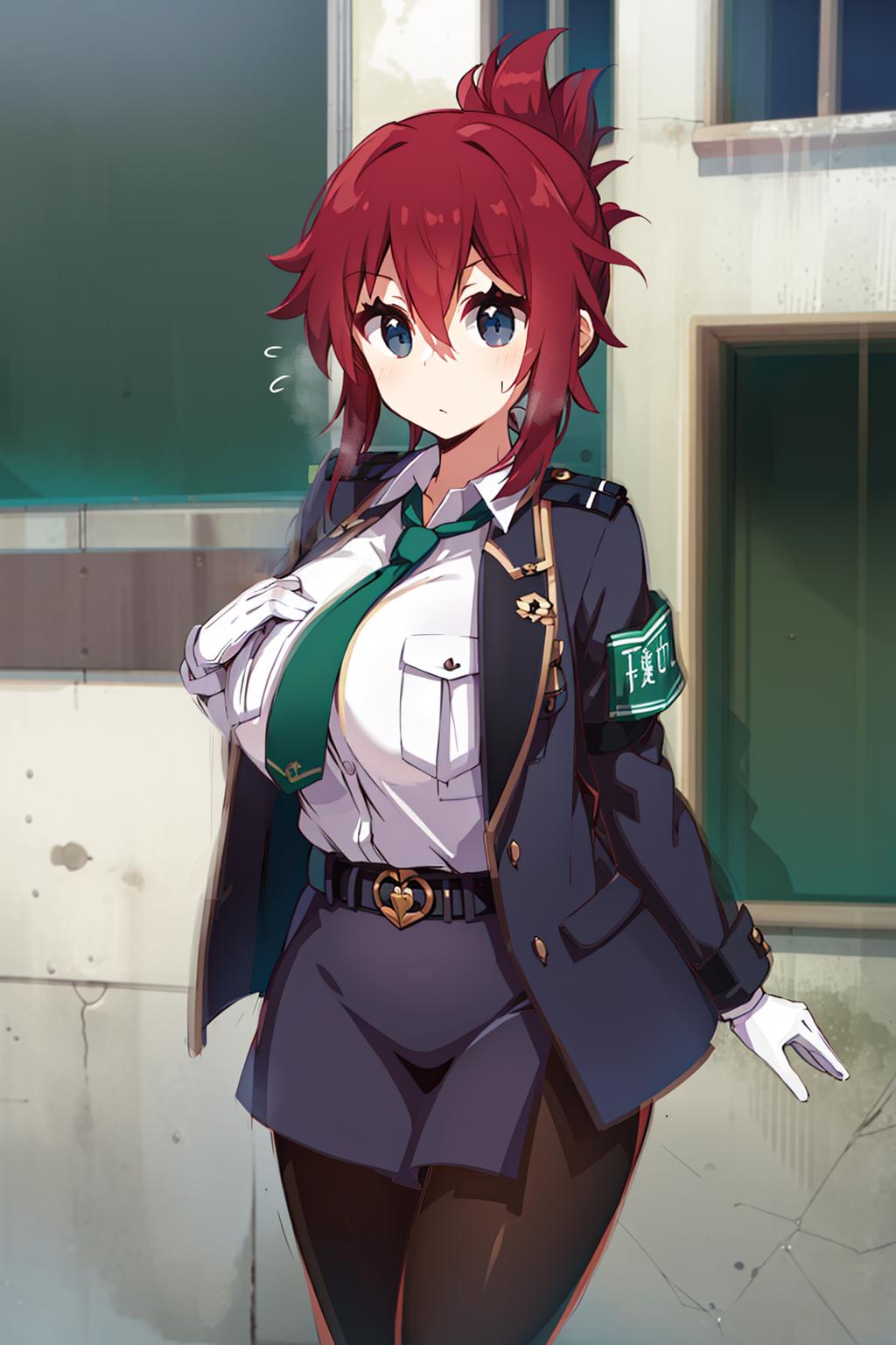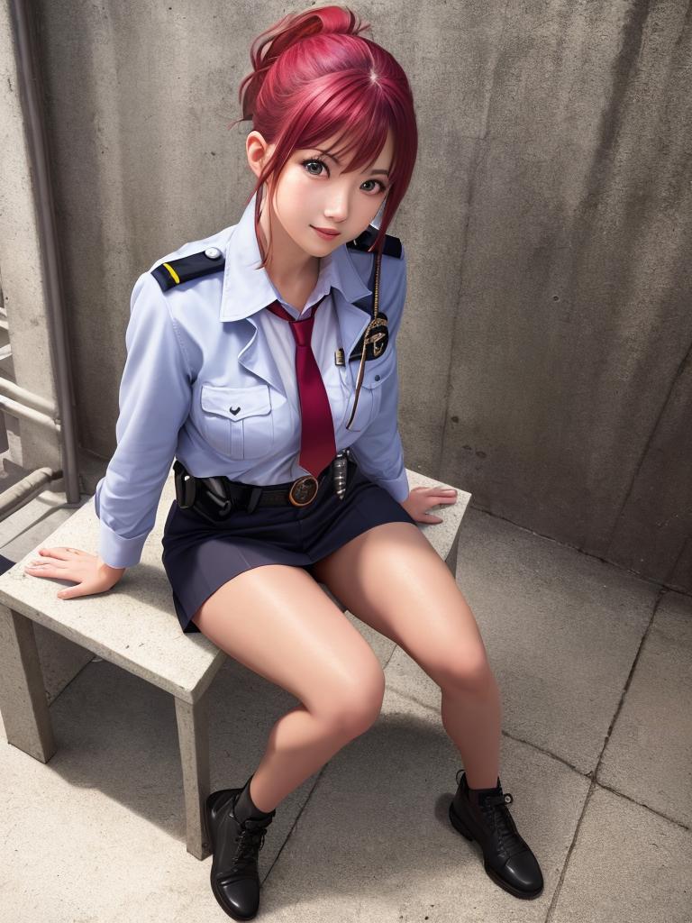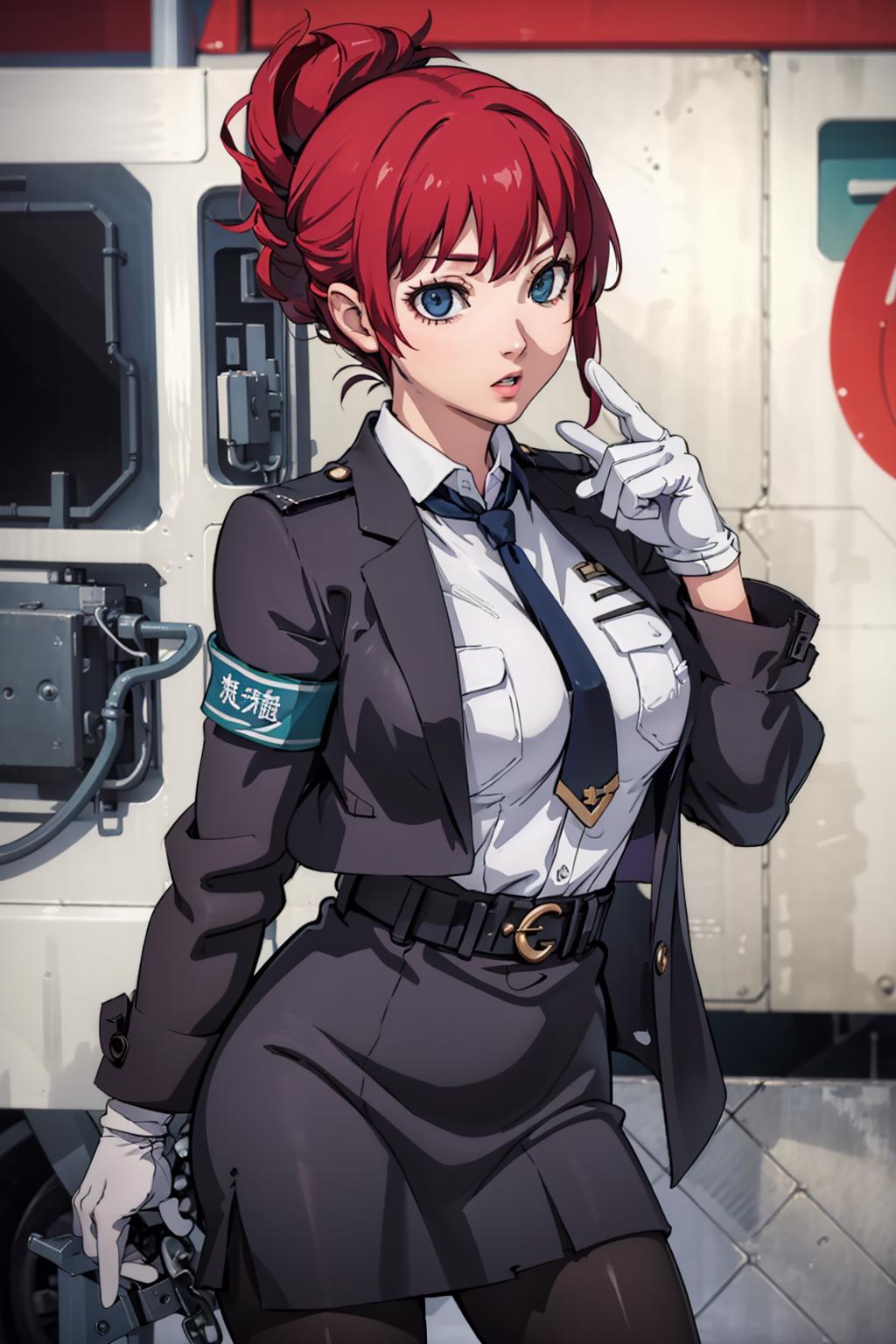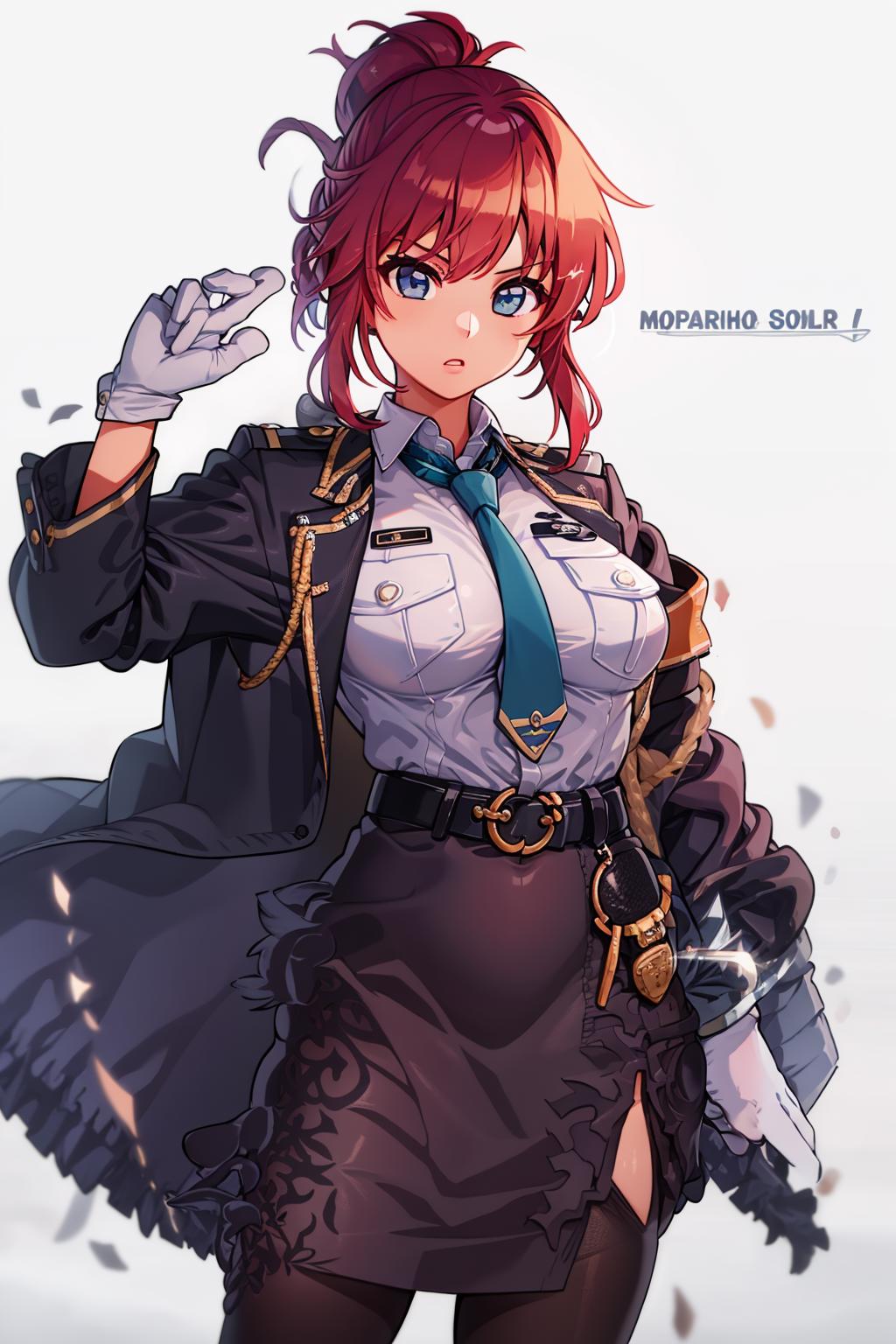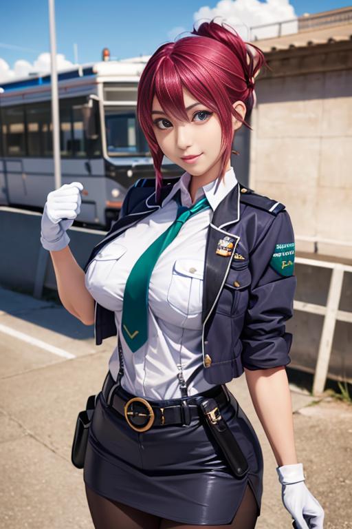 aoi1, 1girl, solo, red hair, folded ponytail, blue eyes, skirt, necktie, white gloves, police uniform, belt, black pantyhose, jacket, armband, large breasts