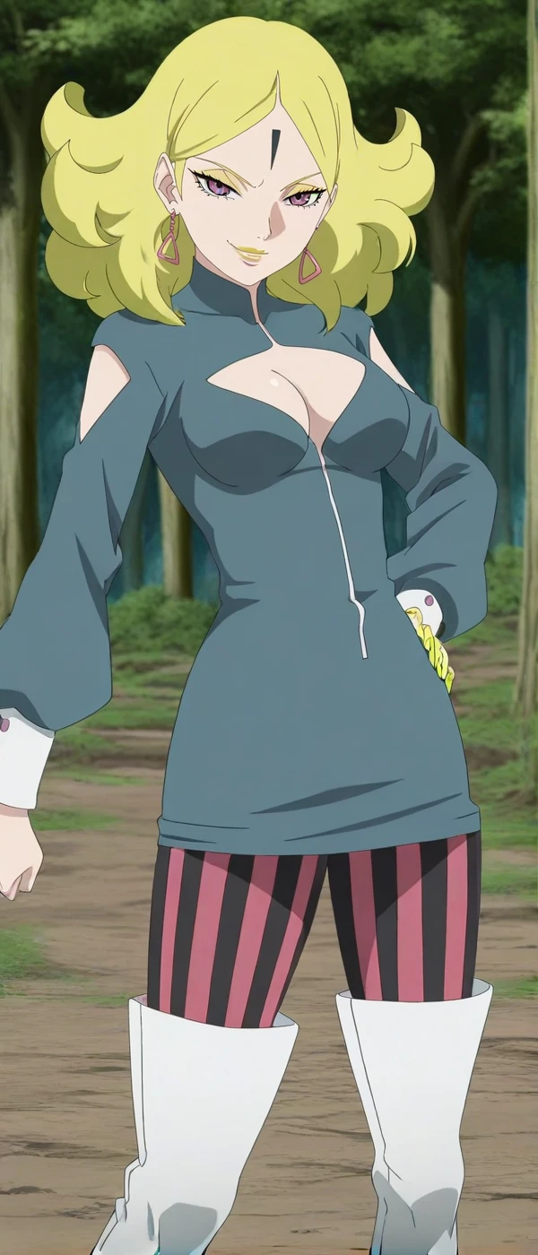 black cloak, thigh boots, boots, cape, clothing cutout, striped pantyhose, cleavage, anime coloring