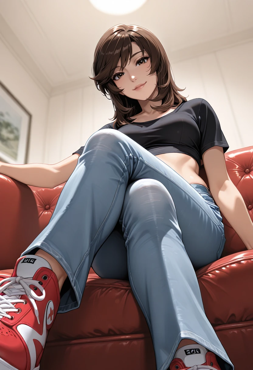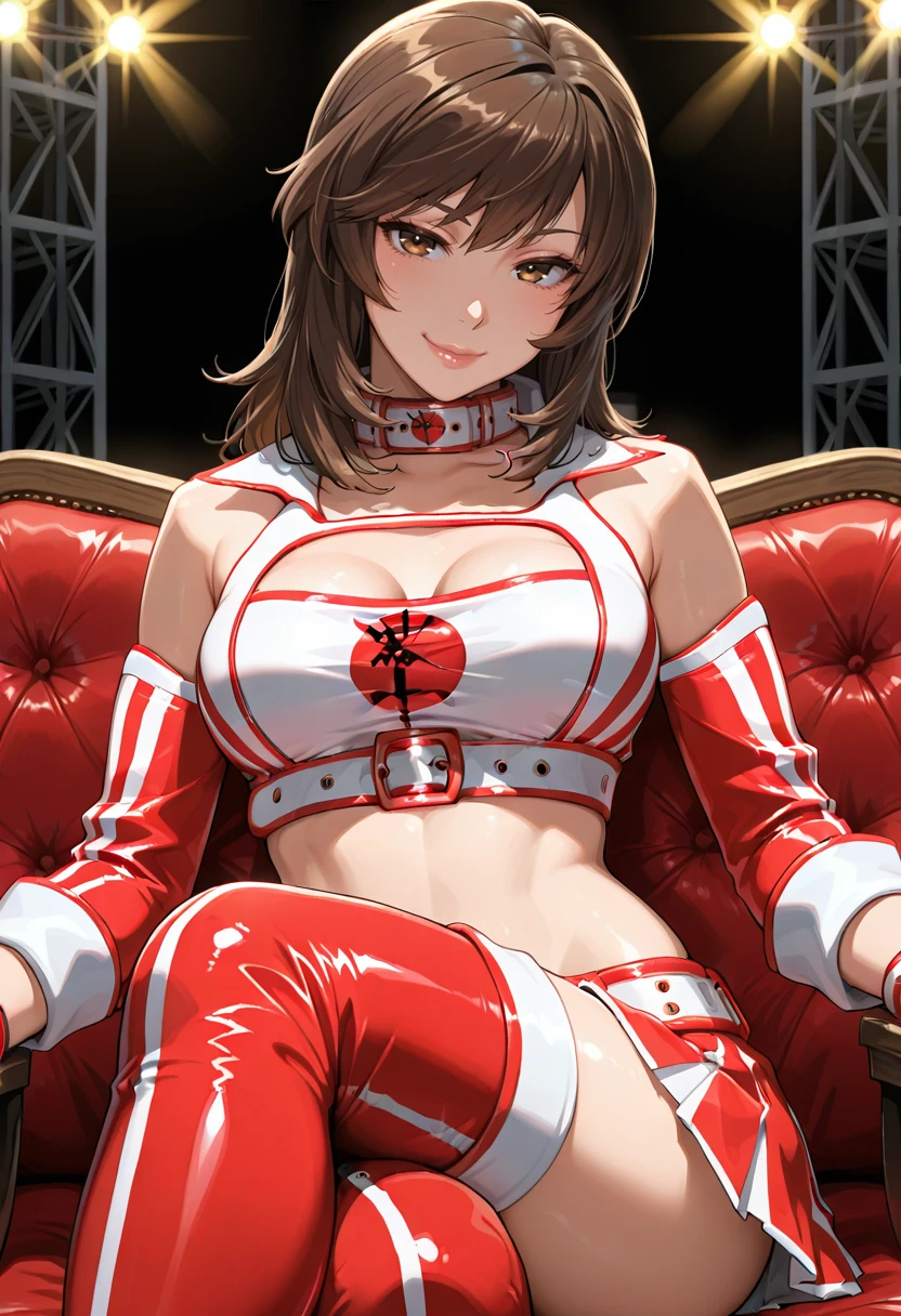"SUP3REI, brown hair, medium hair, brown eyes, lips, collar, sleeveless collared crop top, detached sleeves, cleavage cutout, chest belt, skirt, belt, thighhighs, sneakers"